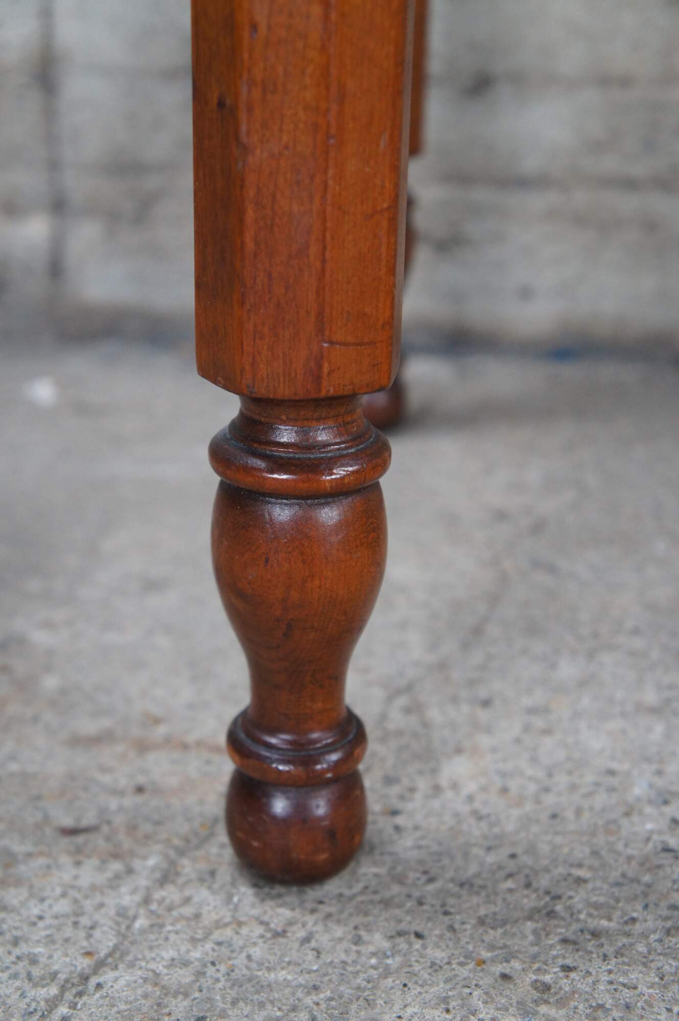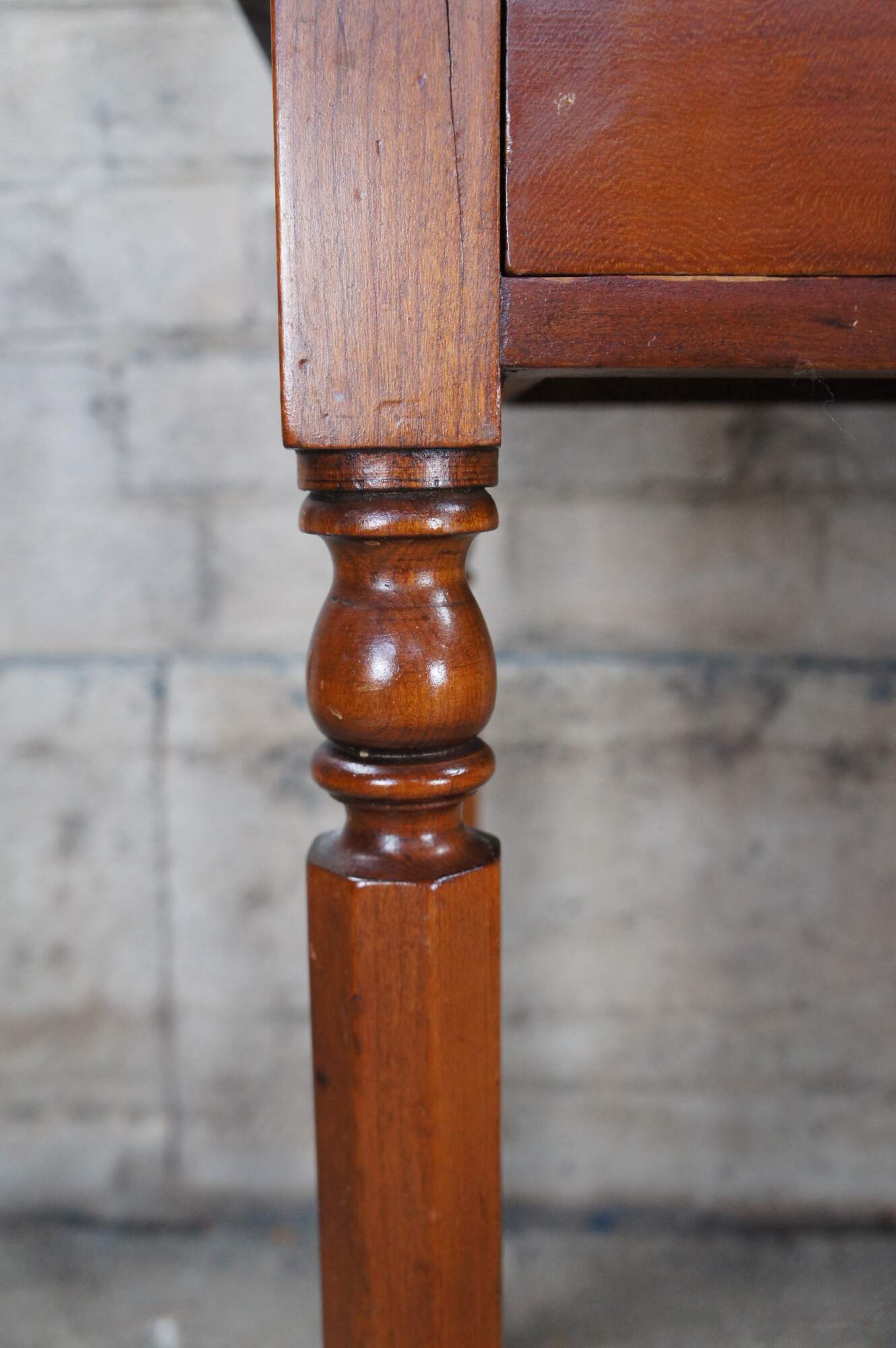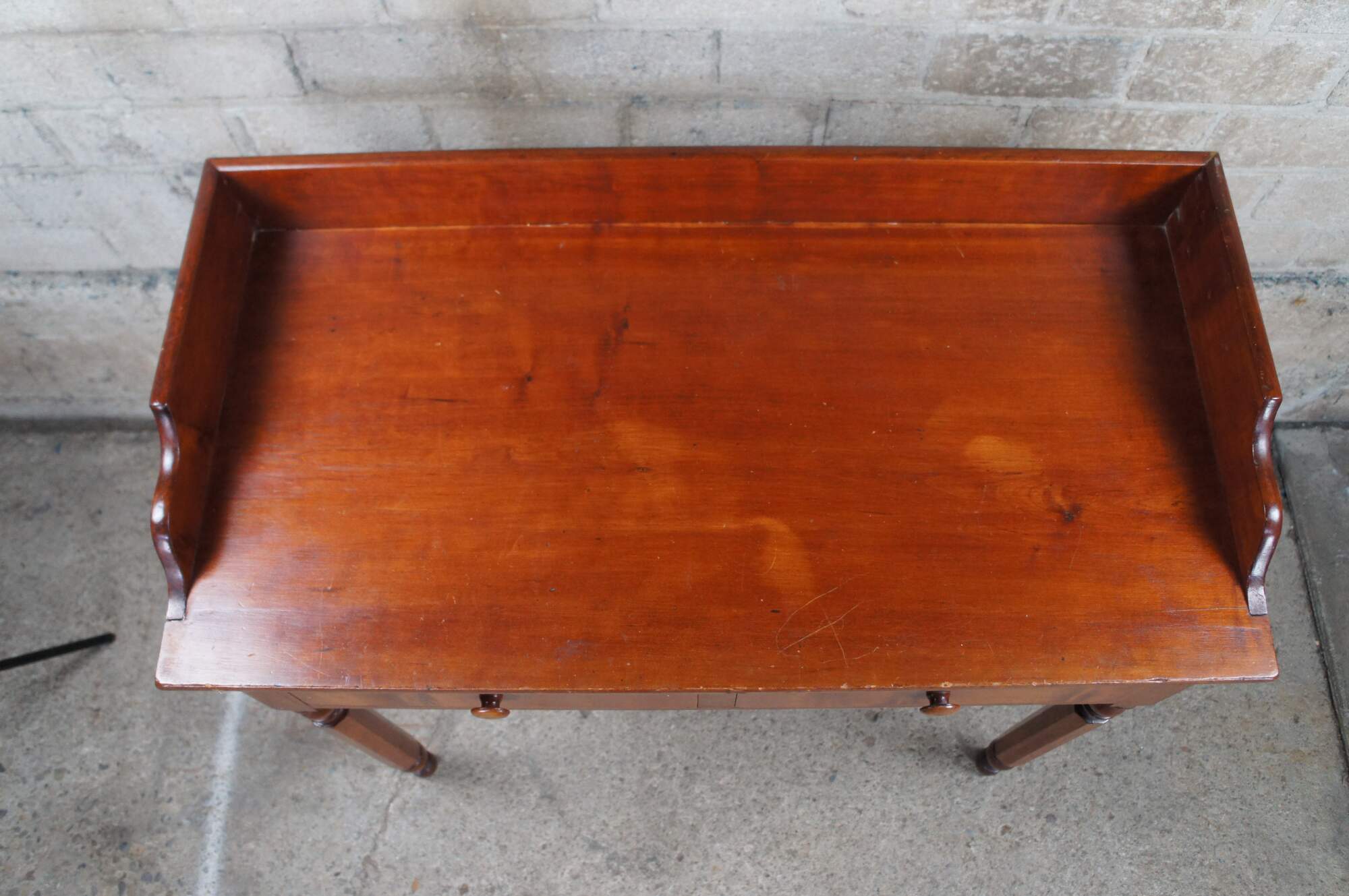 Antique Early American Sheraton / Regency period farmhouse washstand / writing desk / or console table. Made of cherry featuring tall gallery backsplash with serpentine accents over two drawers and turned legs.