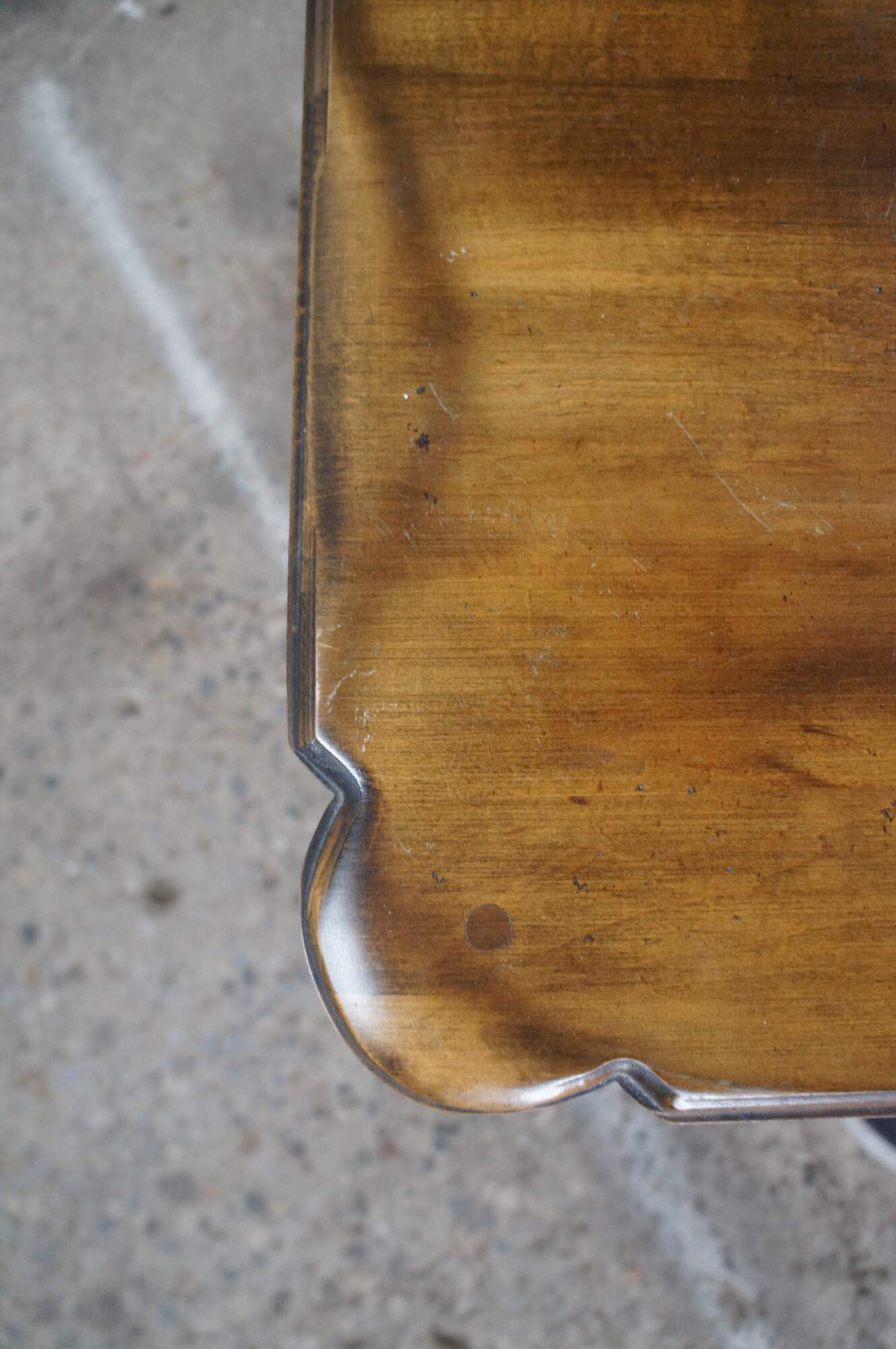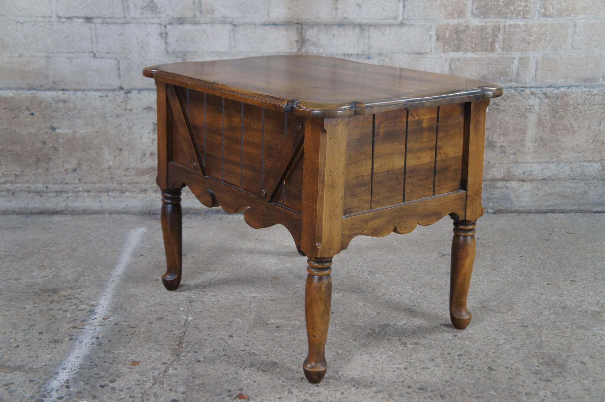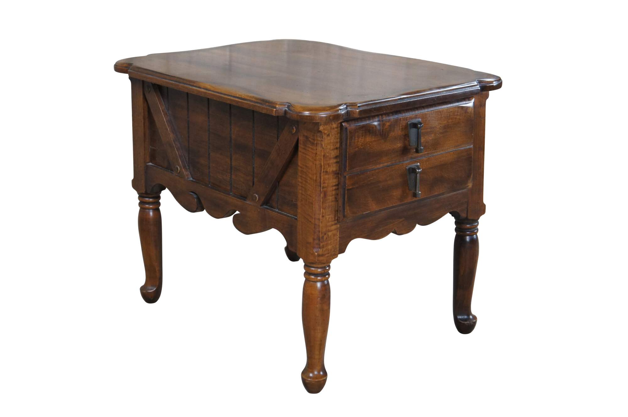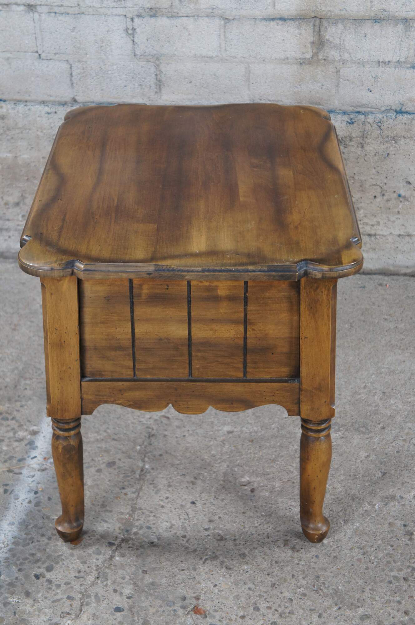 Mid century circa 1967 nightstand or side table. Made of walnut featuring Early American / Country / Colonial styling with large drawer, serpentine accents and pad feet. 1377 11 67.