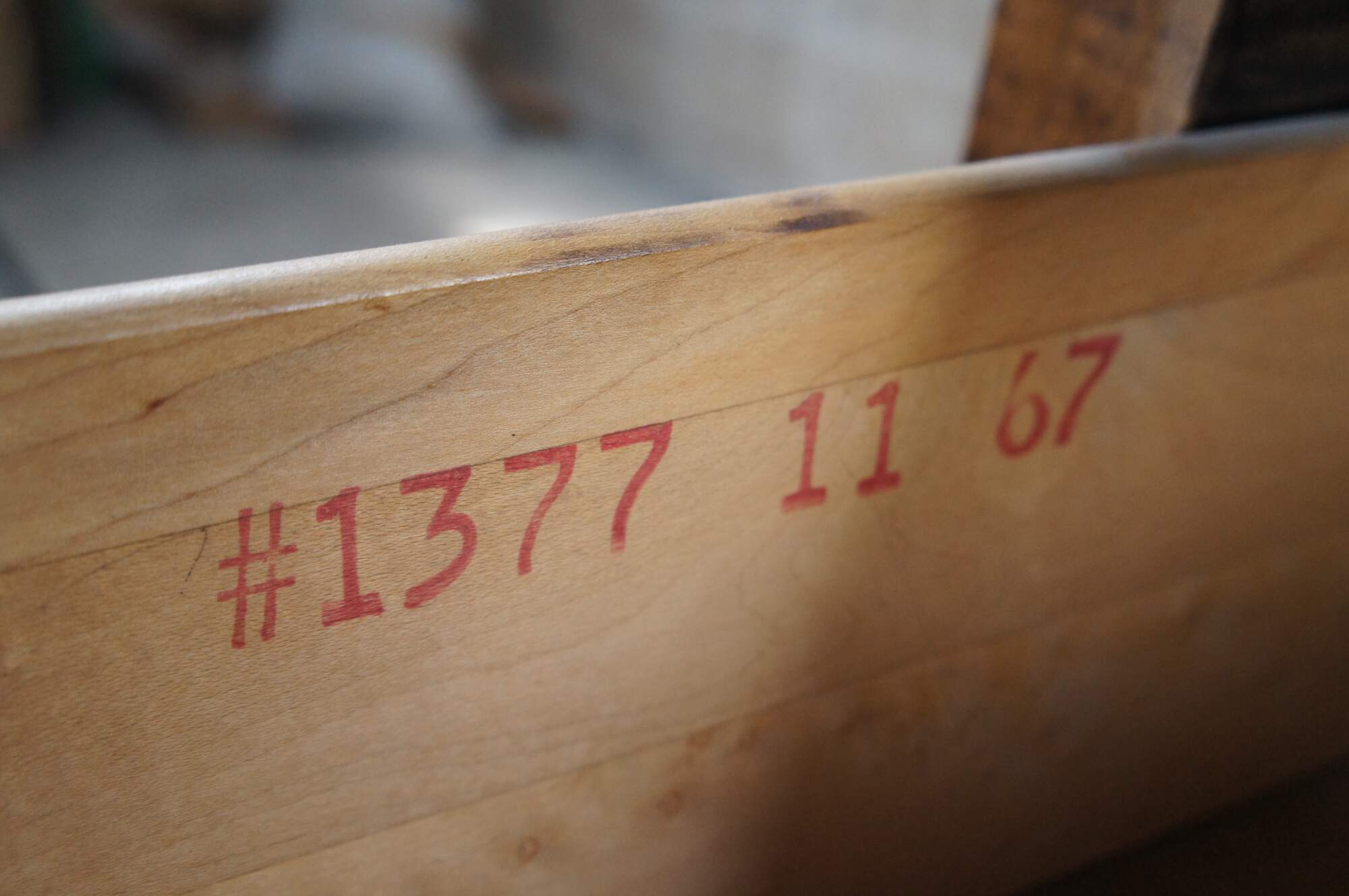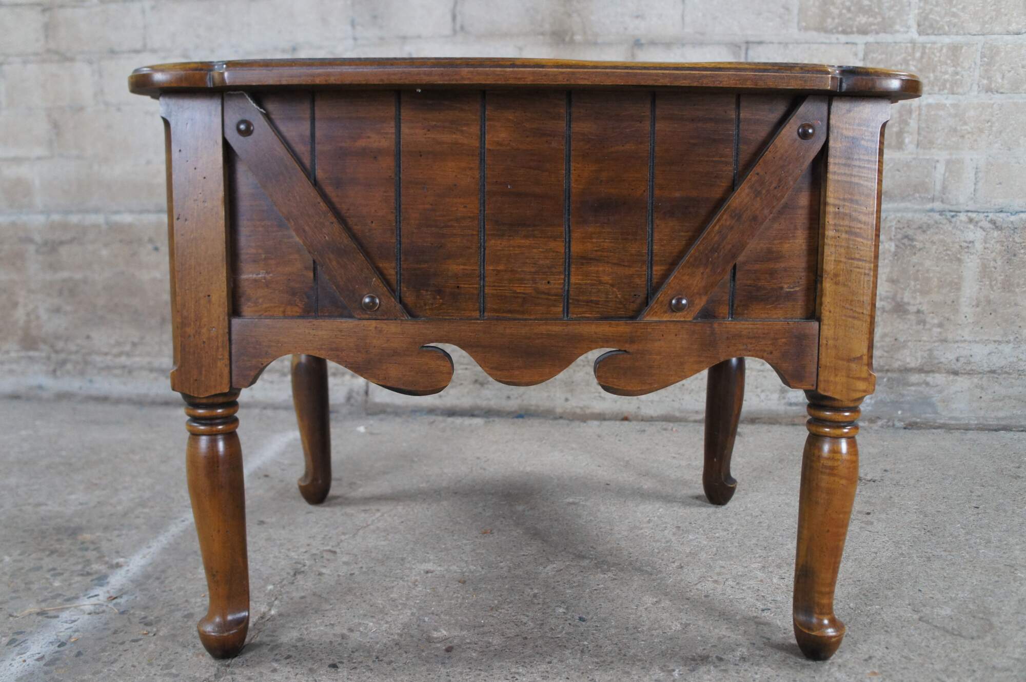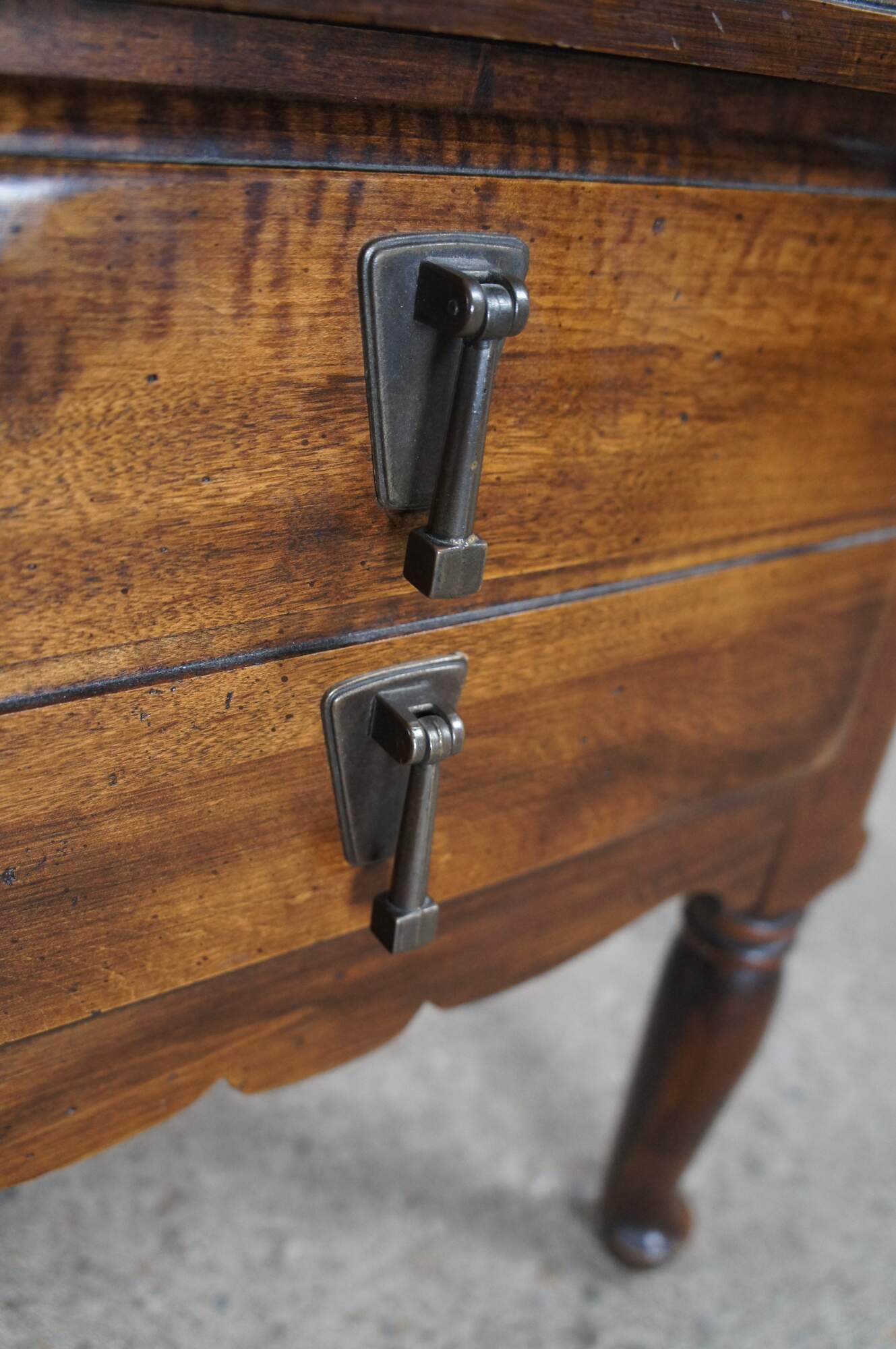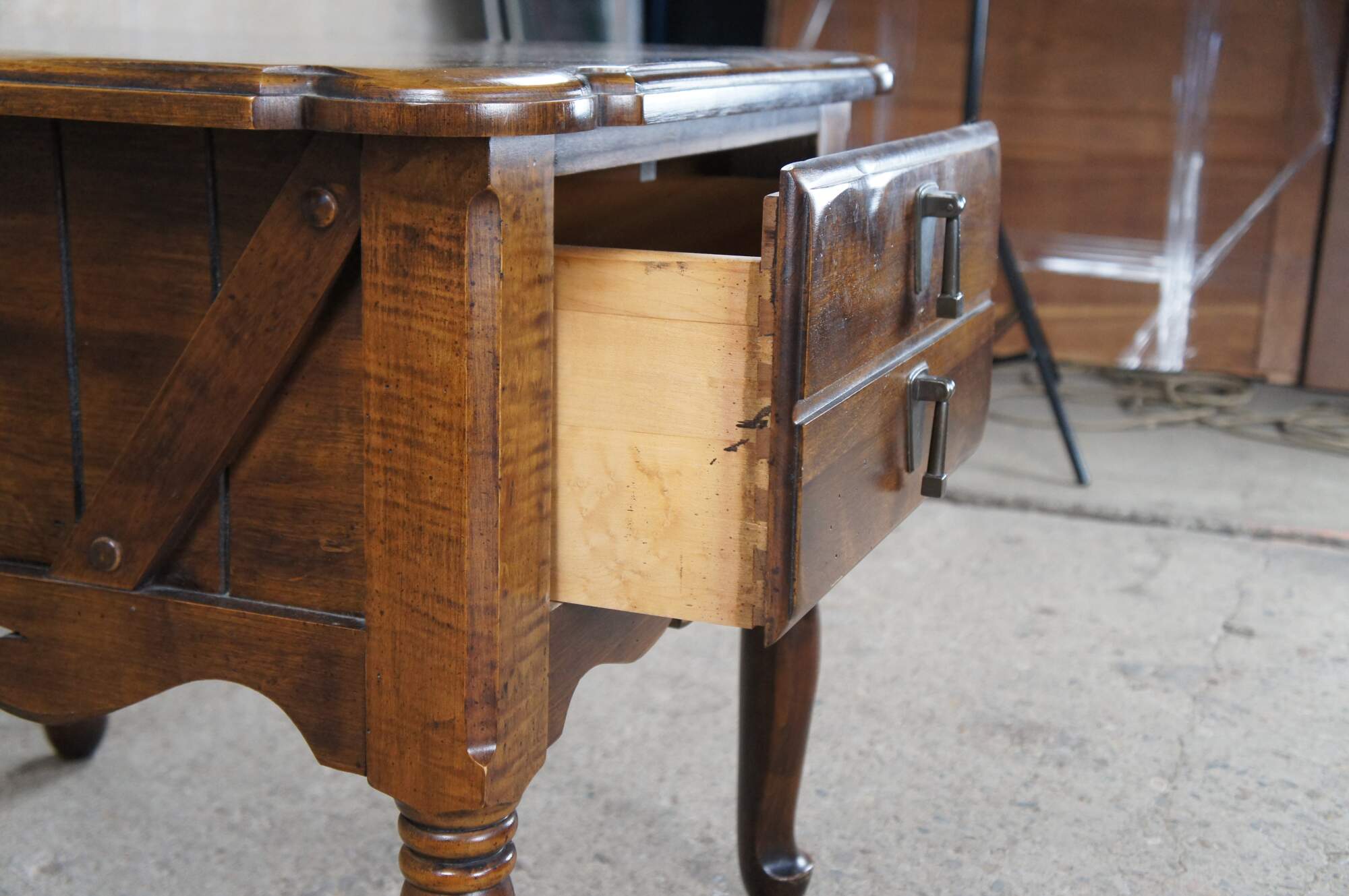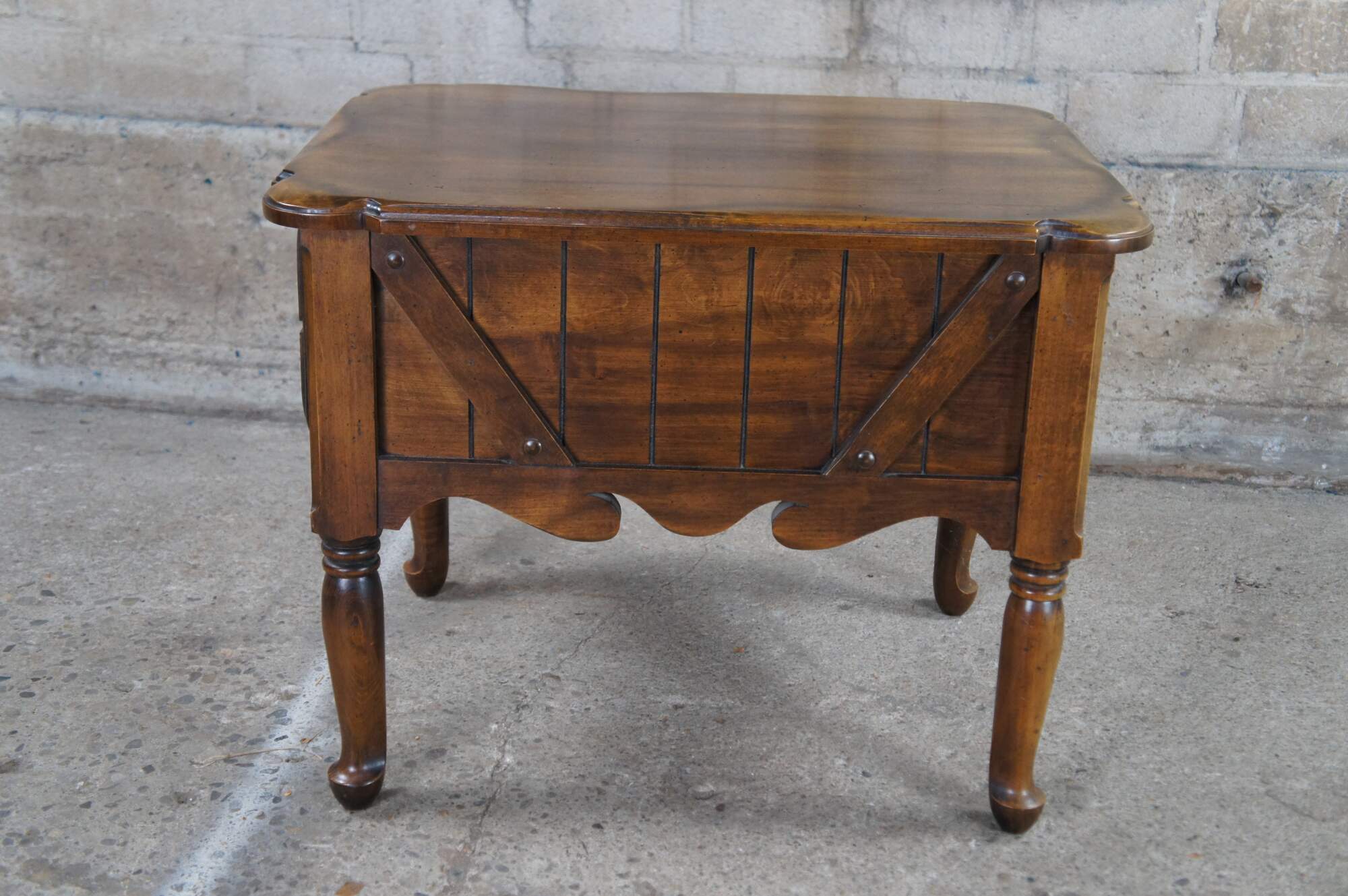 Mid century circa 1967 nightstand or side table. Made of walnut featuring Early American / Country / Colonial styling with large drawer, serpentine accents and pad feet. 1377 11 67.