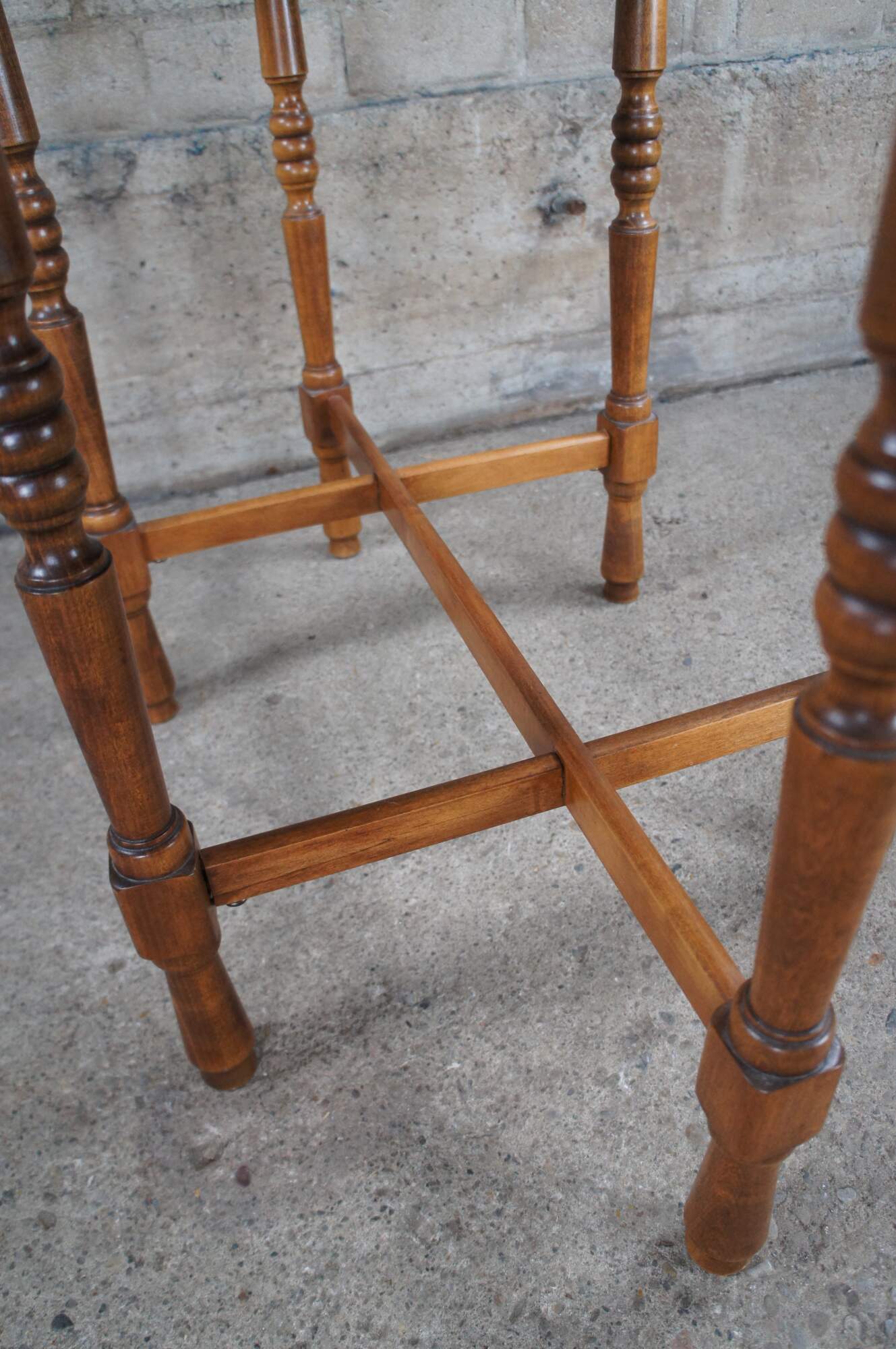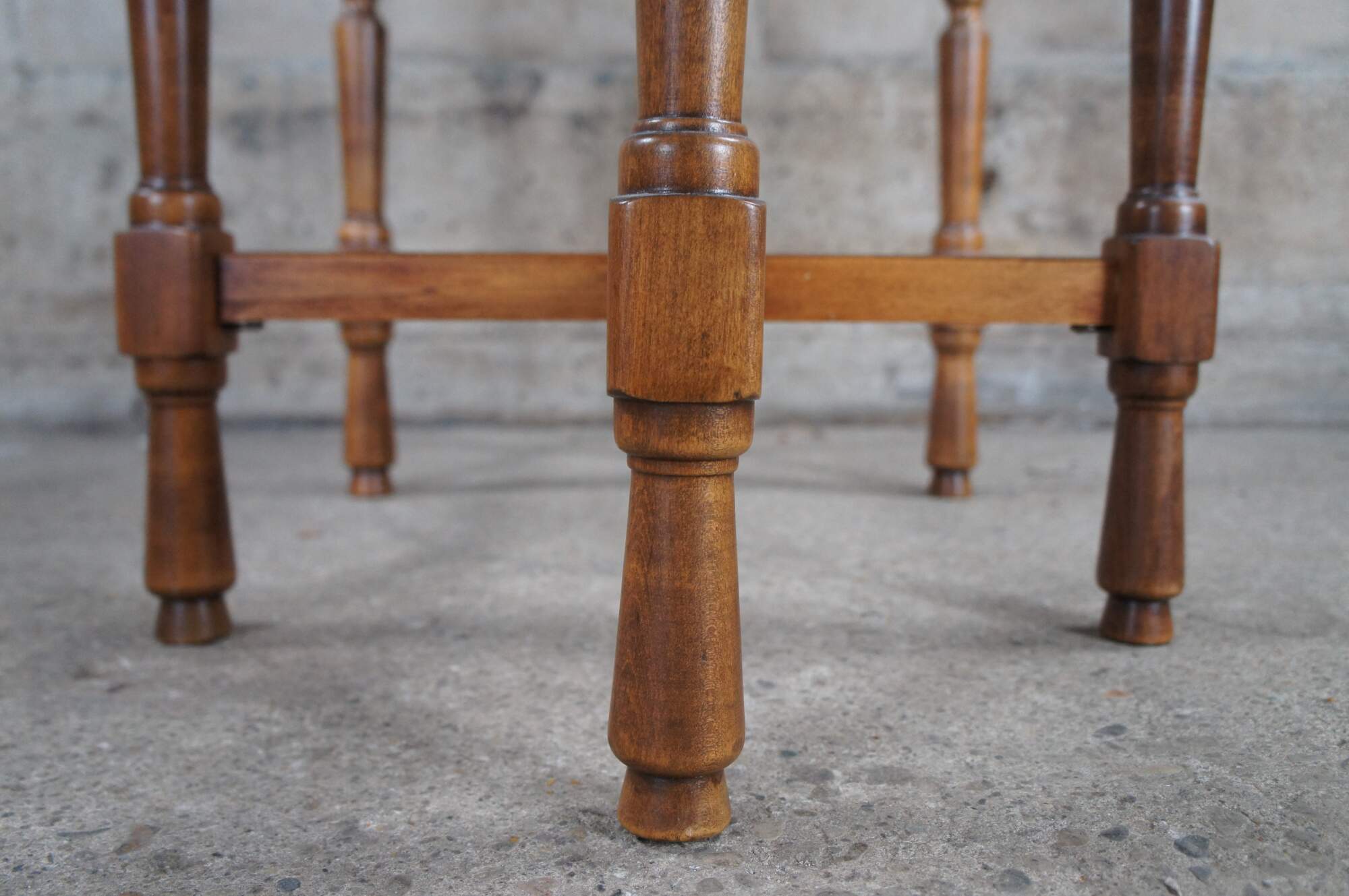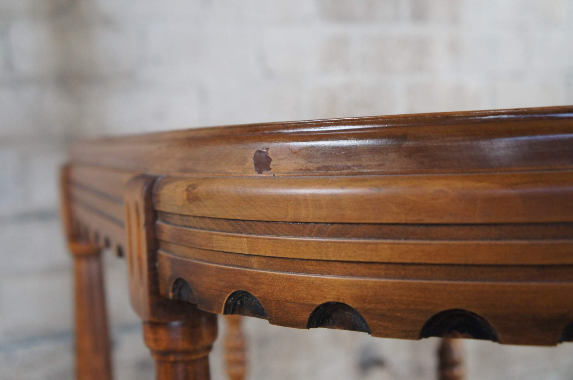 Victorian revival parlor table or platnt stand. Made of walnut featuring a matchbook top with oval form, notched skirt, and six turned legs connected by stretchers.