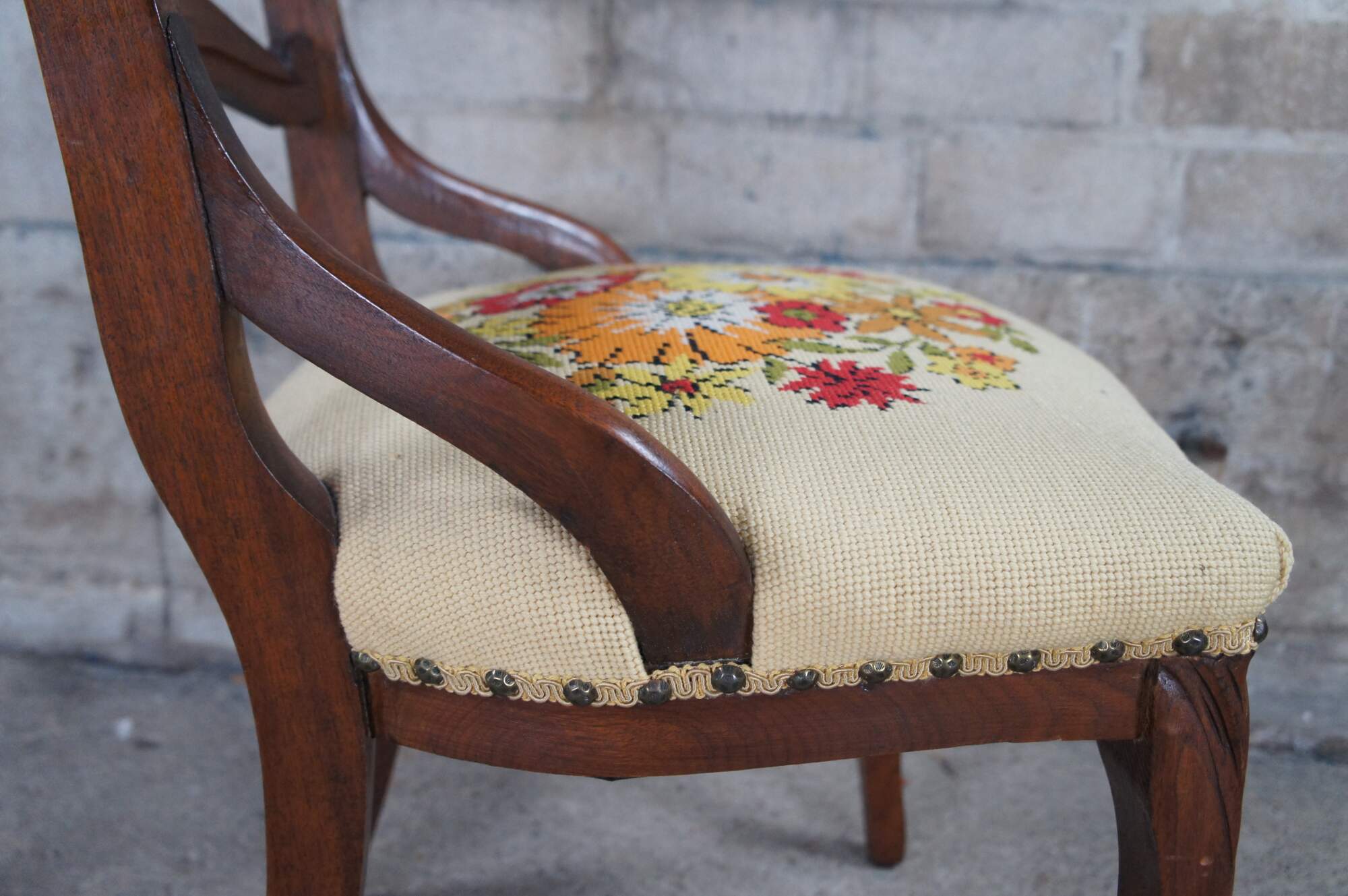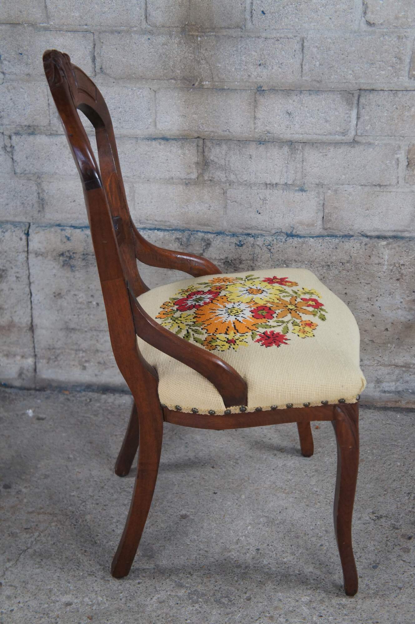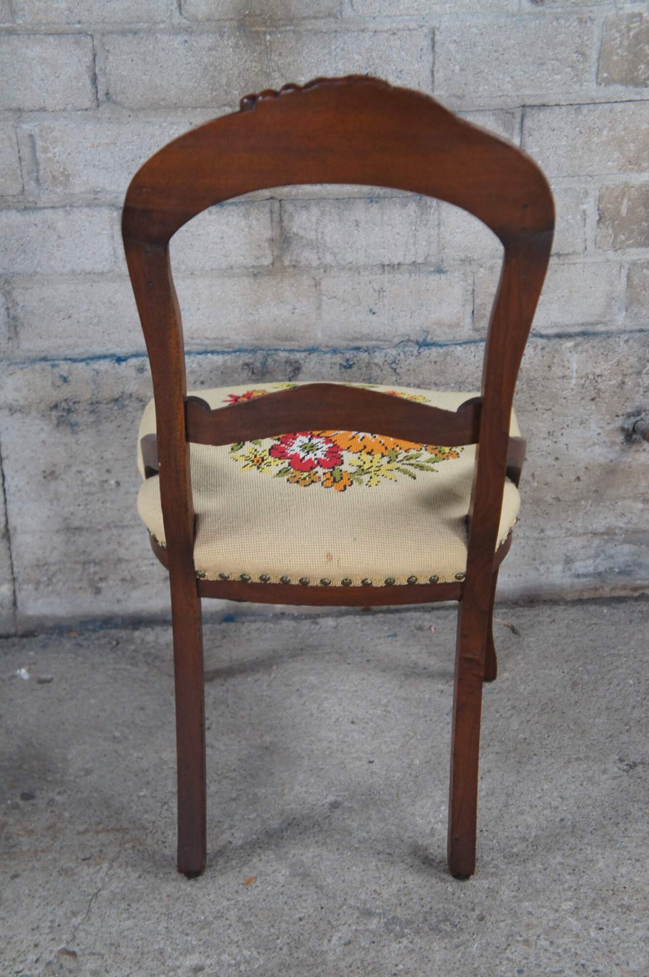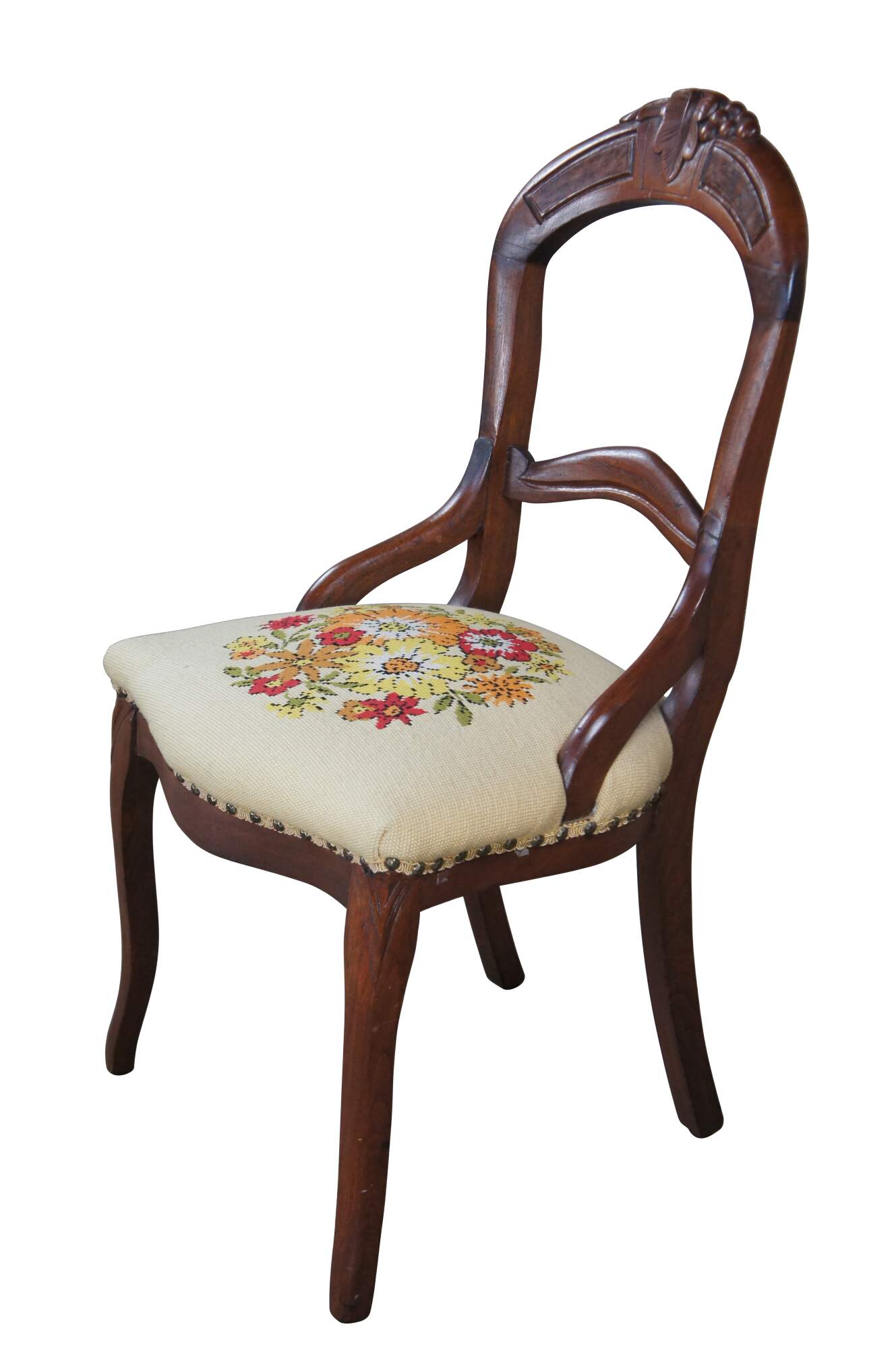 Antique Victorian parlor or dining chair. Made of walnut featuring a balloon back with leaf and berry crown and floral needlepoint seat with nailhead trim.