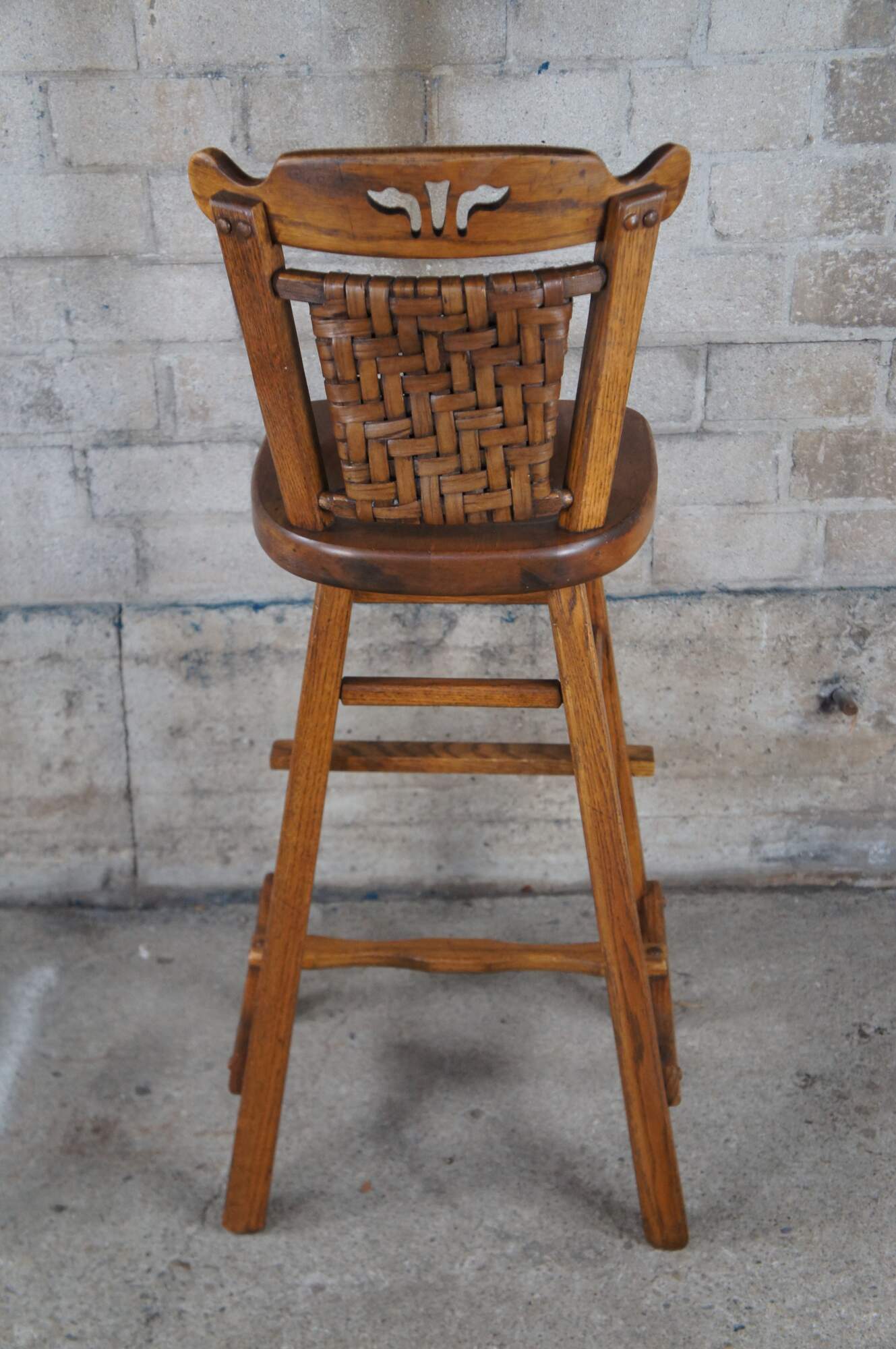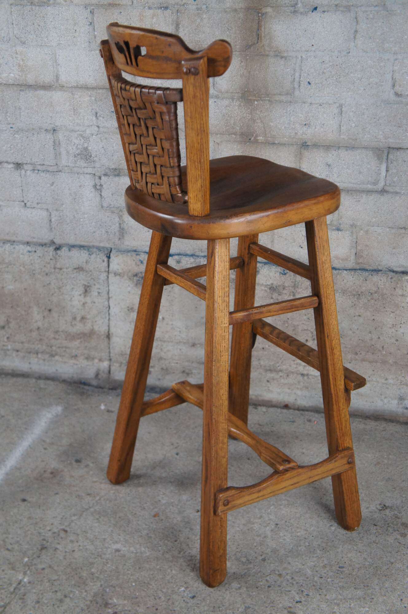Four mid century, circa 1940s, bar or counter stools by Old Hickory Furniture Company of Martinsville, Indiana. Features a primitive tapered Adirondack design with pierced / woven rattan backs. Rustic, log cabin, lodge, farmhouse.