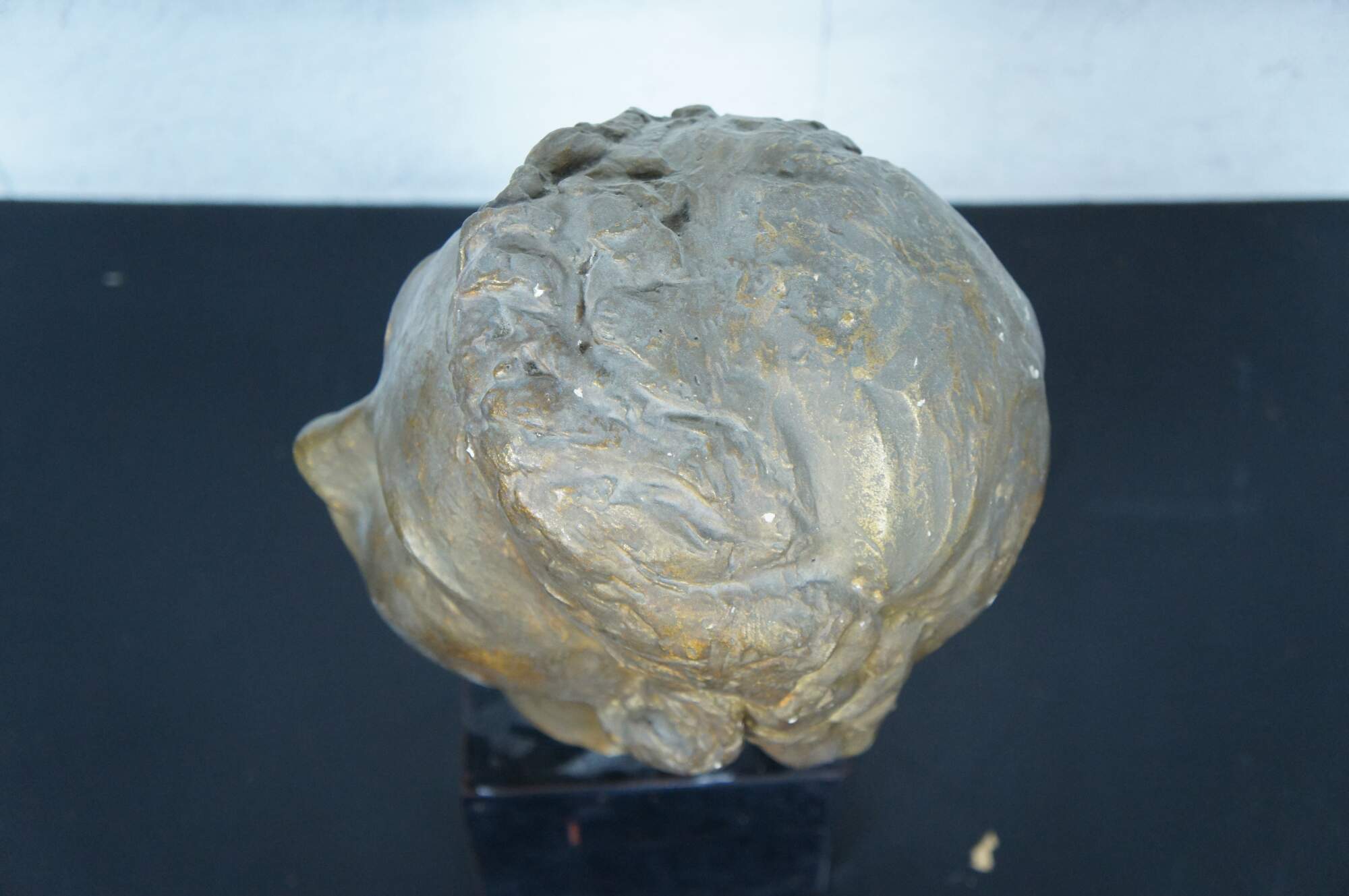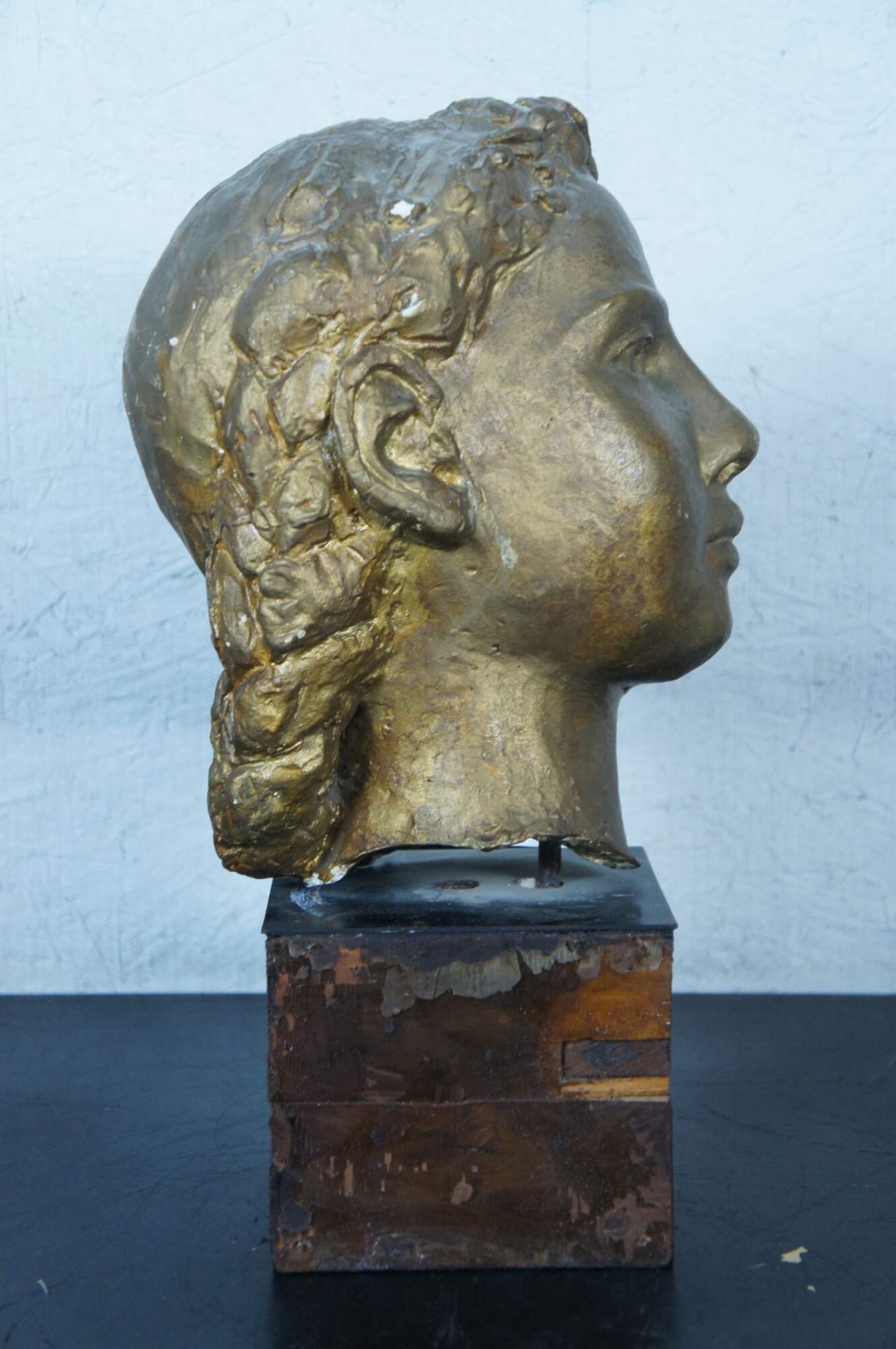 Vintage plaster library bust statue or sculpture depicting a female face with beaded hair, painting gold. Mounted on a wooden base clad with black lacquer panels