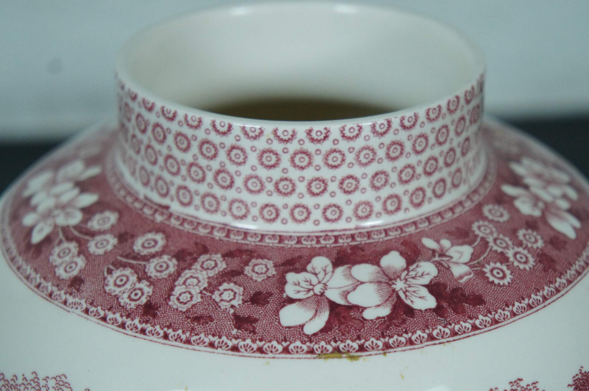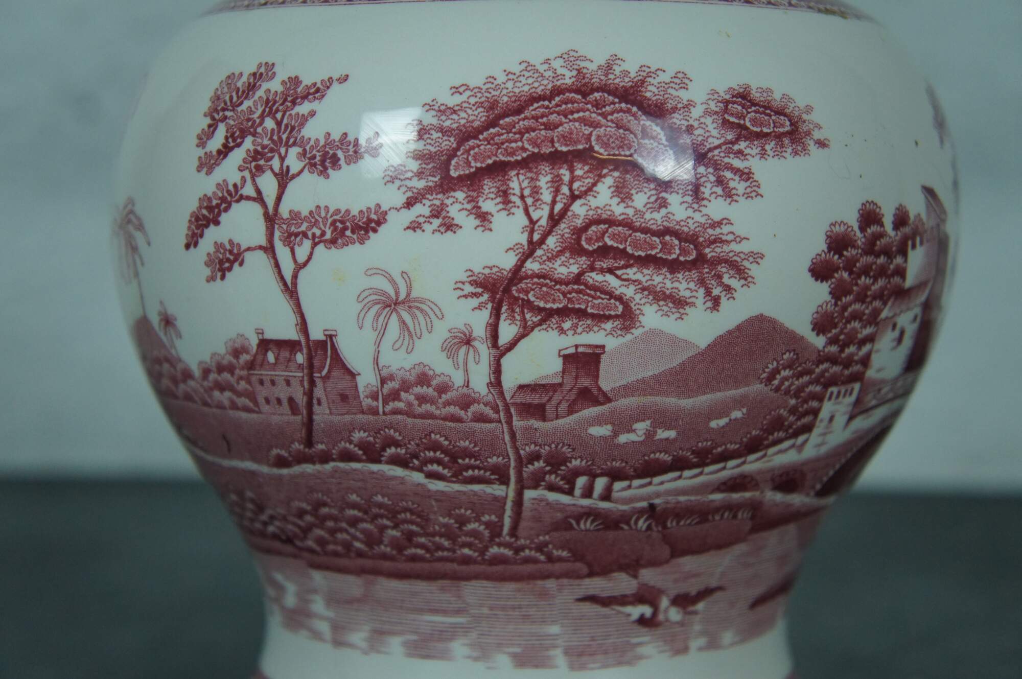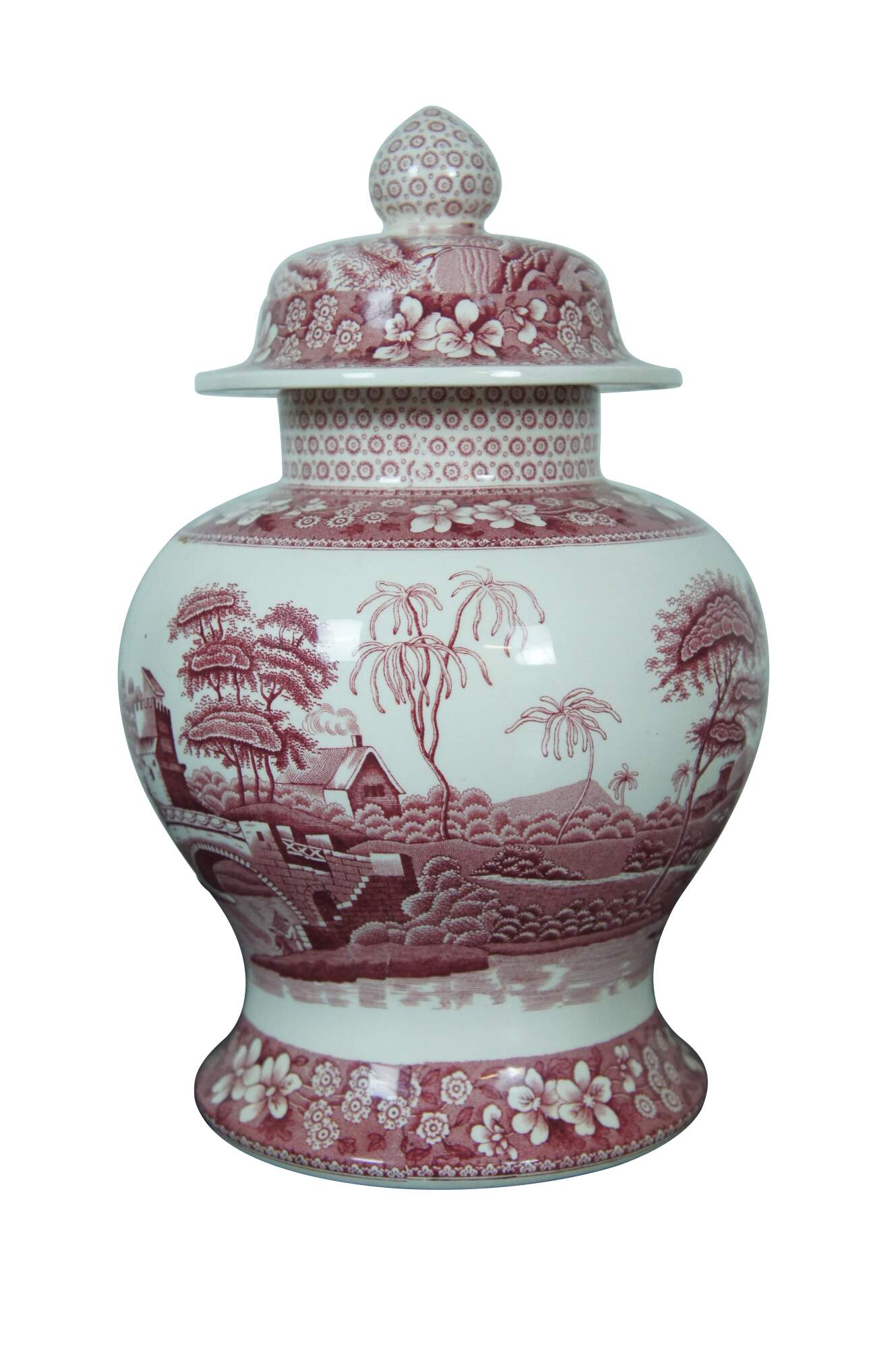 Vintage Spode English porcelain mantel urn / ginger jar / tureen in the Pink Tower pattern. Temple urn form decorated in dark pink with a landscape featuring cottages, stone bridge and towers, and figures, trimmed with floral patterns.
