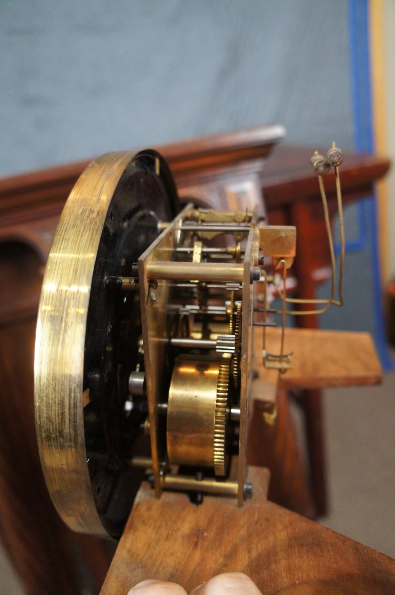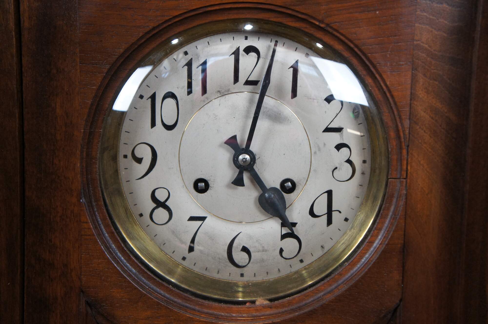 Good Antique Running Condition; age and use related wear. Missing the tip of a block along the arches at the top as well as some upper finials. Scuffing to the pendulum.