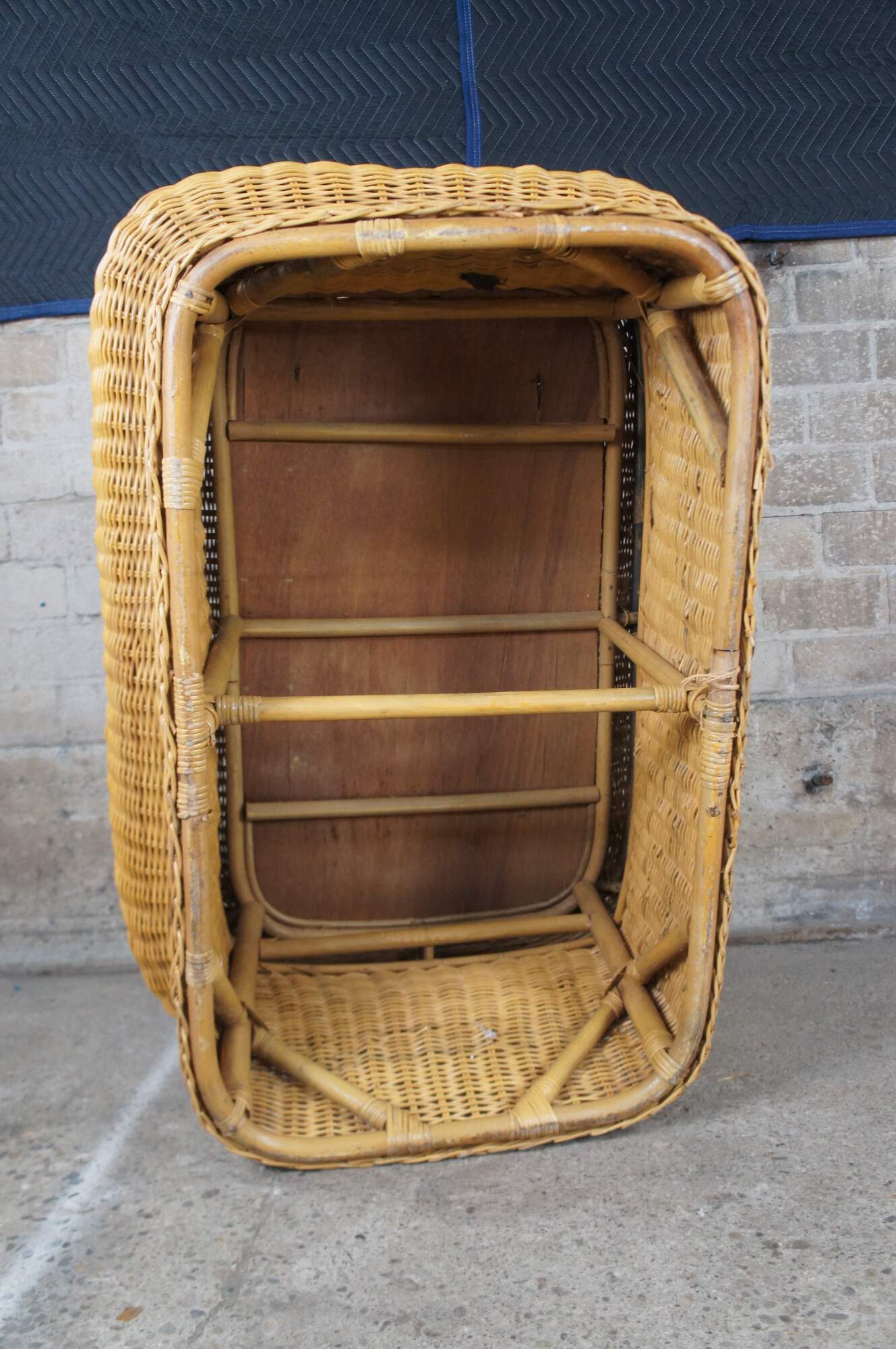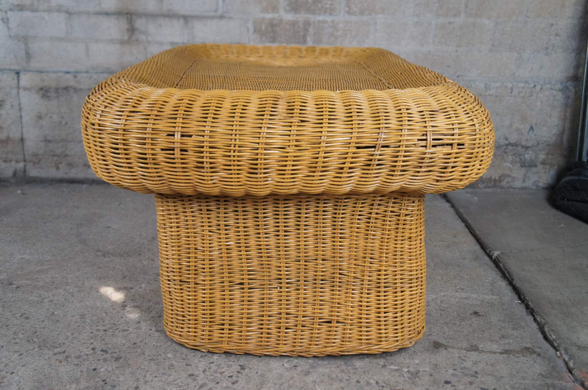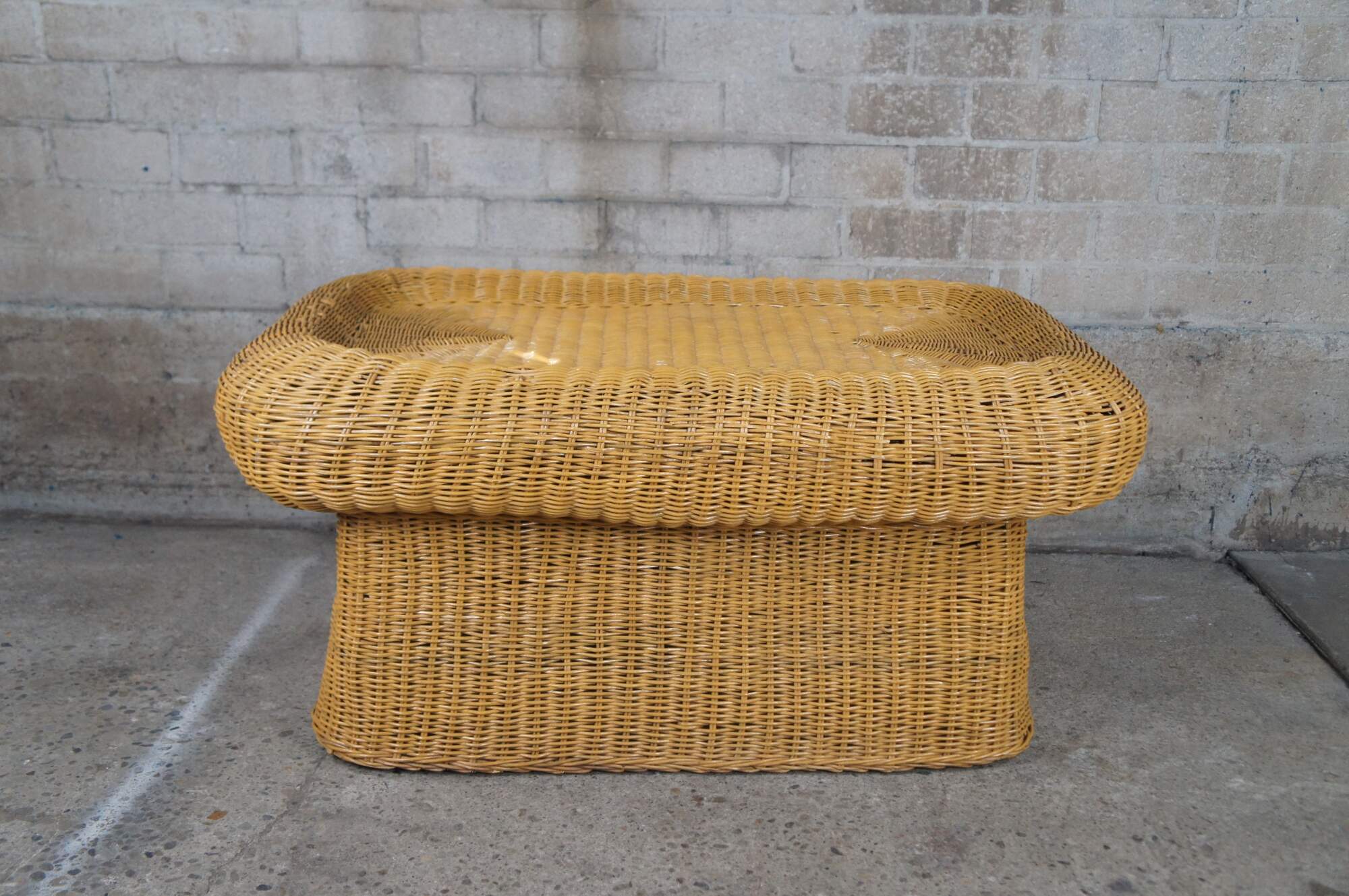 Rare vintage / mid century Bohemian / Boho wicker / rattan / bamboo coffee table or ottoman featuring rectangular form with thick rolled gallery, inset surface and skirted base. Attributed to Japanese artist Isamu Kenmochi.