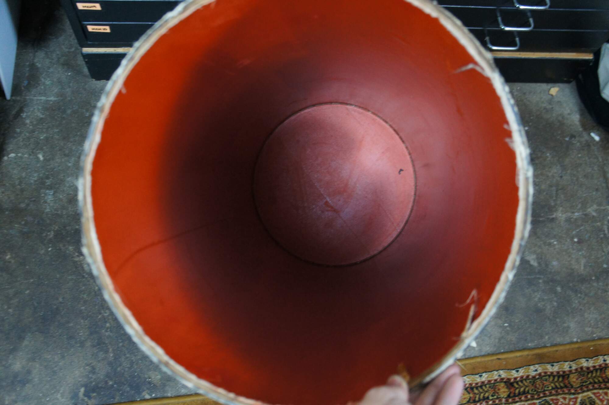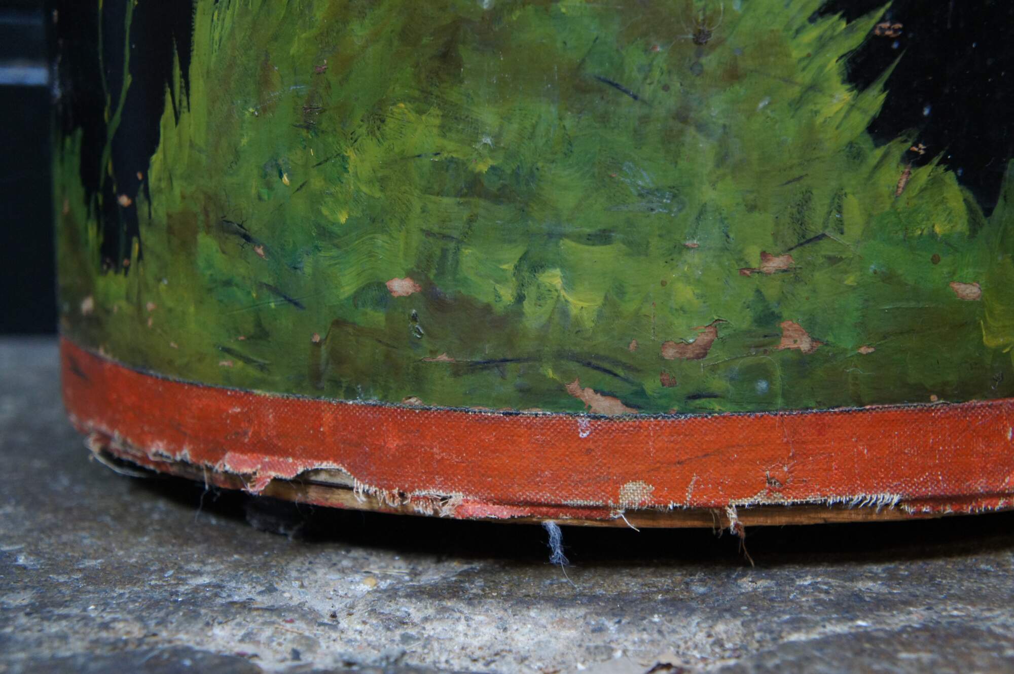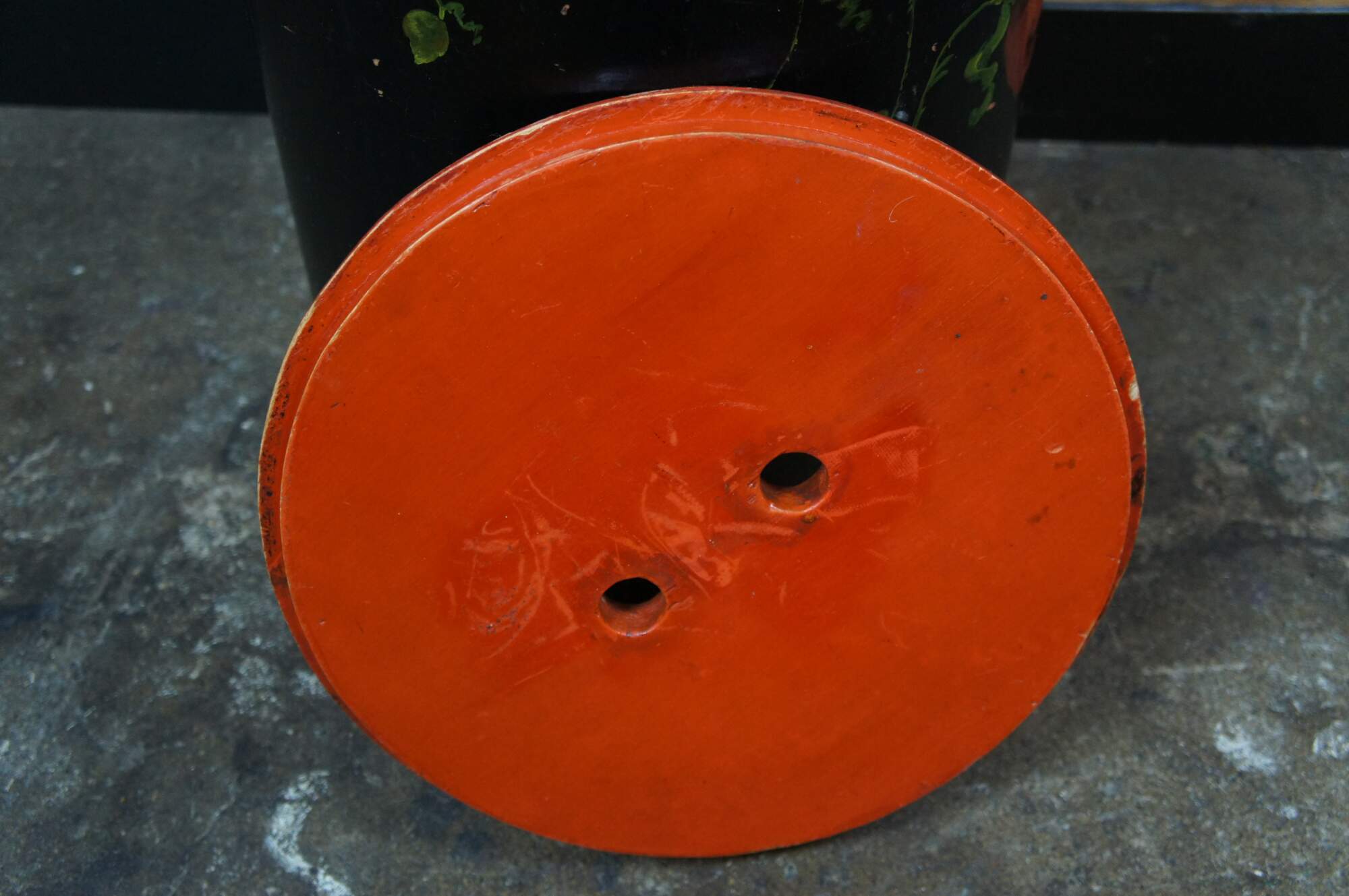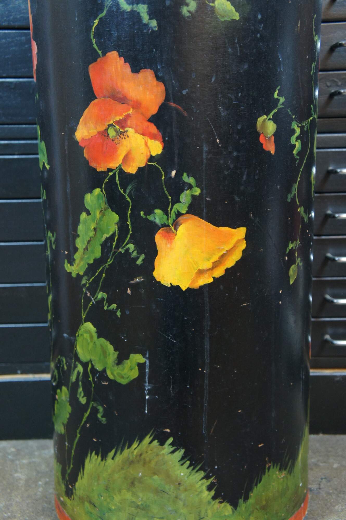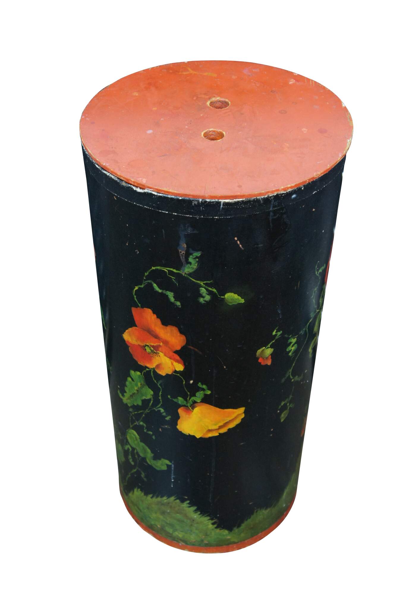 Vintage clothes hamper / waste basket / cane / umbrella stand - cylindrical thick paper mache body with wooden base and lid. Painted in the style of folk art toleware with green and red poppies on a black background.