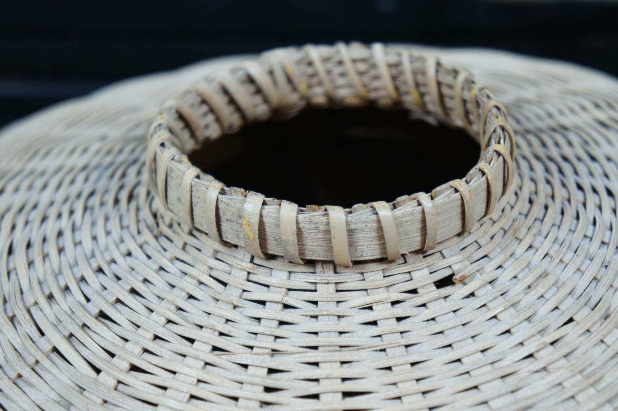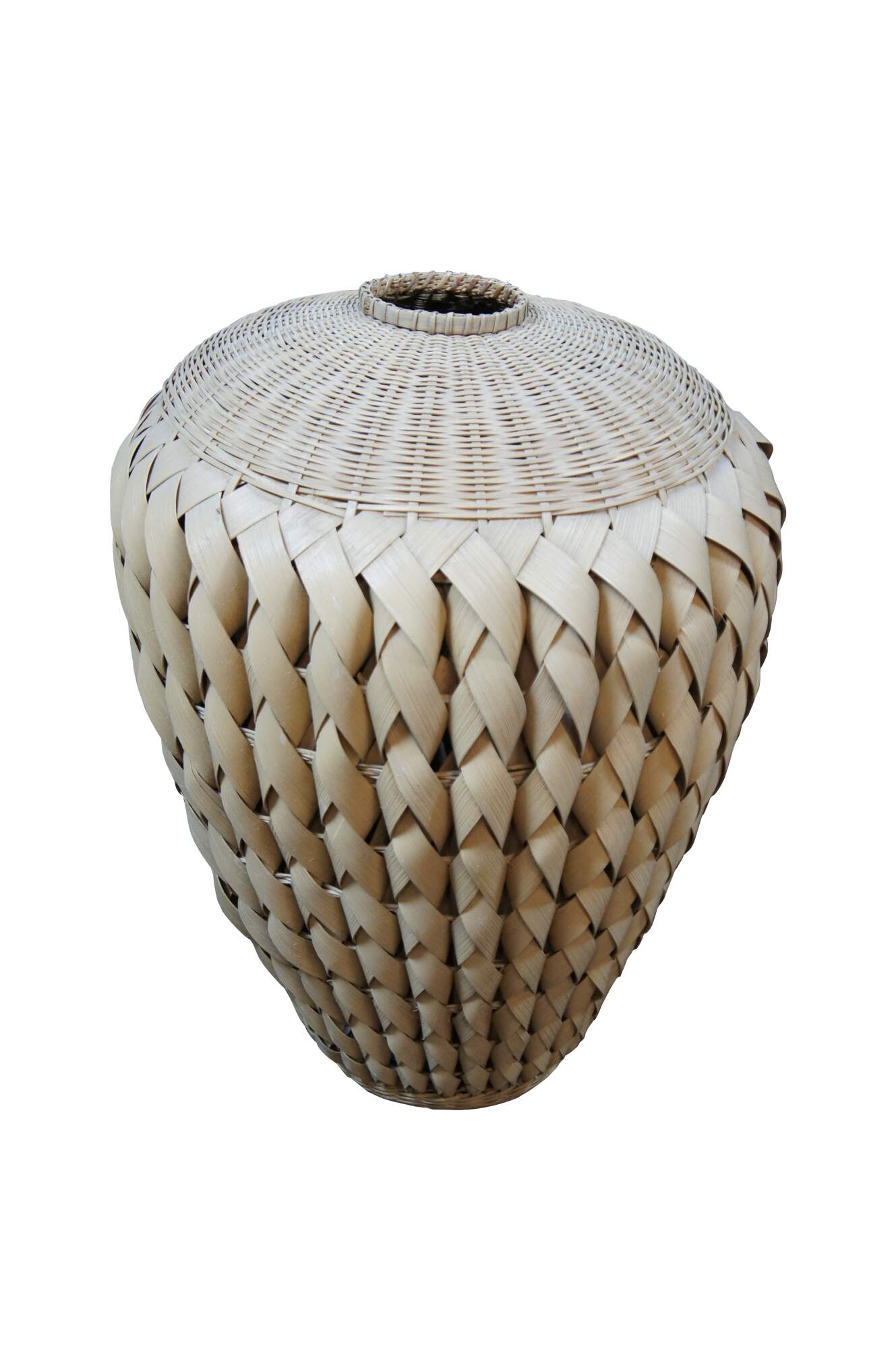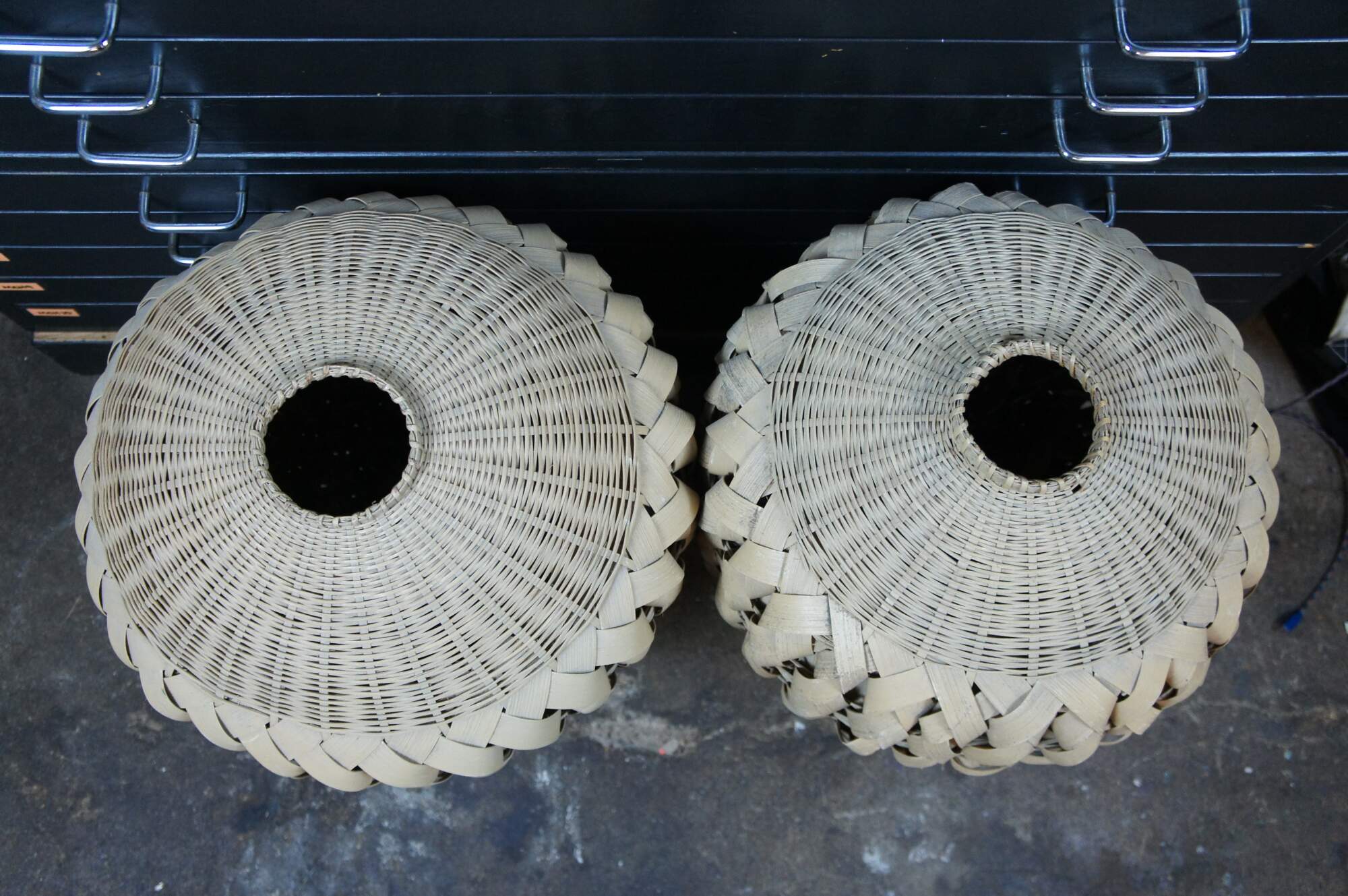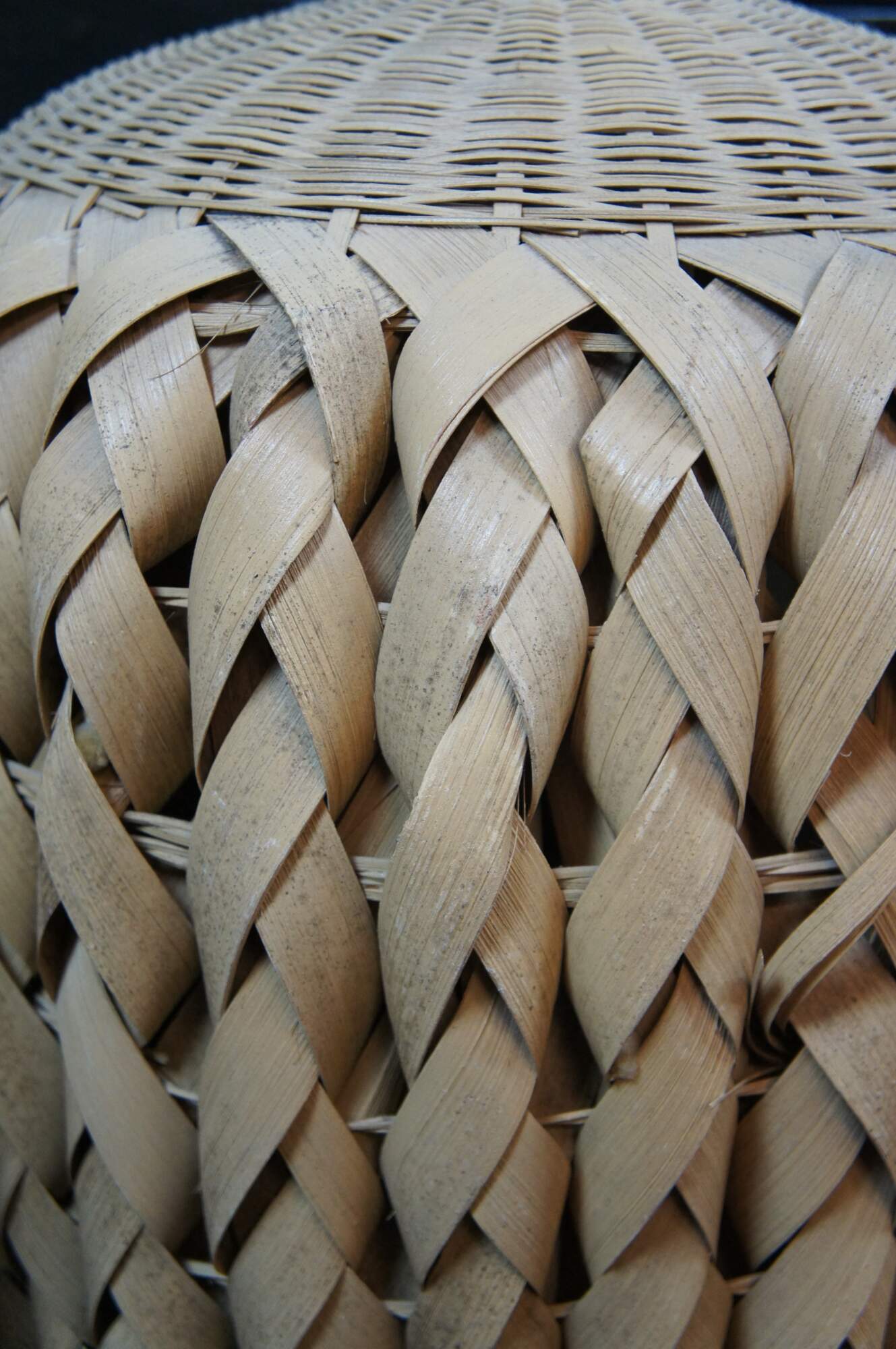Pair of large vintage Bohemian woven palm / wicker floor vases / mantel urns. Round form with tapered base, beautiful braided design on the side with a dome shaped woven top and small mouth.