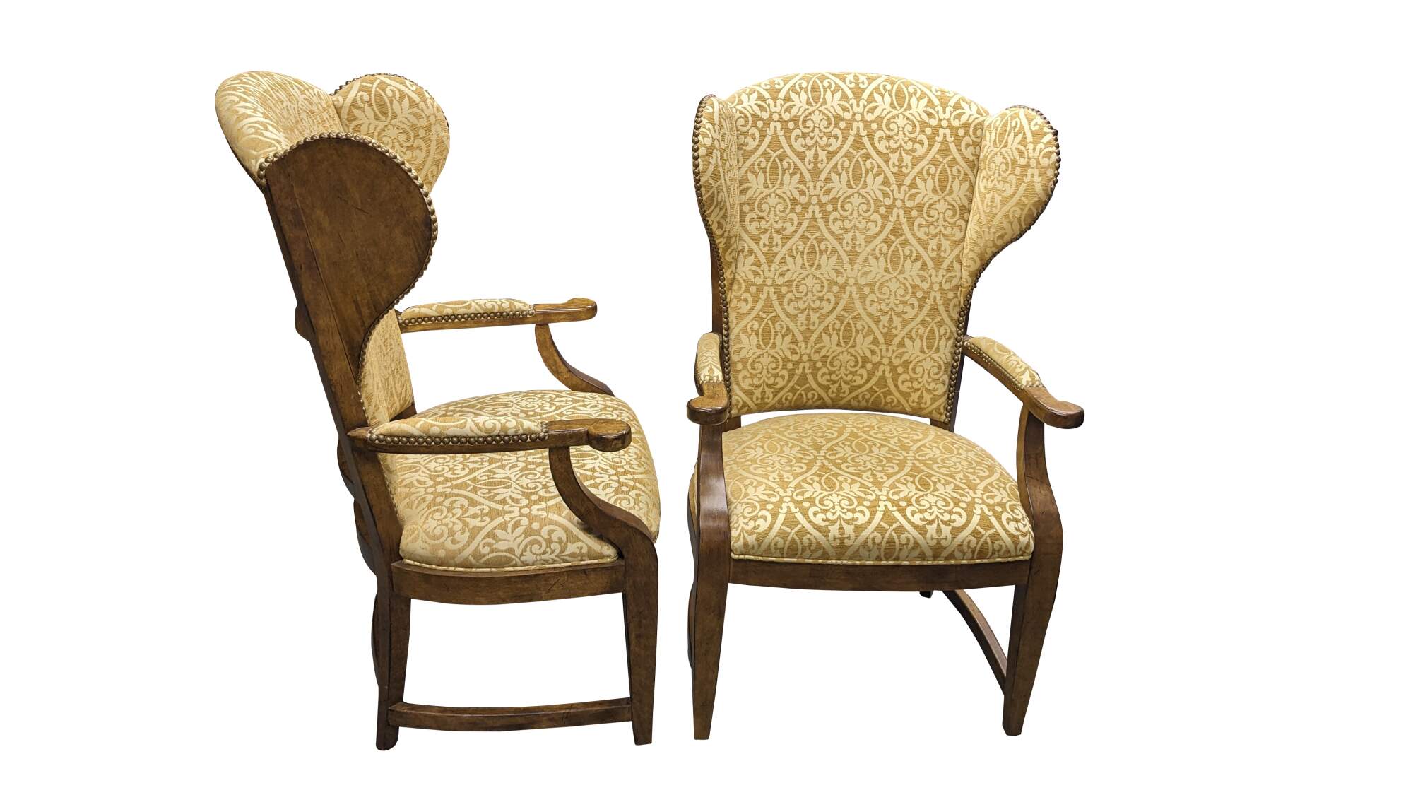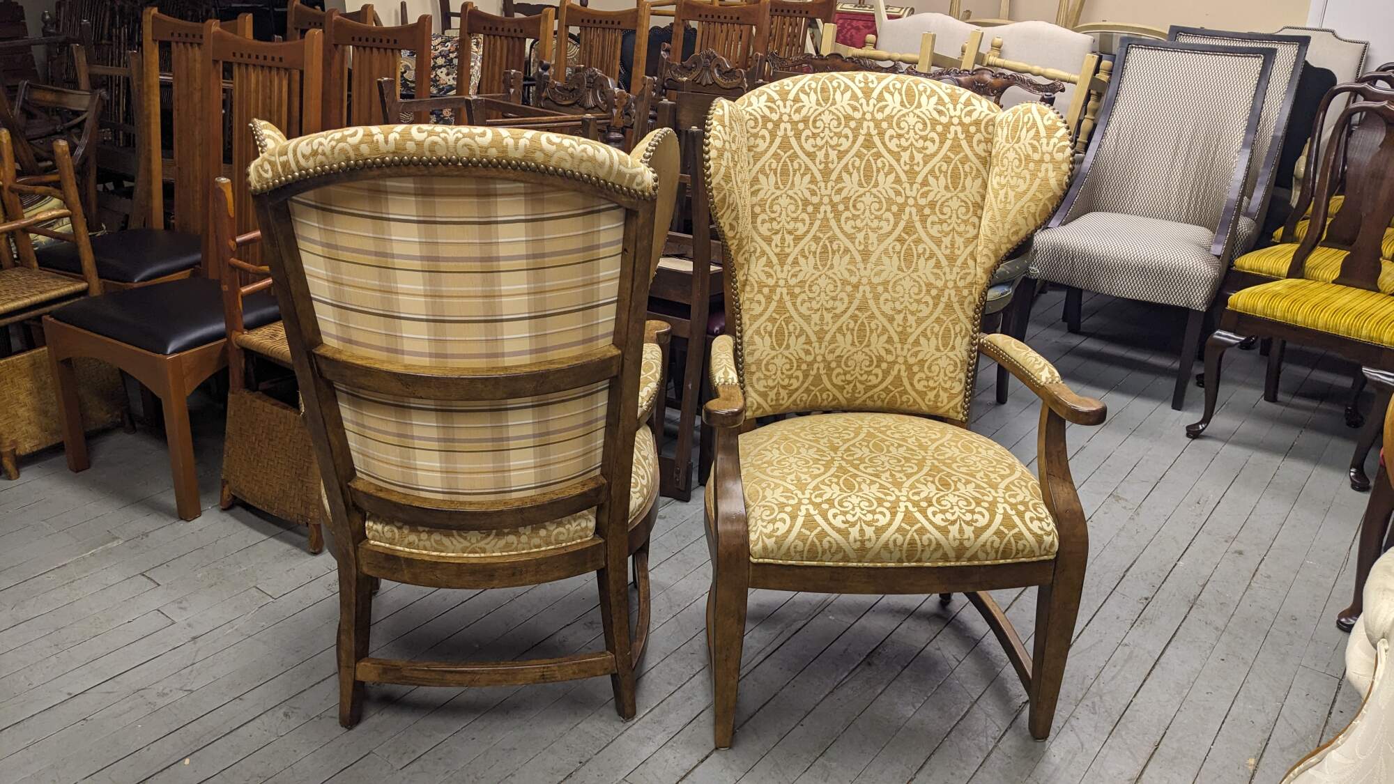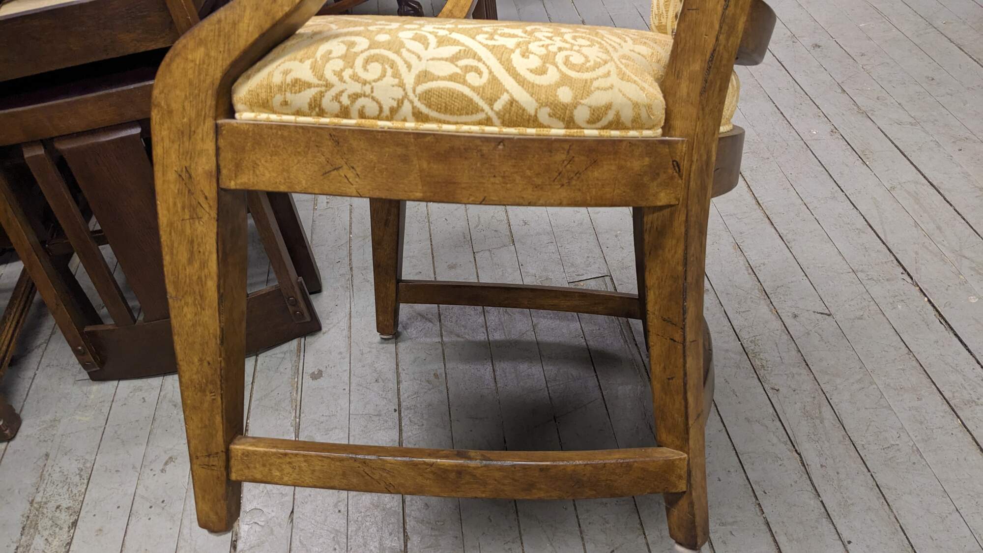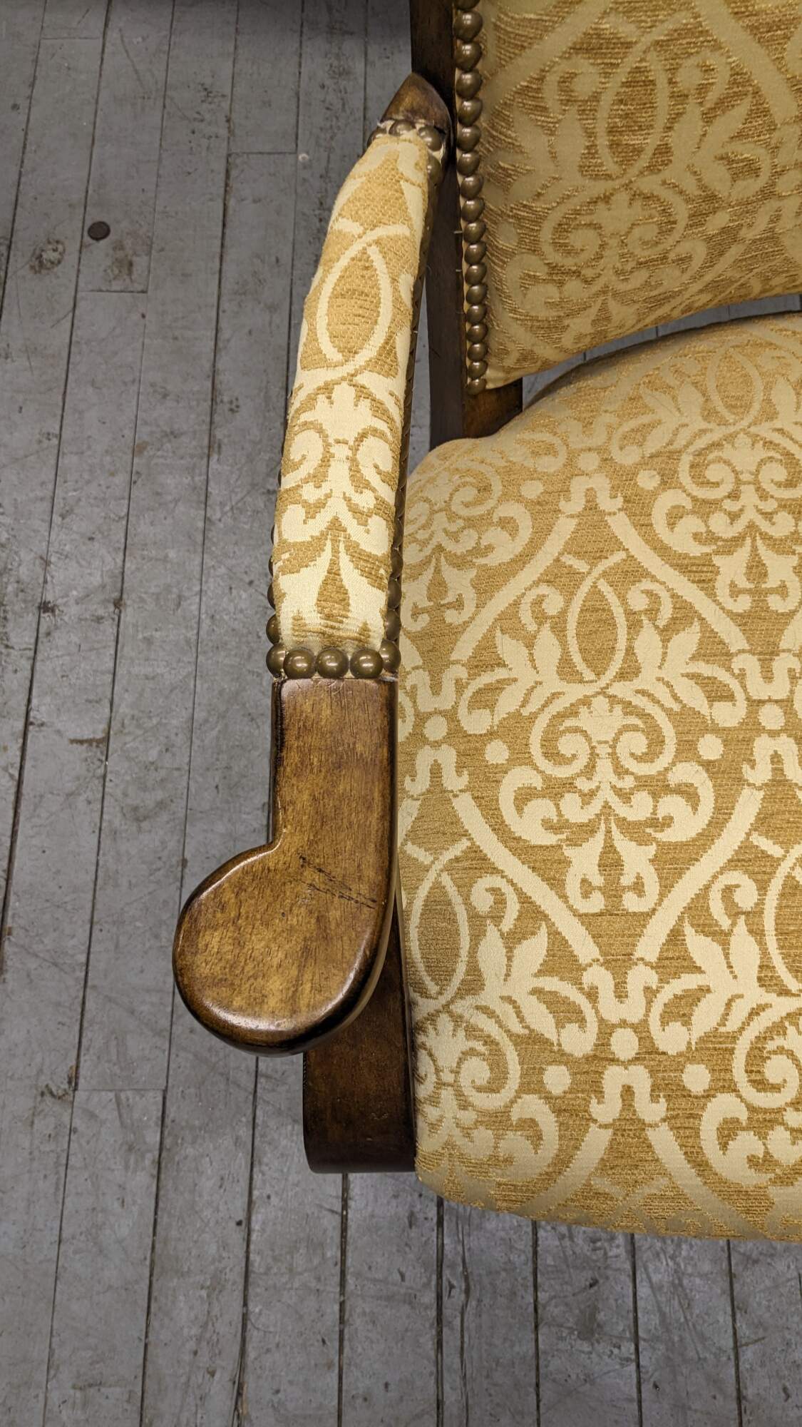 Pair of Century Furniture Caribou Club Arm Chairs in Sierra Finish. An elegant blend between French Country and Old World Spanish styling. Made from European Beech Solids with a natural distressed finish. Upholstered in a yellow brocade fabric with cording and plaid striped backing. Each arm Chair approximately 50lbs. Circa 2013; 611-542