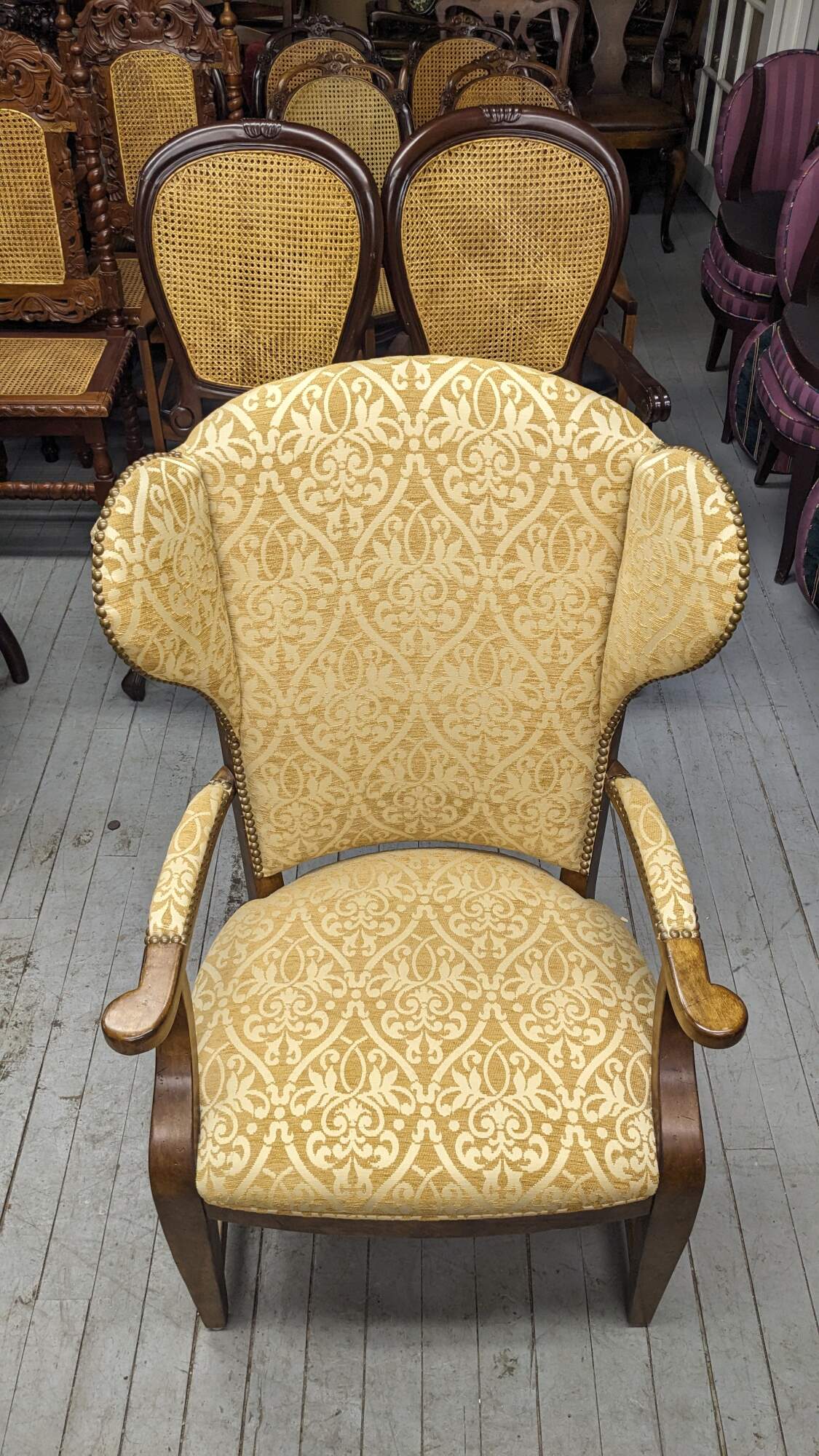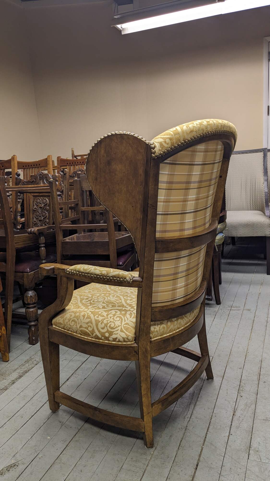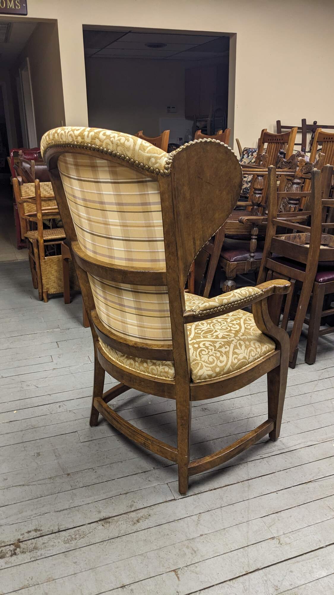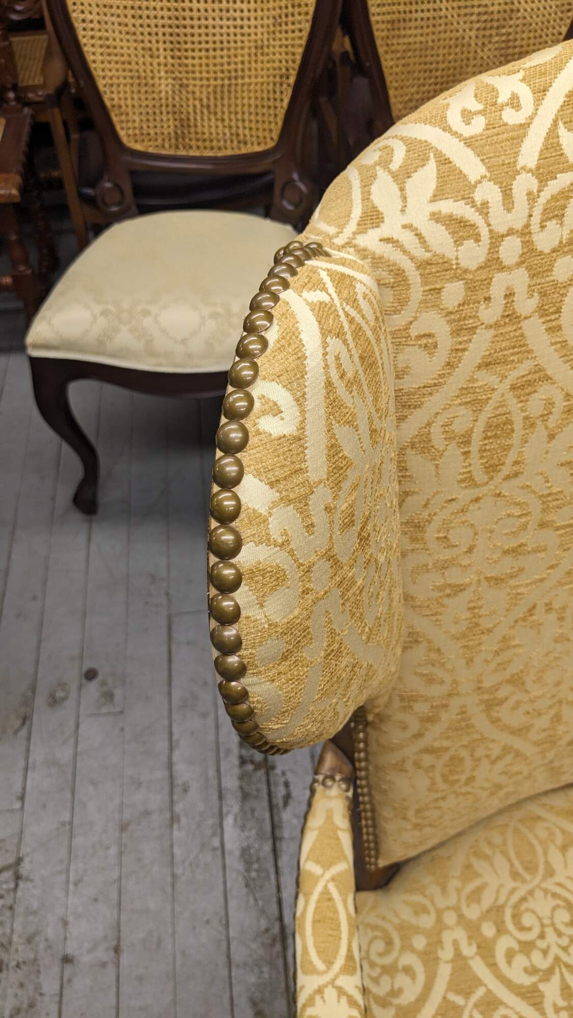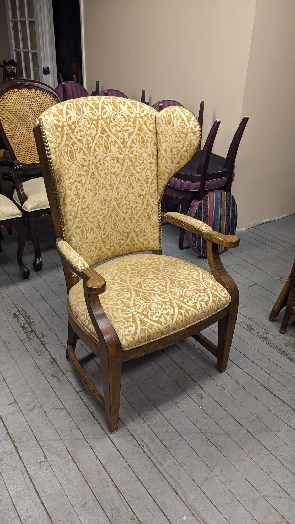 Pair of Century Furniture Caribou Club Arm Chairs in Sierra Finish. An elegant blend between French Country and Old World Spanish styling. Made from European Beech Solids with a natural distressed finish. Upholstered in a yellow brocade fabric with cording and plaid striped backing. Each arm Chair approximately 50lbs. Circa 2013; 611-542