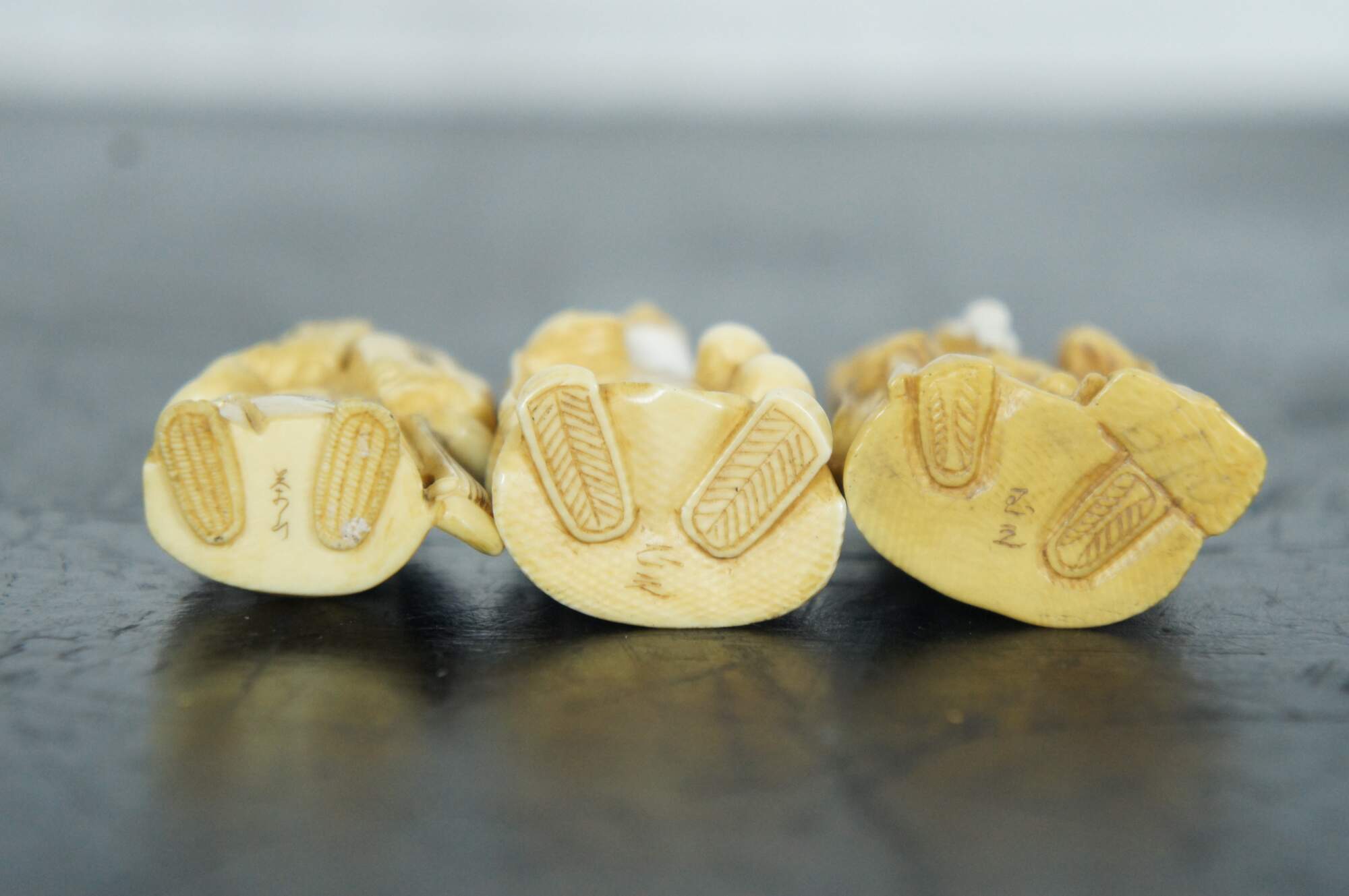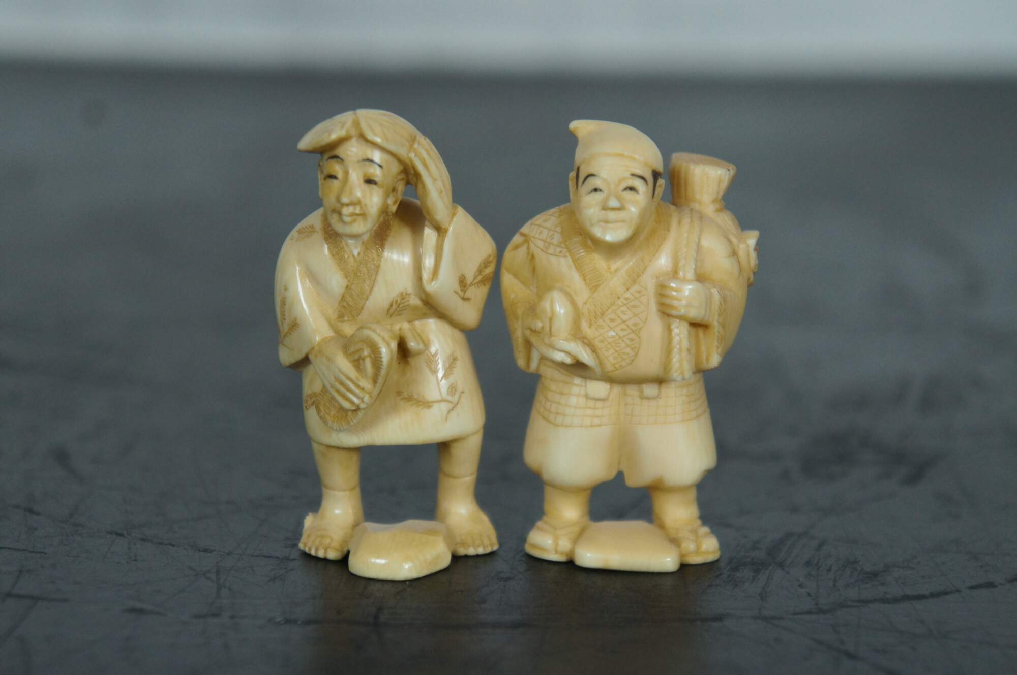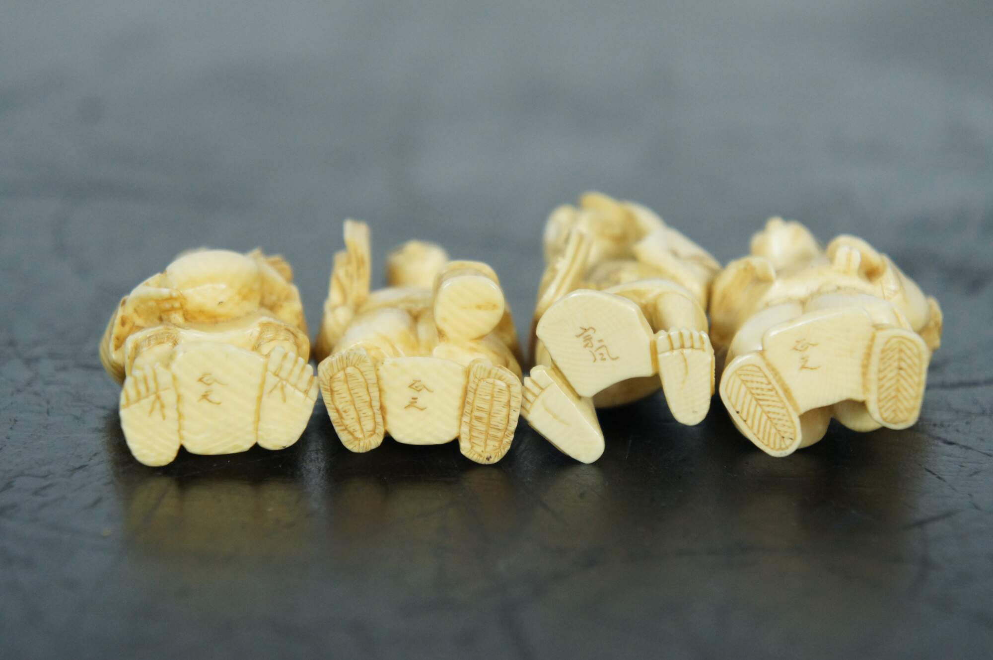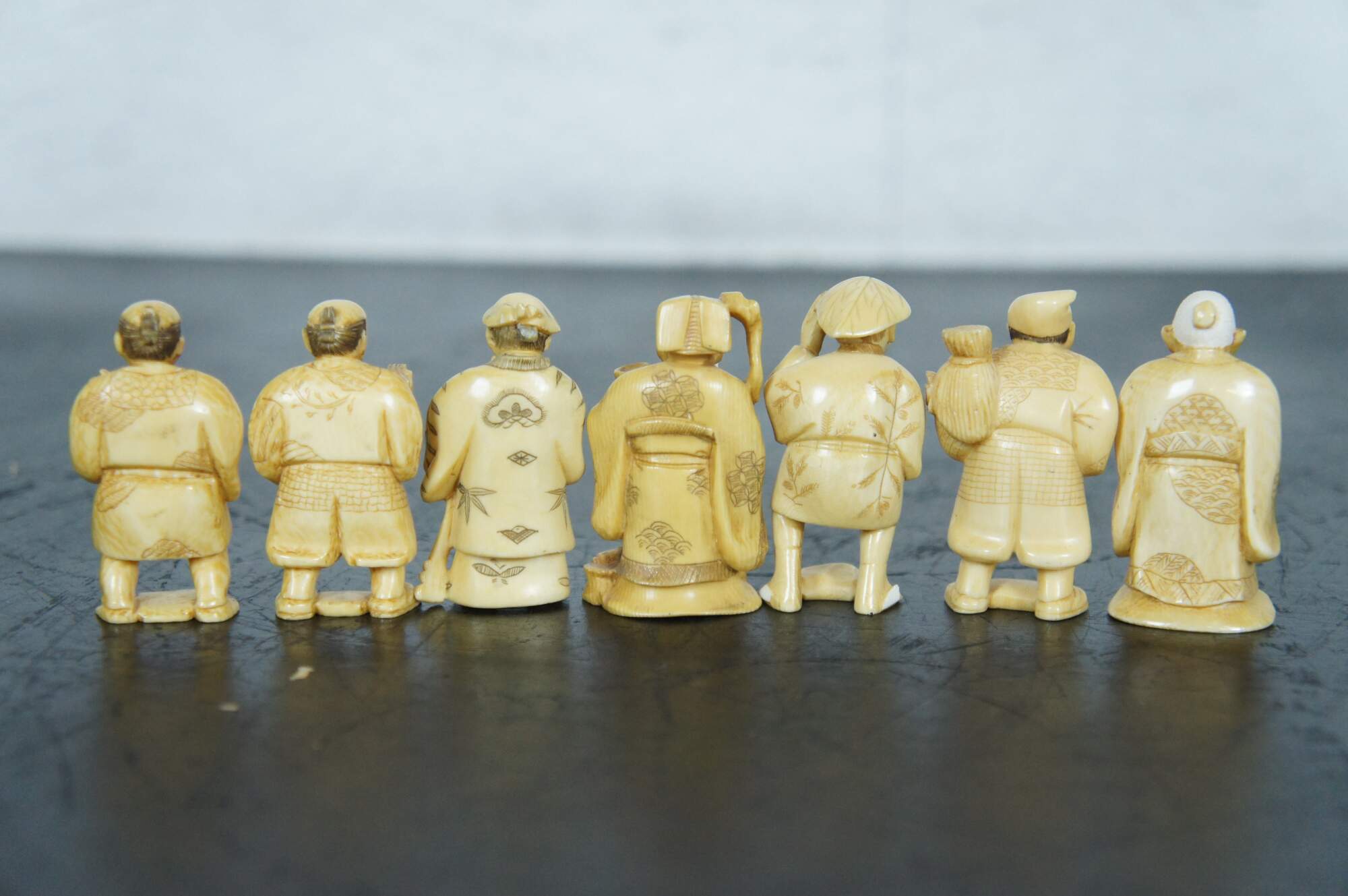 Set of seven Japanese okimono miniature carved resin figurines depicting the 7 lucky immortal gods of fortune.