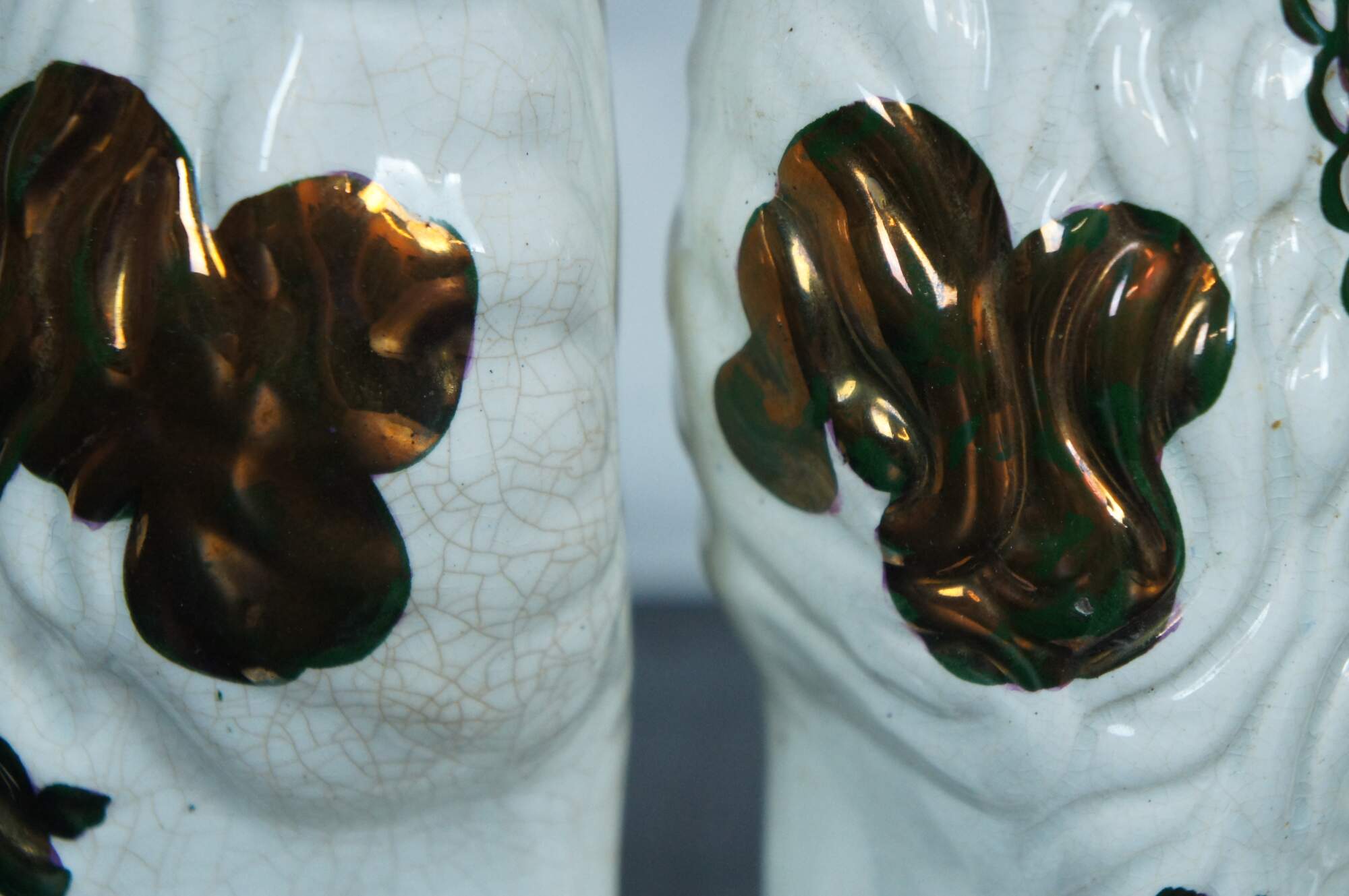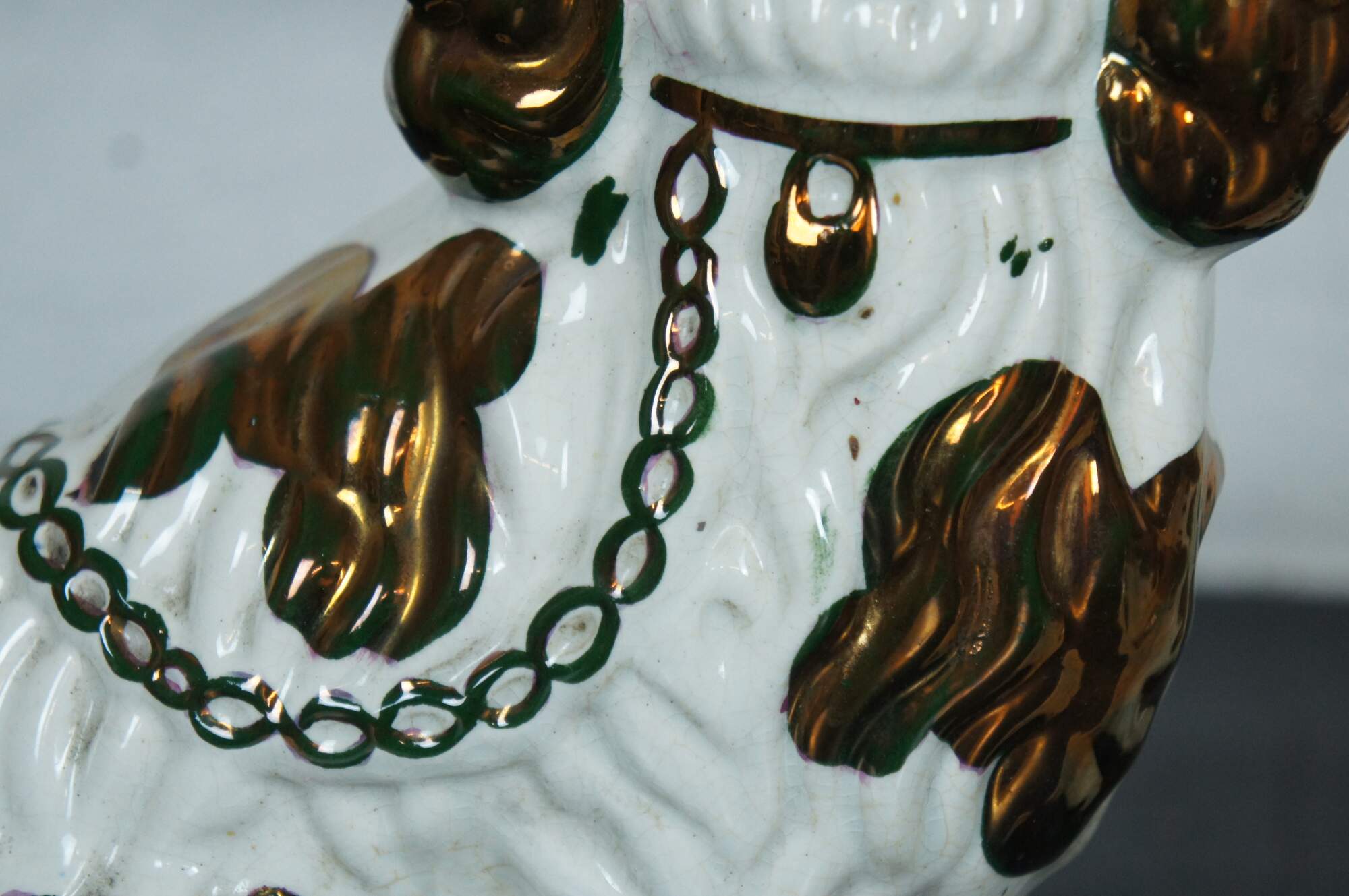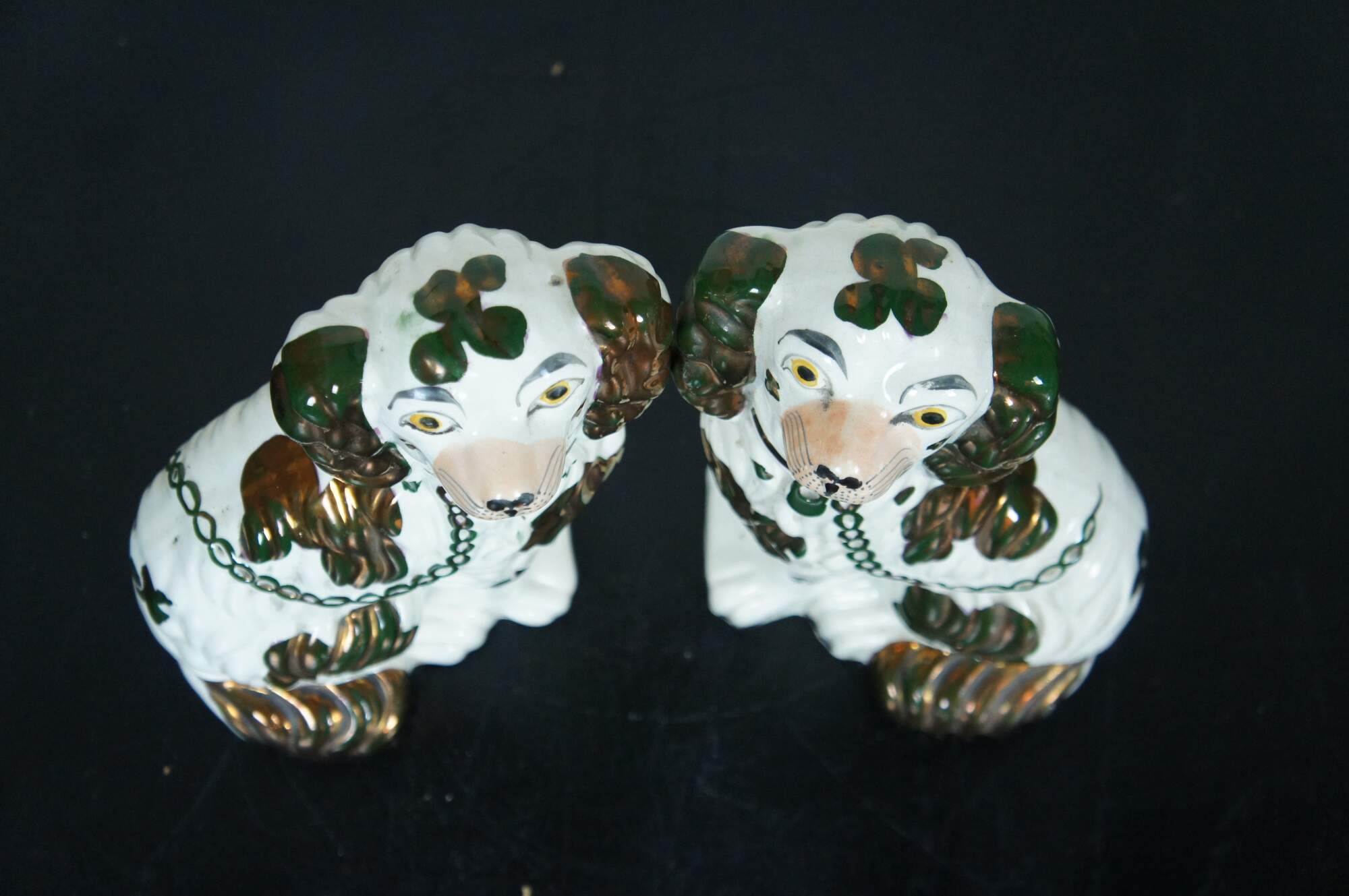 Pair of late 19th century Staffordshire porcelain King Charles Spaniels / mantel dogs. White with painted features and brown lusterware spots, collar, and chain. Molded number 2 on base.