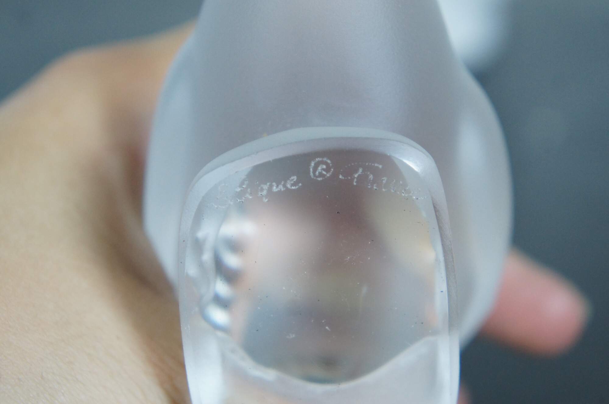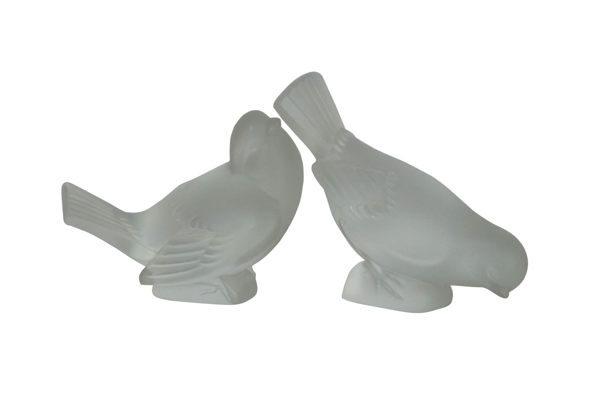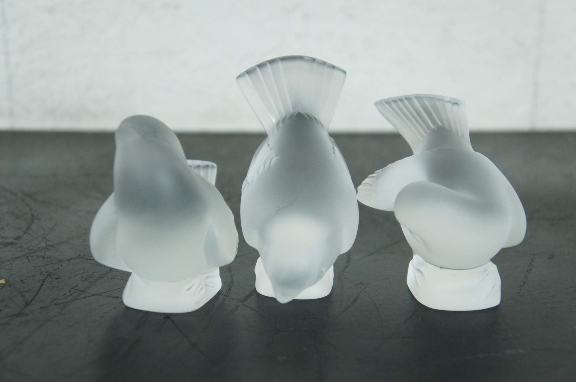 Set of three late 20th century Lalique frosted / satin crystal Moineaux (Sparrows), figurines or paperweights in the shape of small birds in different poses. Set includes: Hardi (Bold - head down), Moquer (Mocking - head up), and Coquet (Coquettish - head under wing). Made in France. Signed on base.