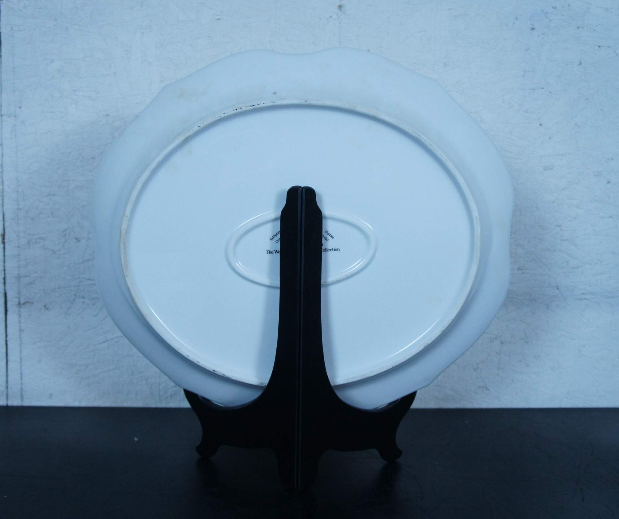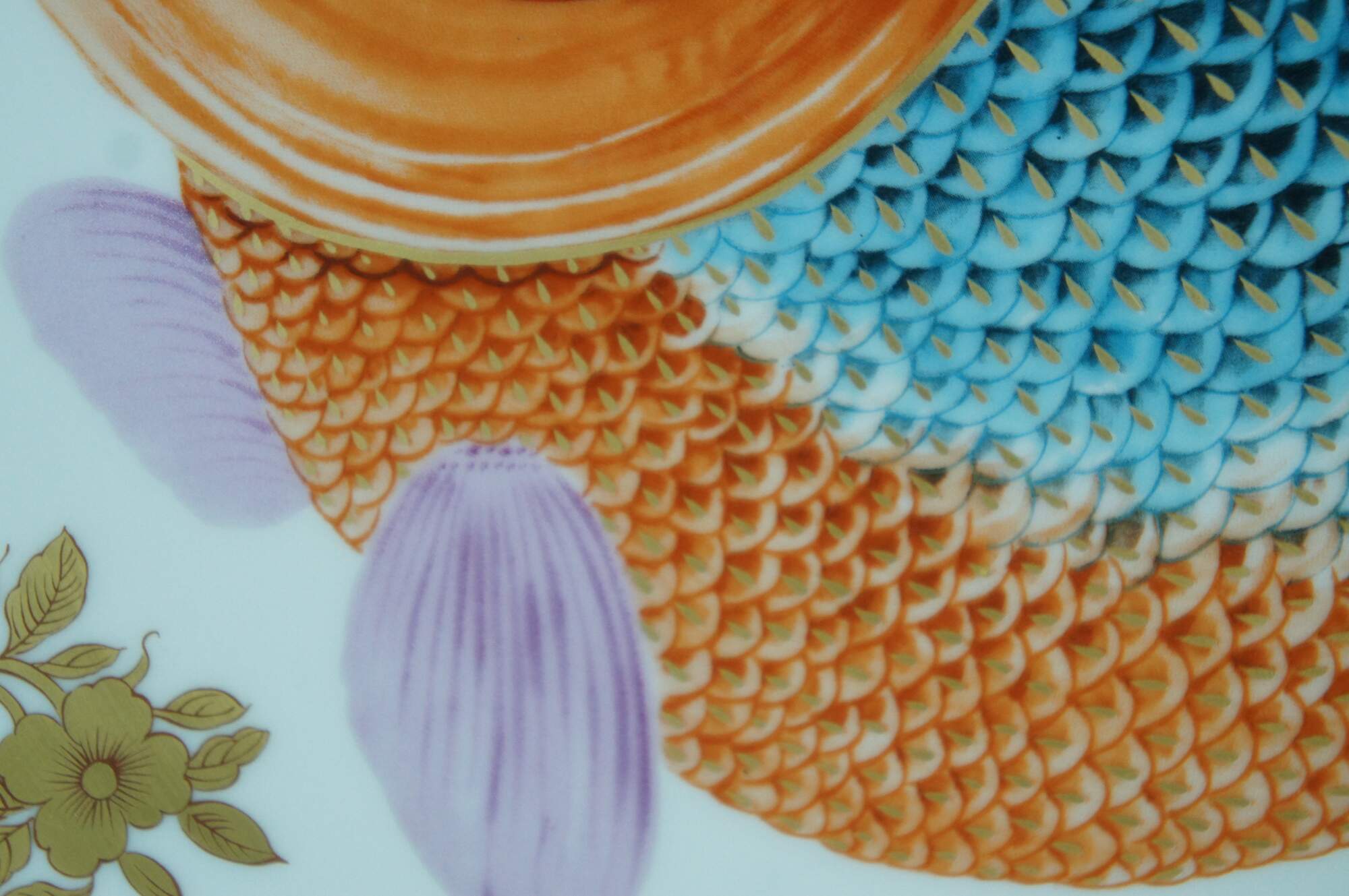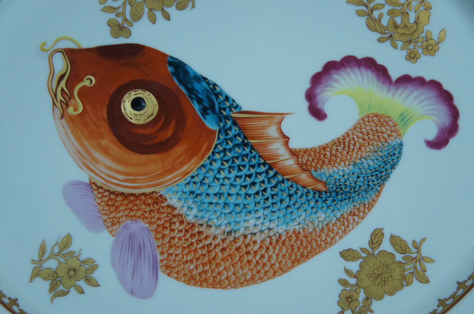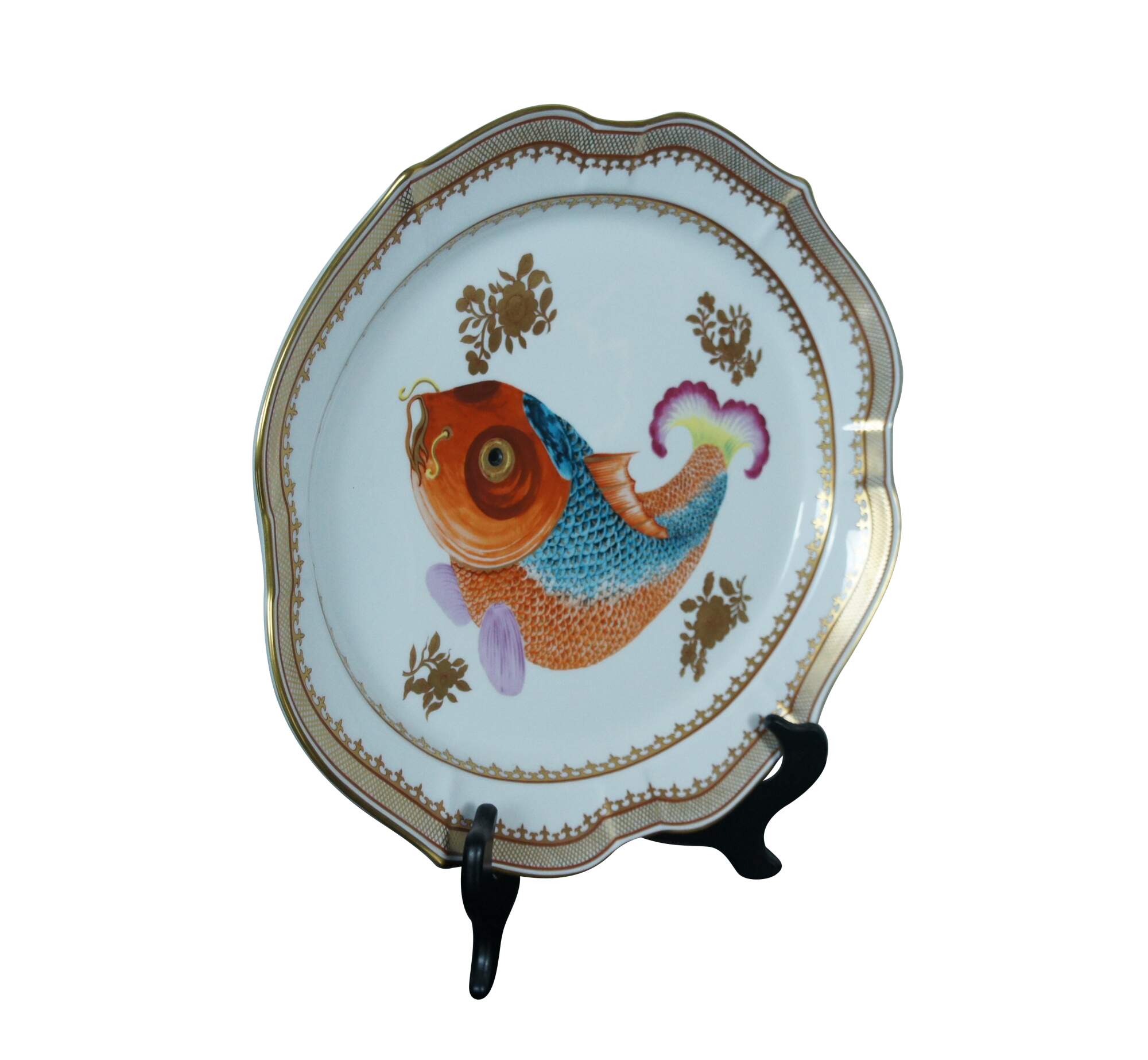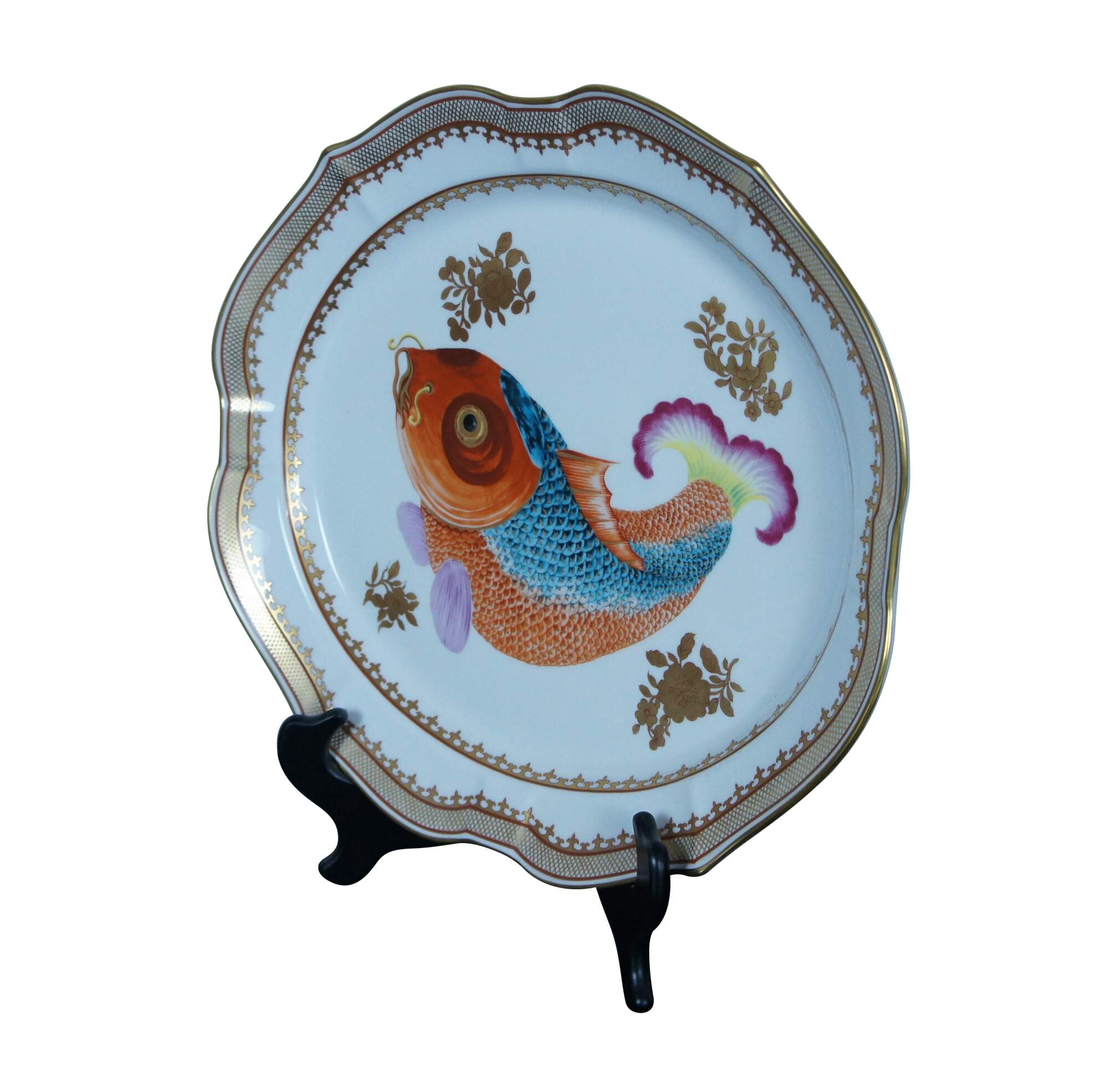 Large porcelain serving platter; oval with scalloped edges, painted / gilded border around gilt flowers and a brightly colored carp / koi / gold fish. "Adaptation of Chinese Export Platter - Chien Lung Dynasty Circa 1750-60 - Dallas Museum of Art - The Wendy & Emery Reves Collection." Produced by Mottahedeh and Vista Alegre. Includes folding wood stand for display.