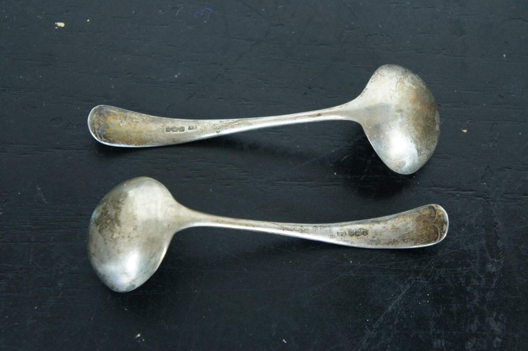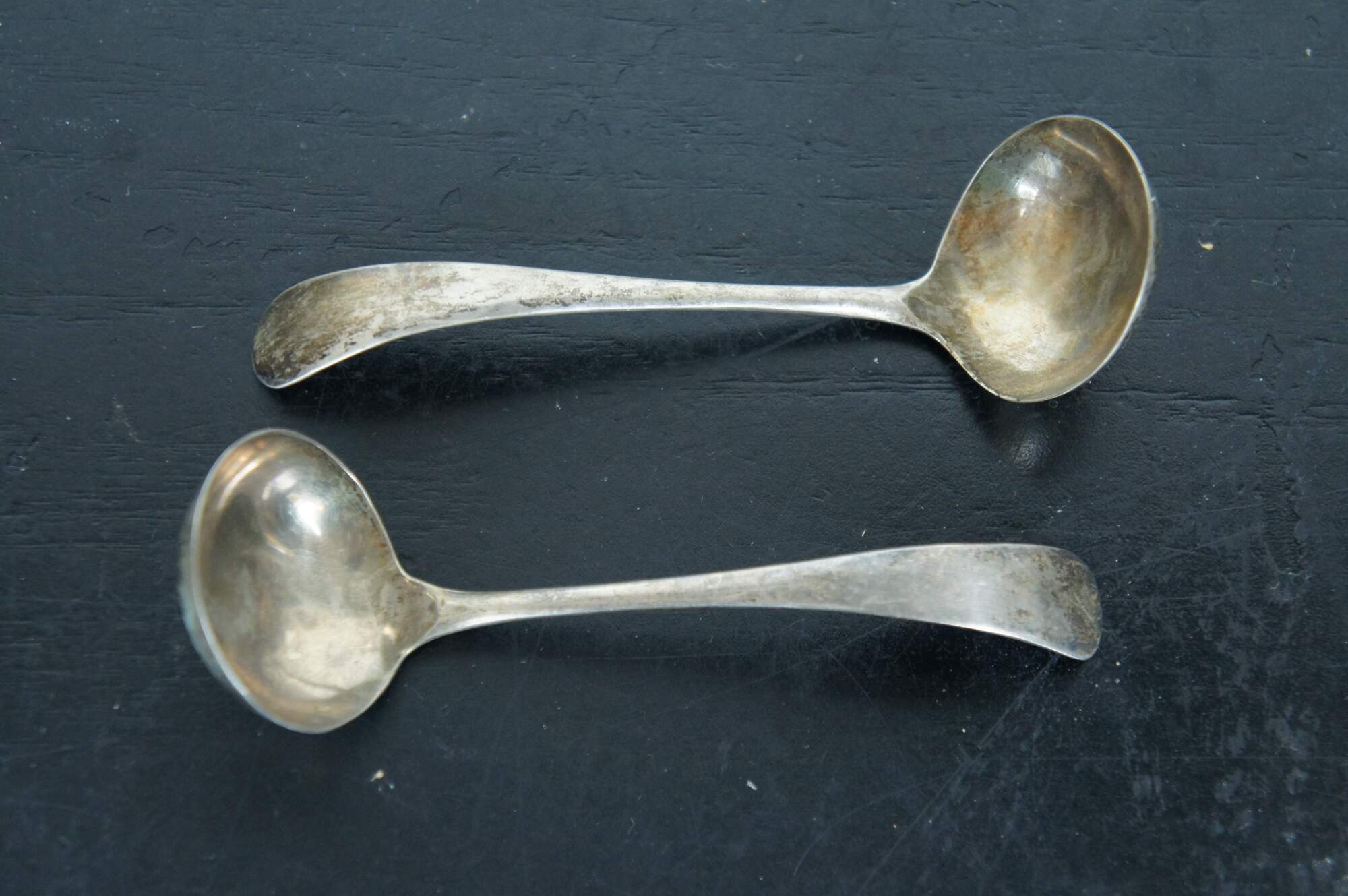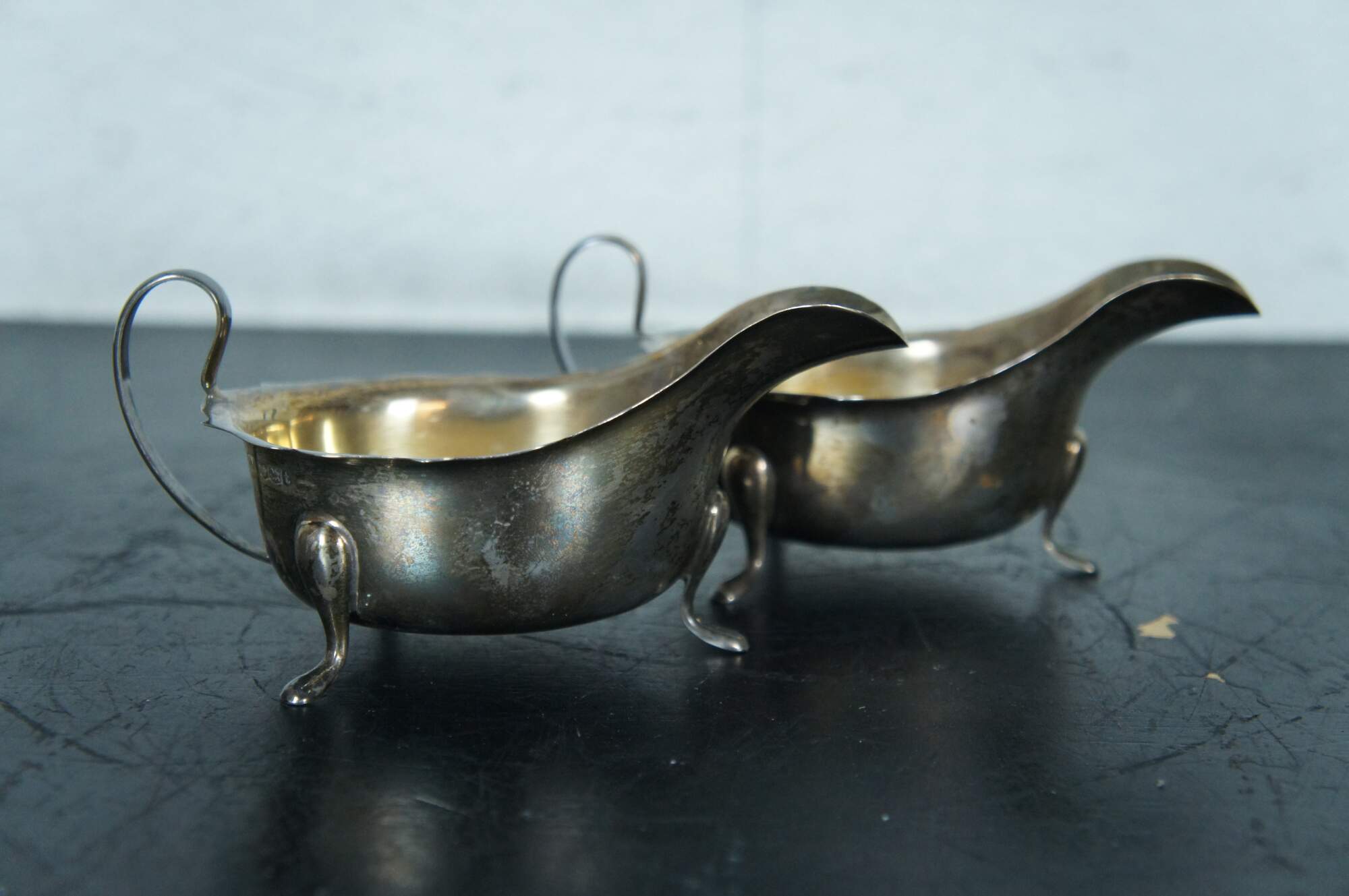Antique 1936 four piece Sheffield sterling silver gravy boat and sauce ladle set by Edward Viners Ltd. Includes two gravy / sauce boats with pad feet and scalloped rims, two ladles, plus a storage case.