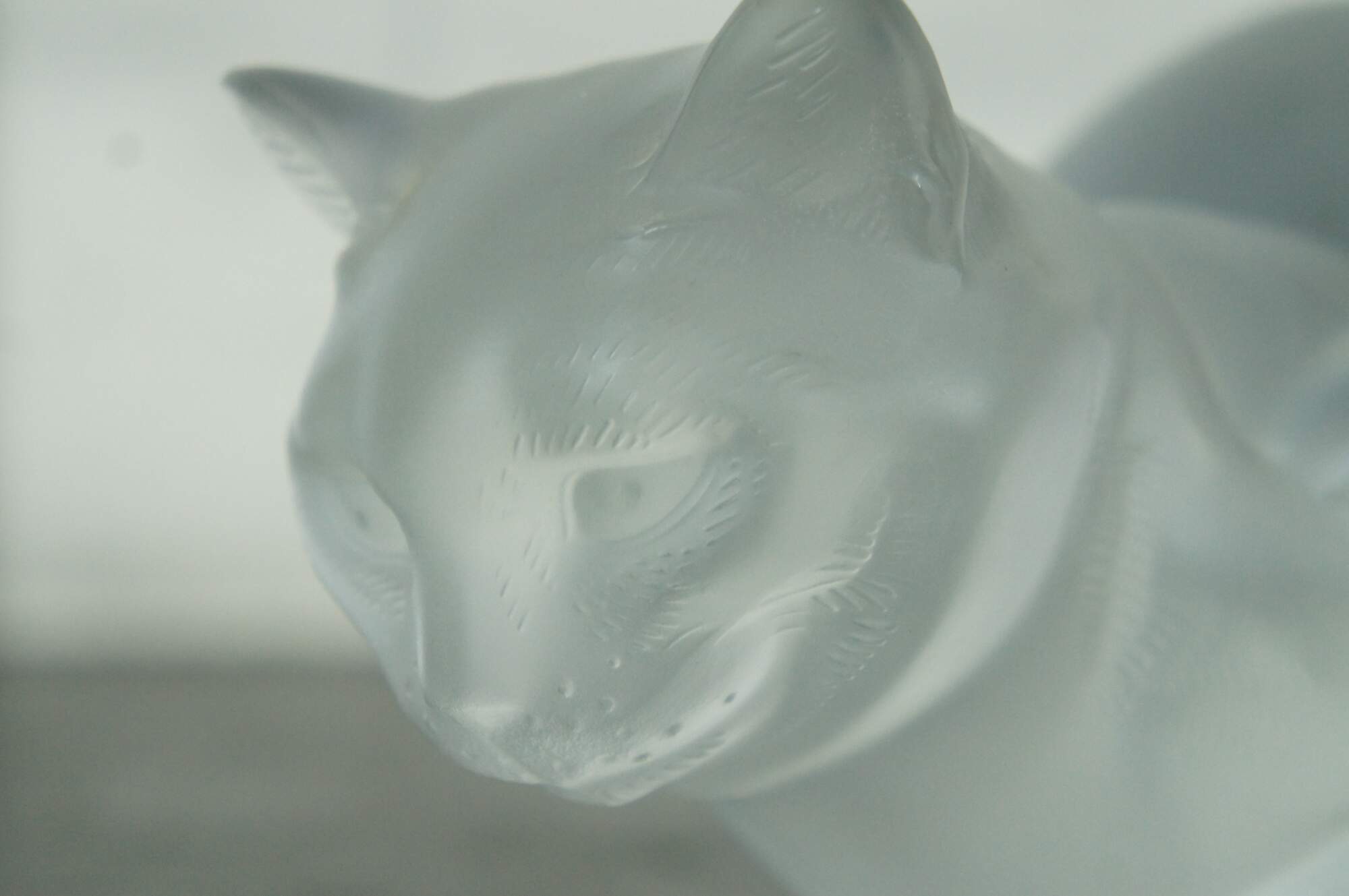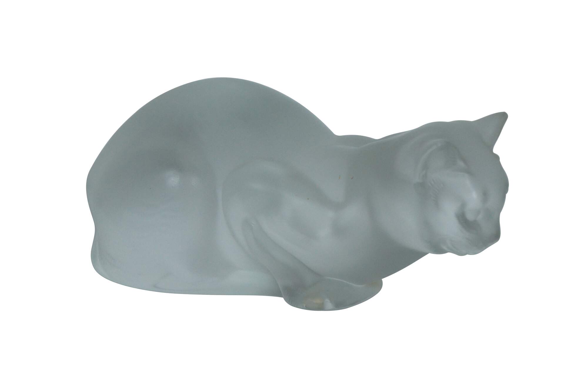 Late 20th century Lalique France frosted crystal figurine of chat crouche, a crouching cat. Signed on base.