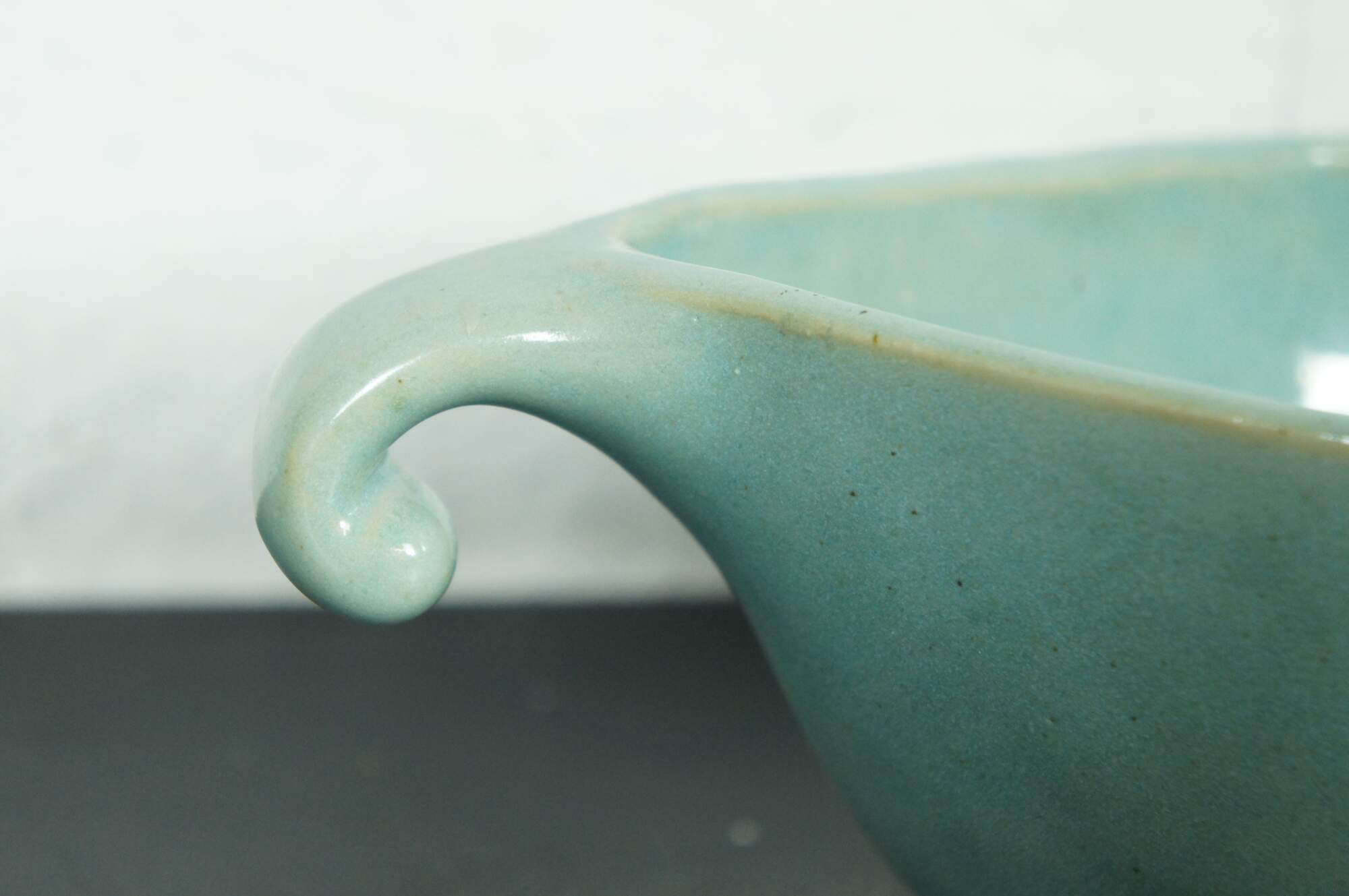 Circa mid 20th century ceramic cachepot / planter / jardiniere / urn, featuring oval Neoclassical styling with downward curling ends and footed base. Glazed in light blue / turquoise.