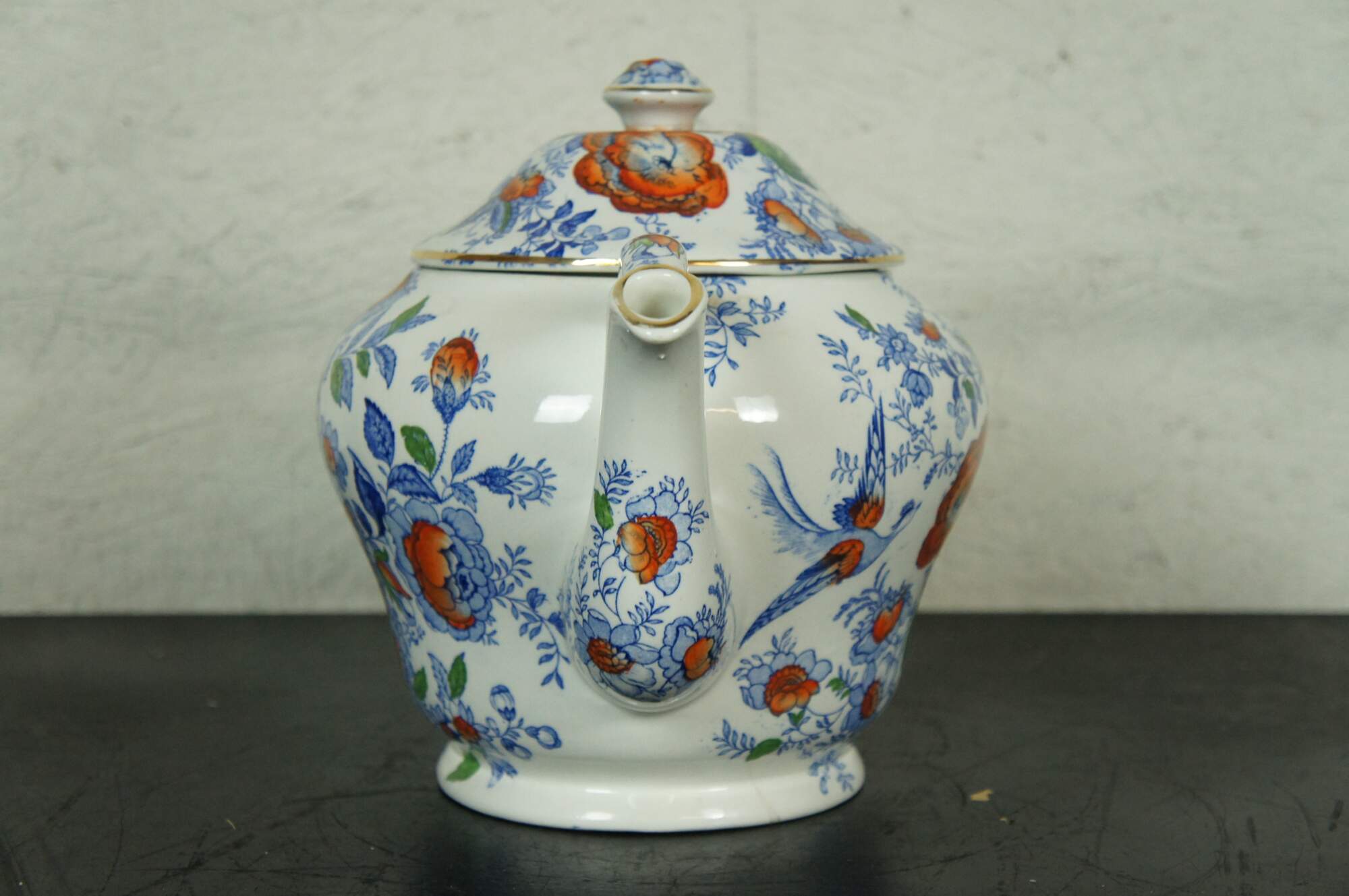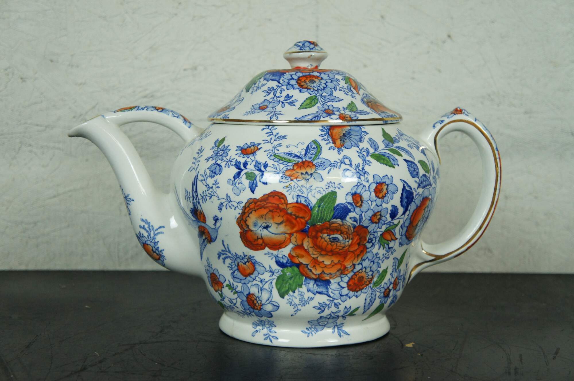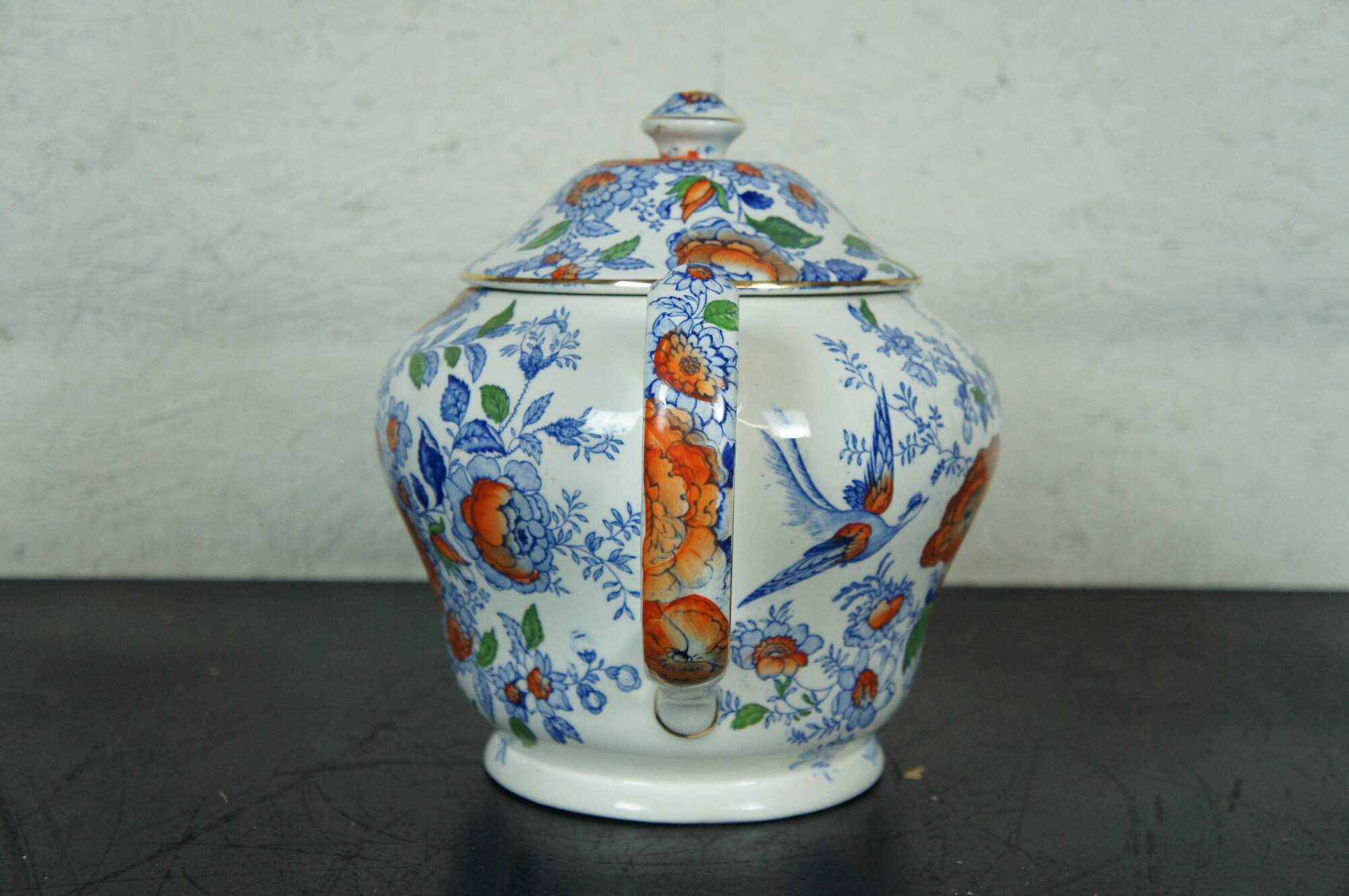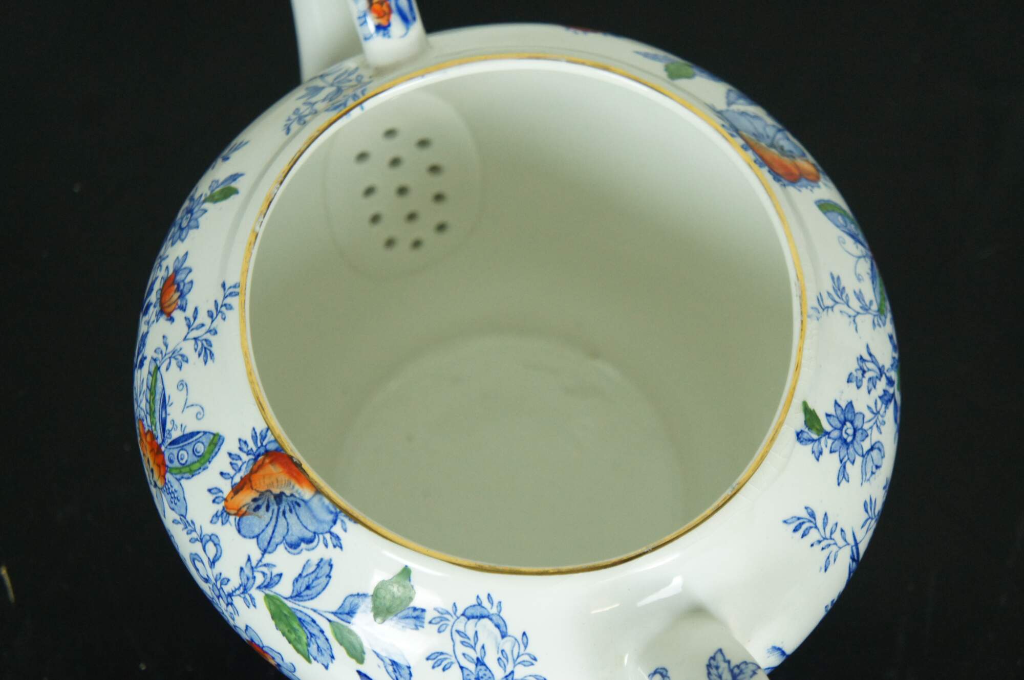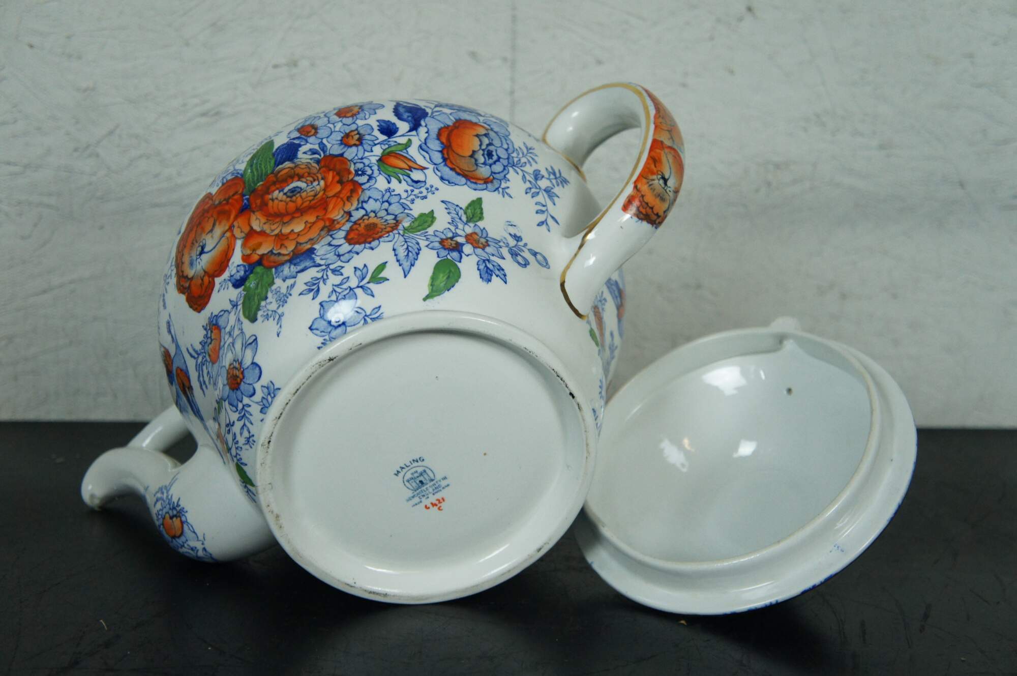 Early to mid 20th century oversized porcelain tranferware tea / coffee pot by Maling Pottery. Features a Chinoiserie design in blue and orange of flowers / chrysanthemums, birds, butterflies and gilded trim. Mark used circa 1920-1963.