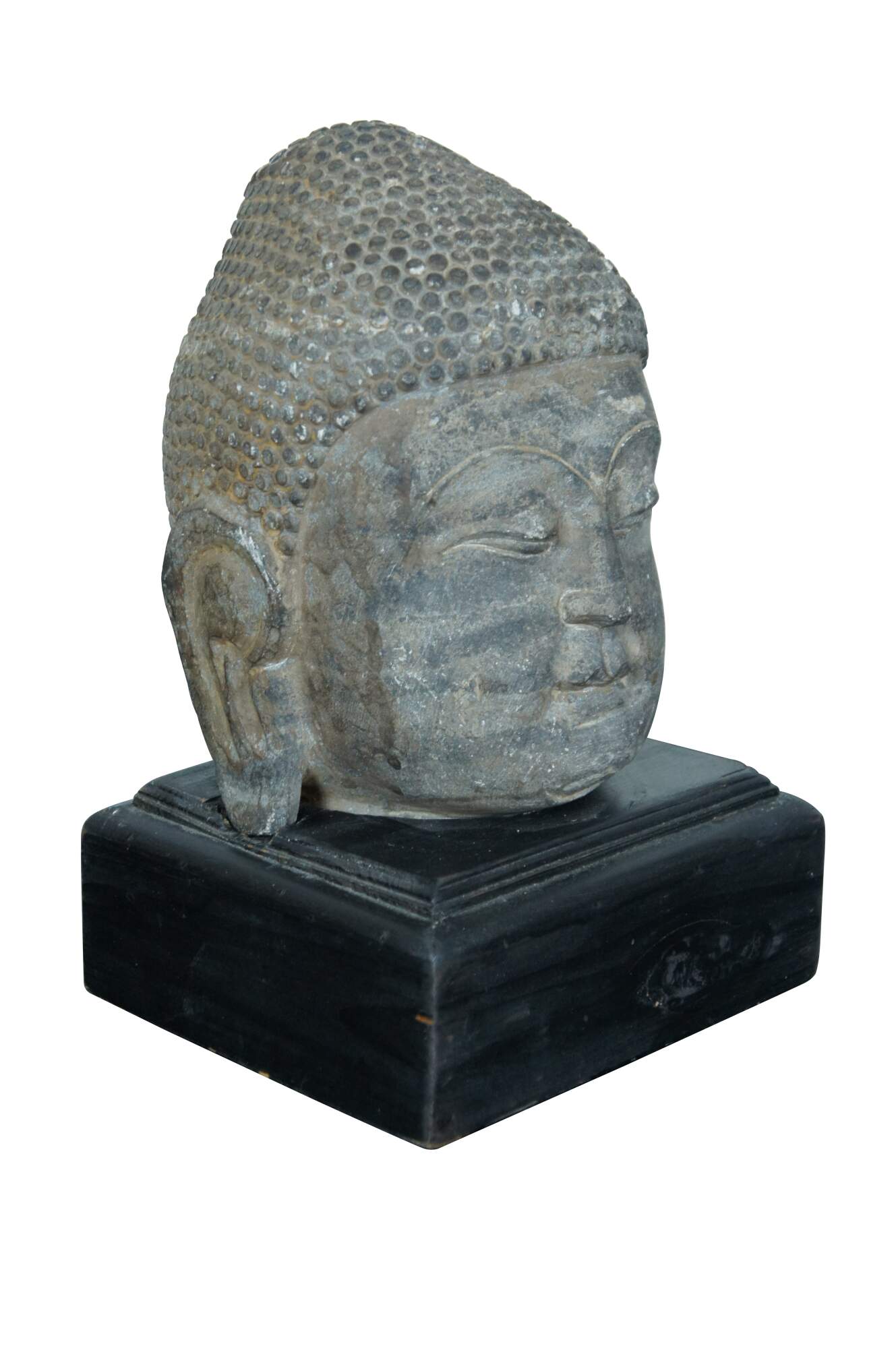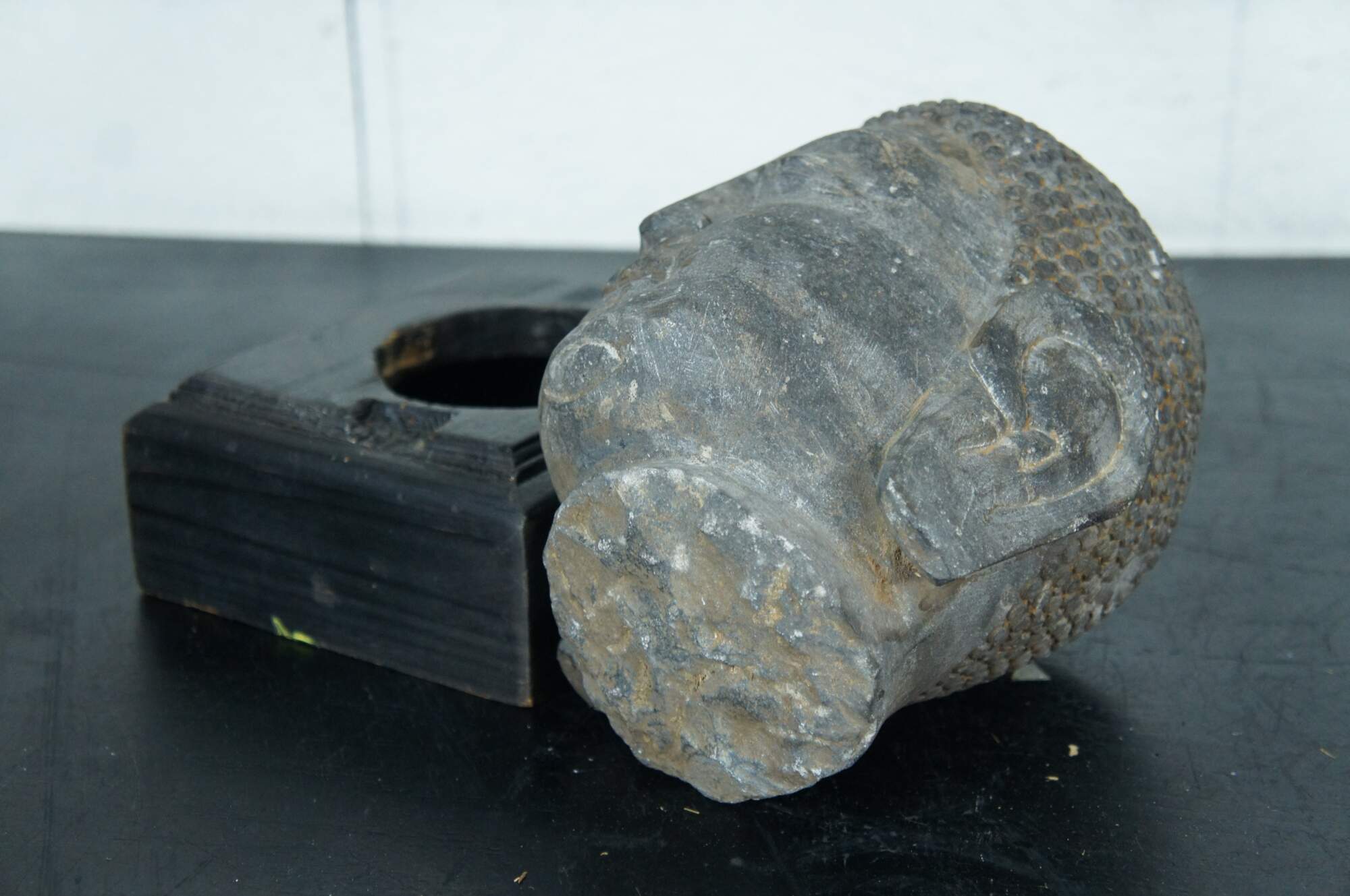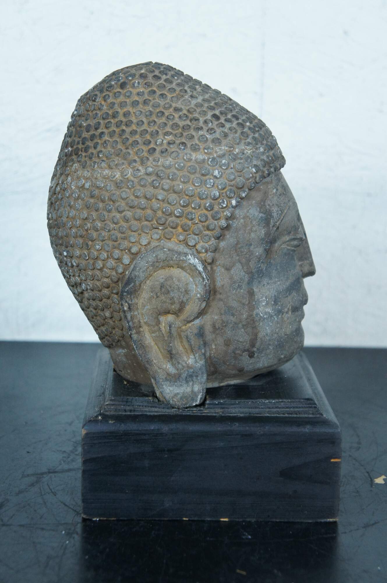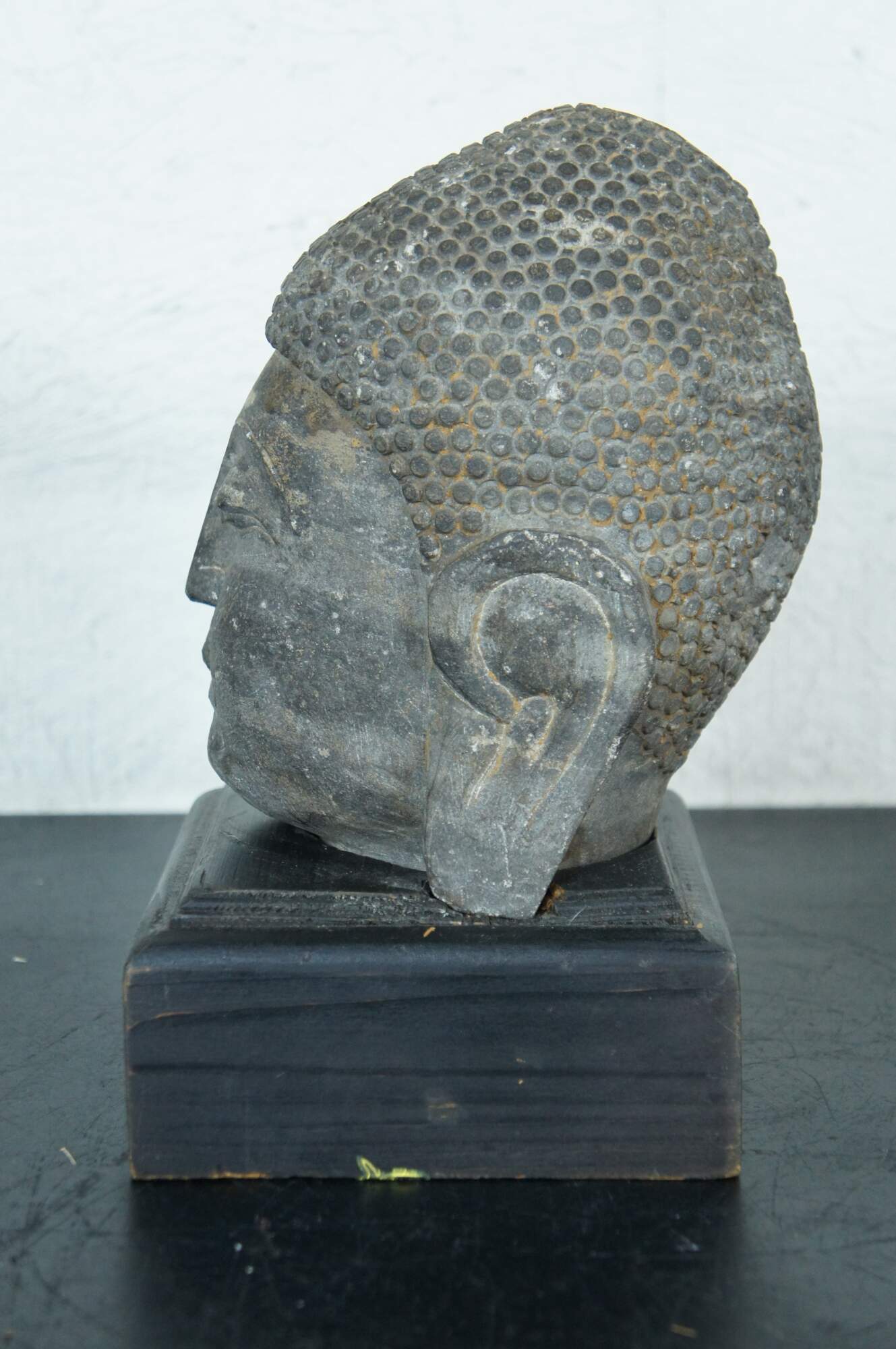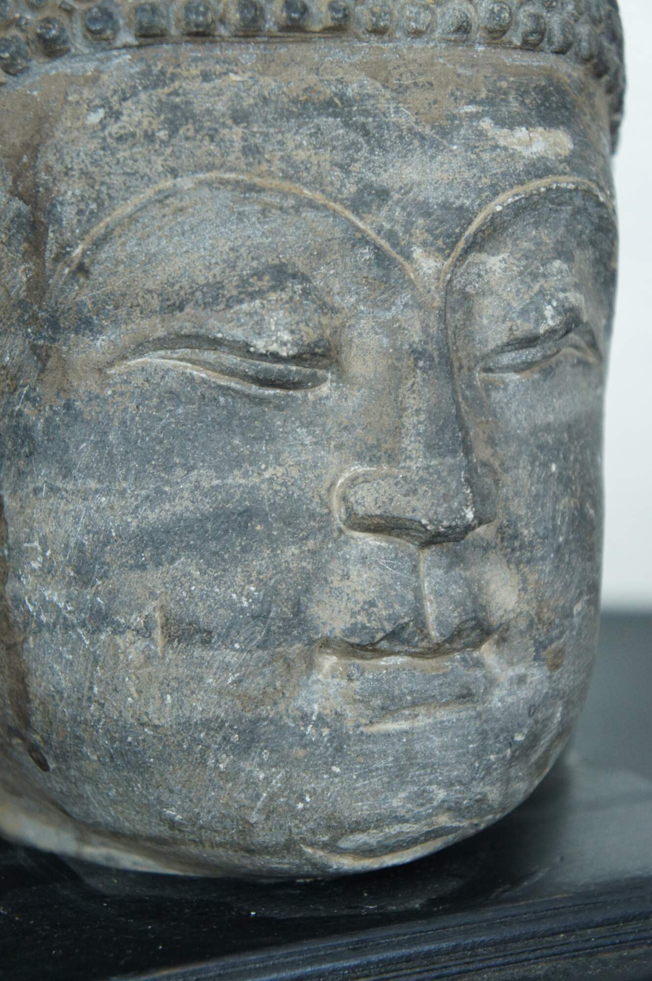 Antique carved heavy stone Buddha head sculpture / statue featuring curling hair, elongated ears, closed eyes, and slightly smiling expression. Set in a black painted wooden plinth stand.