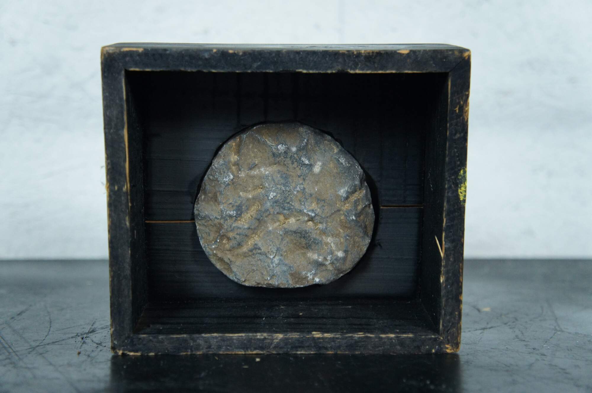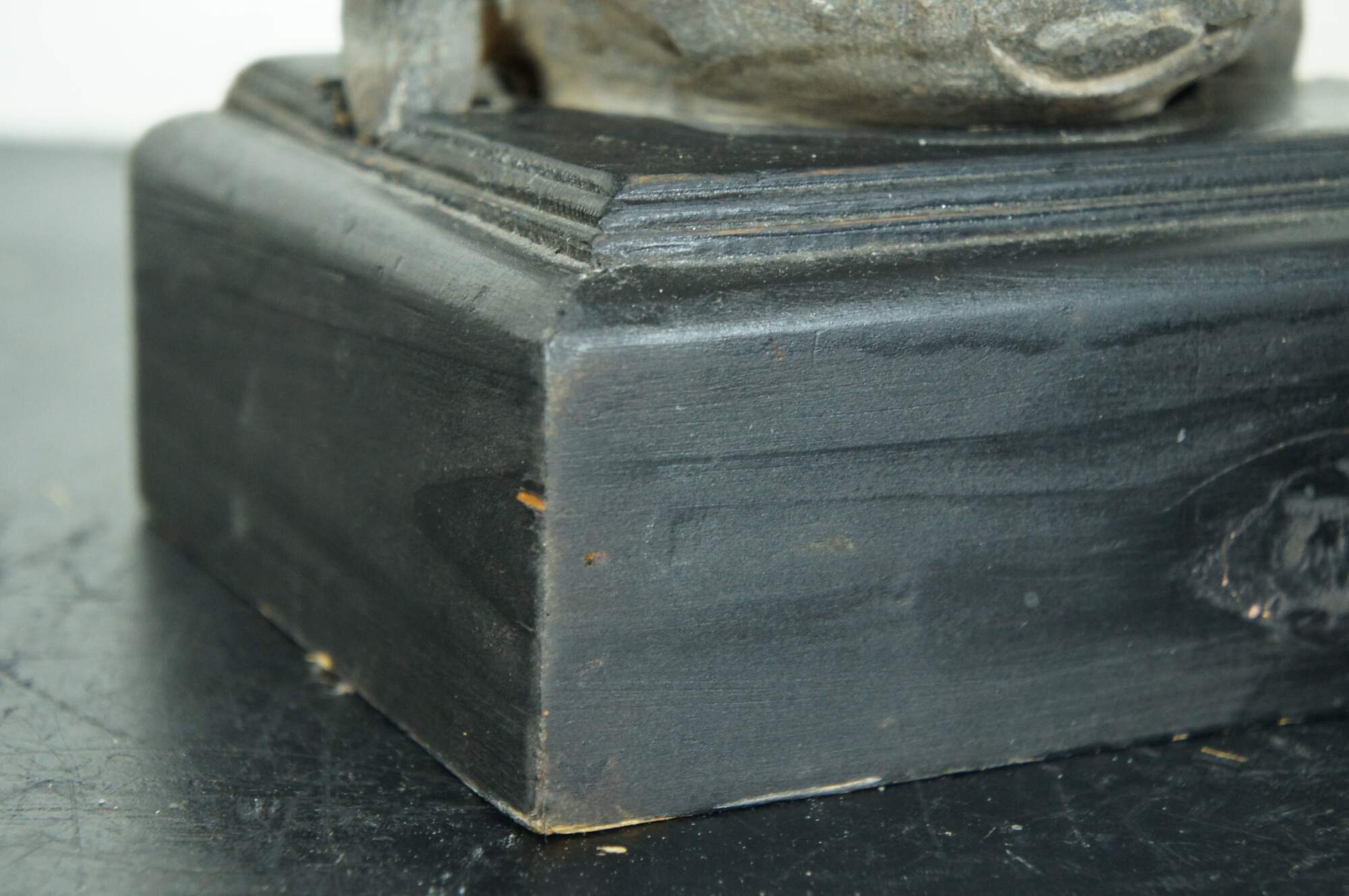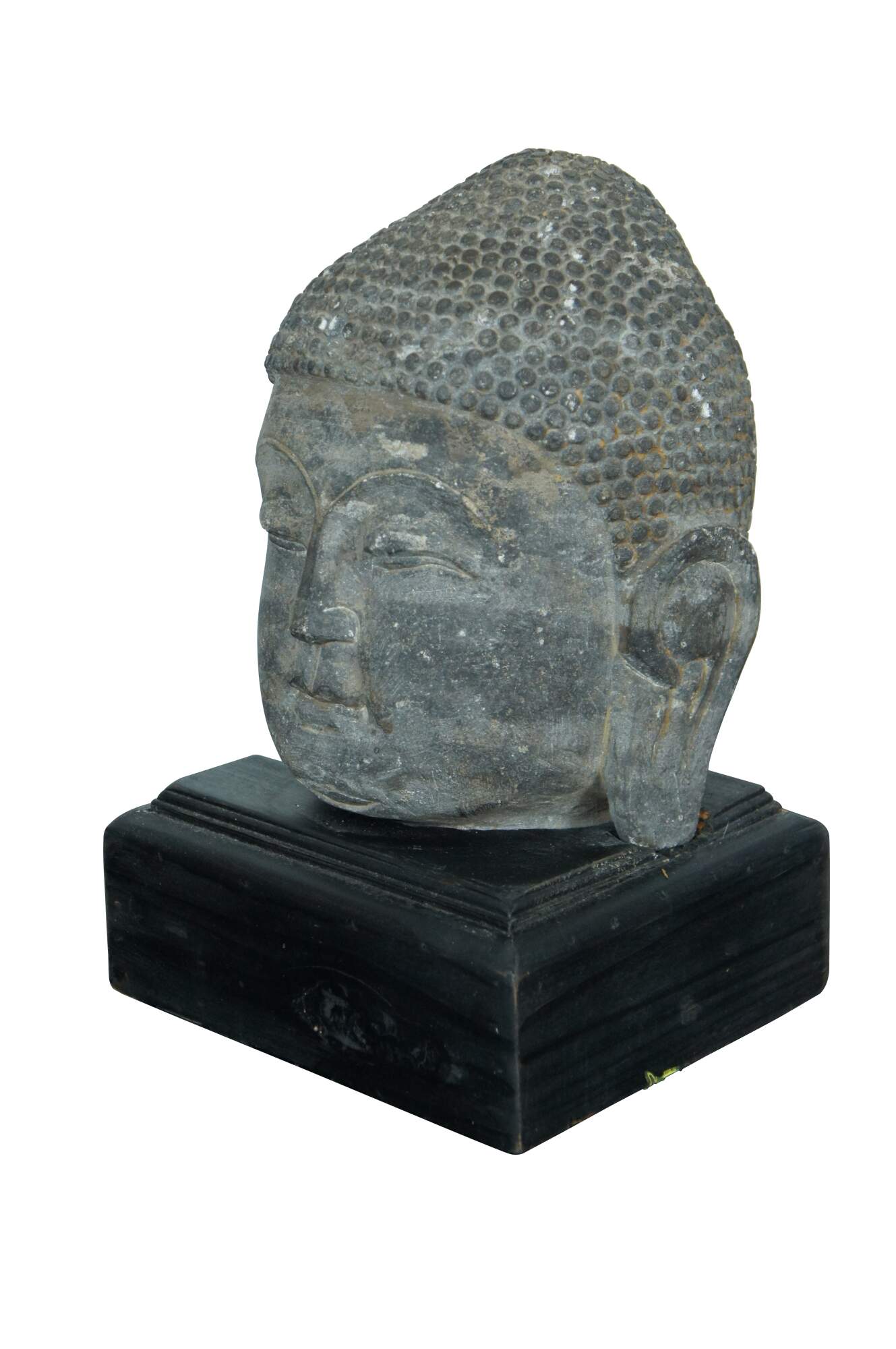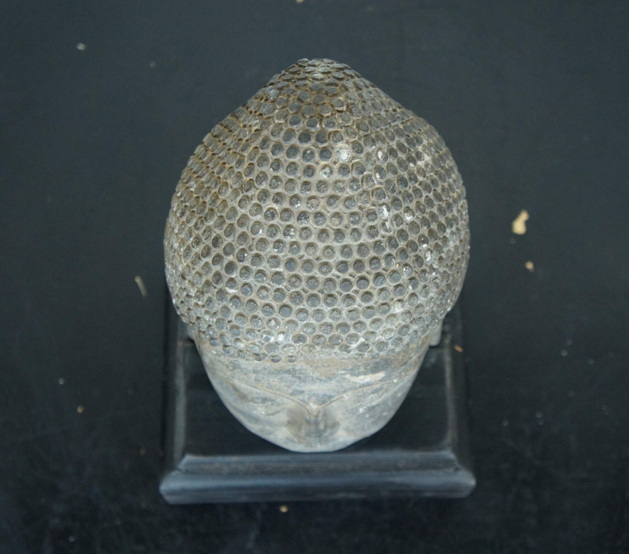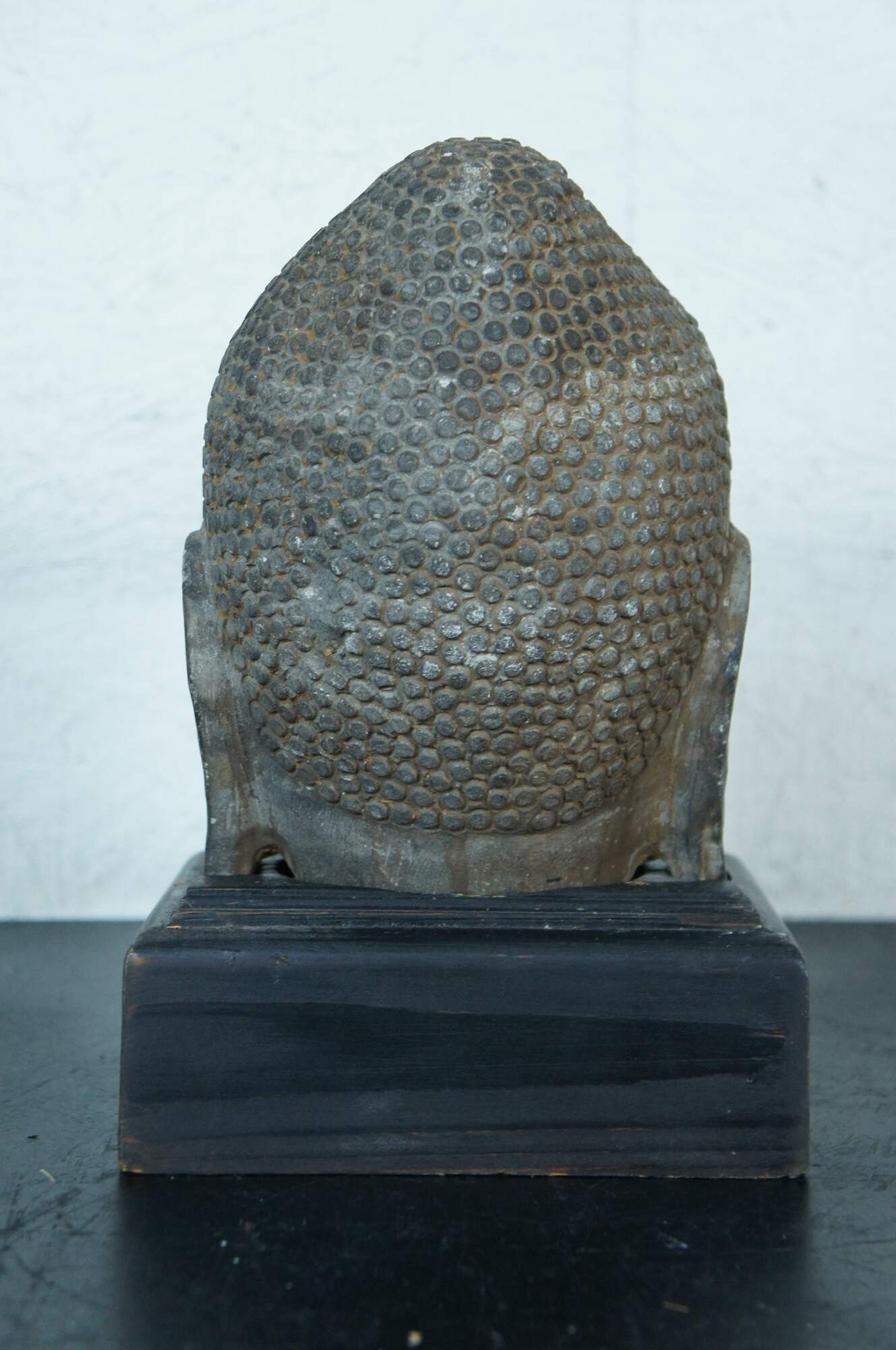 Antique carved heavy stone Buddha head sculpture / statue featuring curling hair, elongated ears, closed eyes, and slightly smiling expression. Set in a black painted wooden plinth stand.