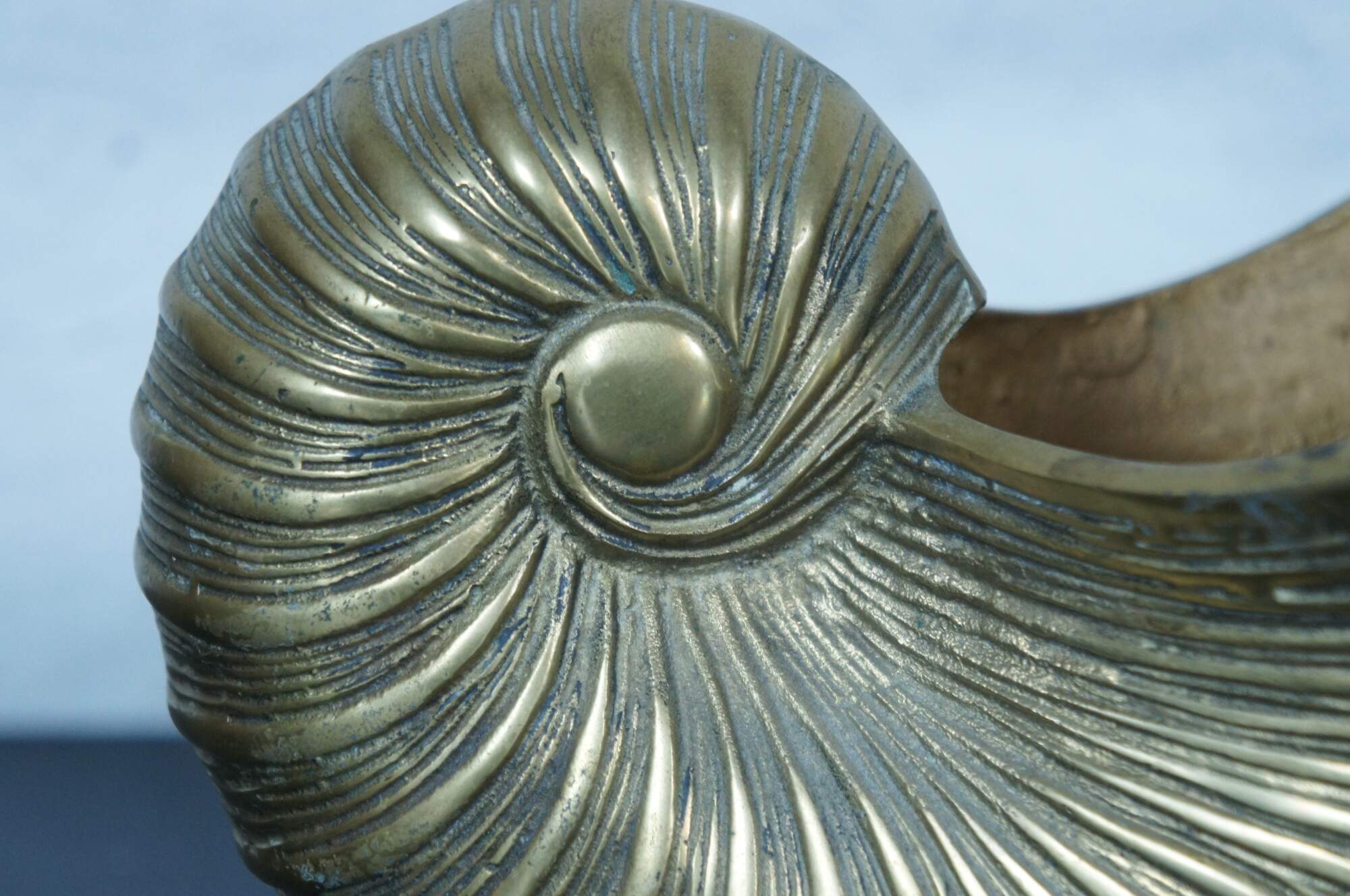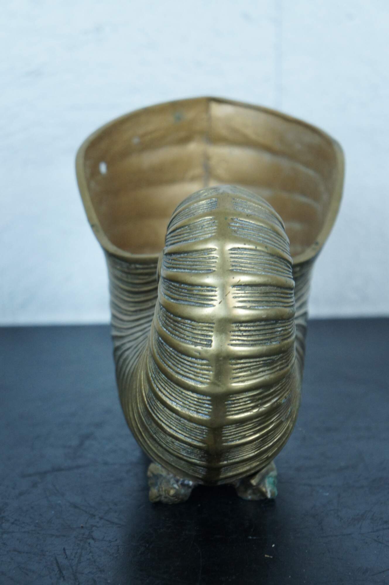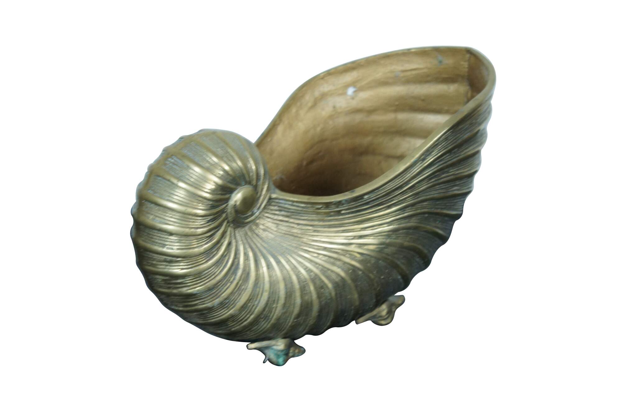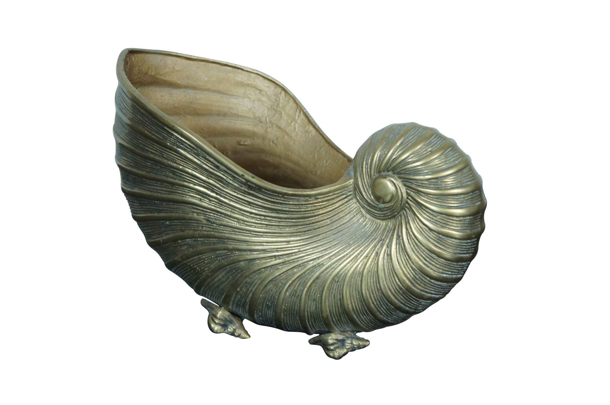 A large and impressive mid 20th century Hollywood Regency solid brass planter / jardiniere / catchpot / centerpiece in the shape of a nautilus / spiral sea shell with conch shell feet.