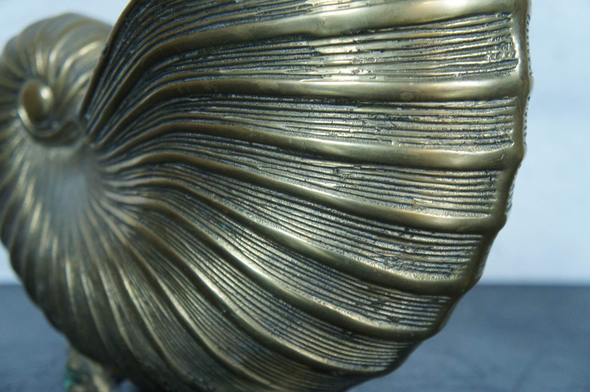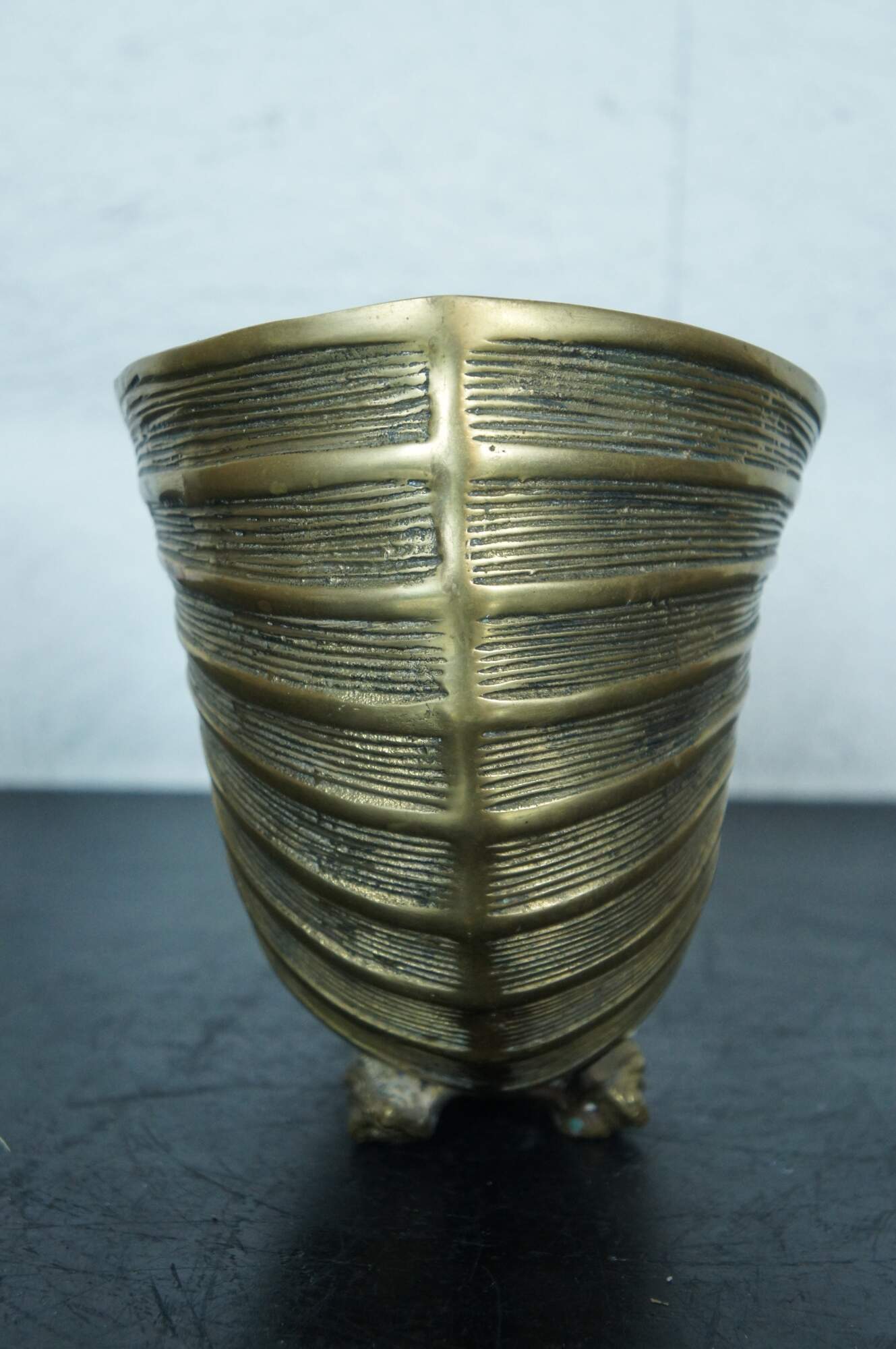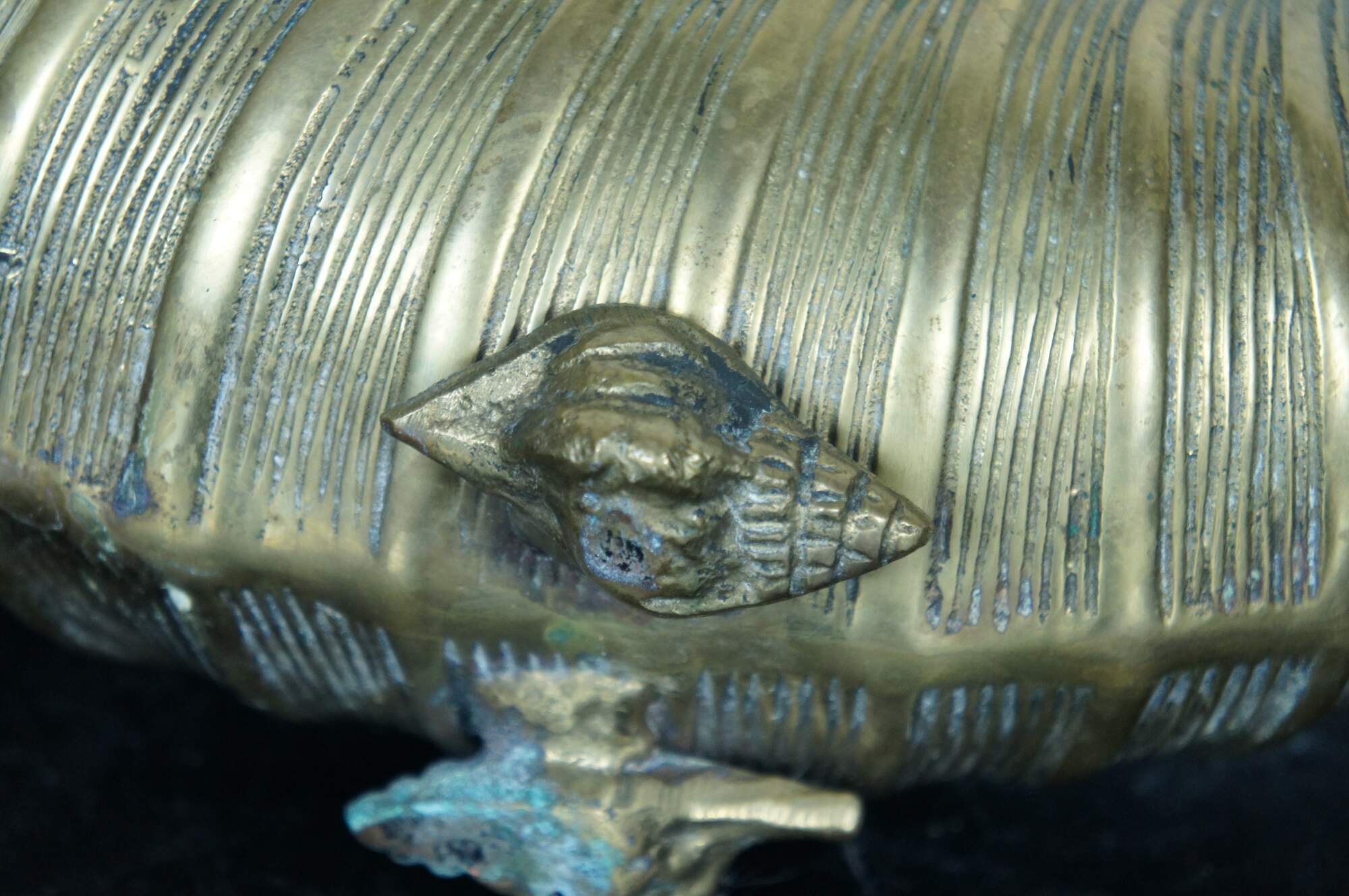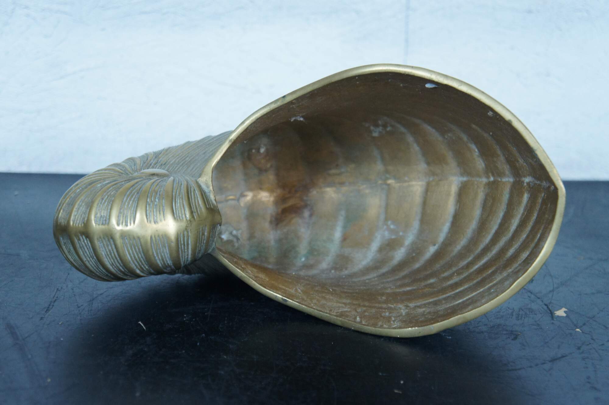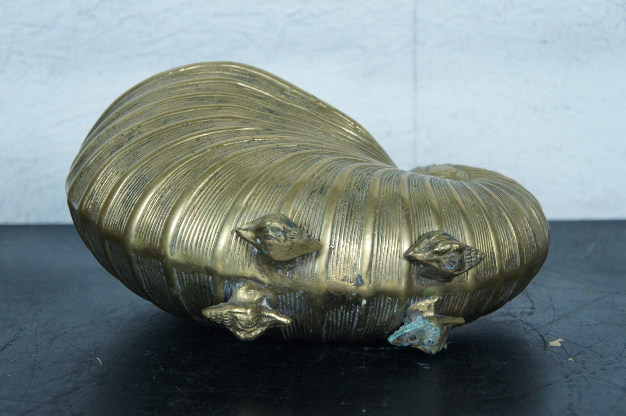 A large and impressive mid 20th century Hollywood Regency solid brass planter / jardiniere / catchpot / centerpiece in the shape of a nautilus / spiral sea shell with conch shell feet.