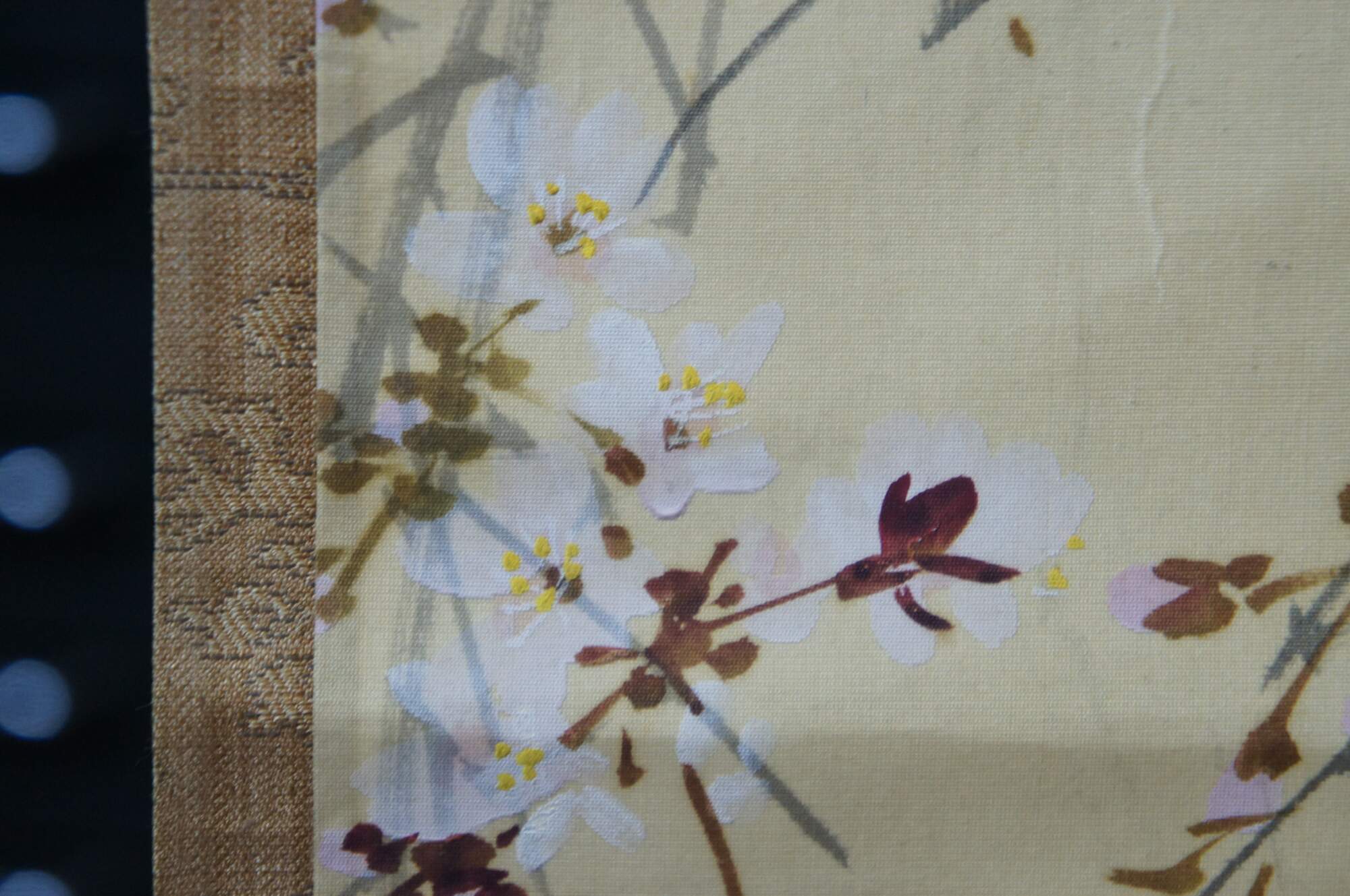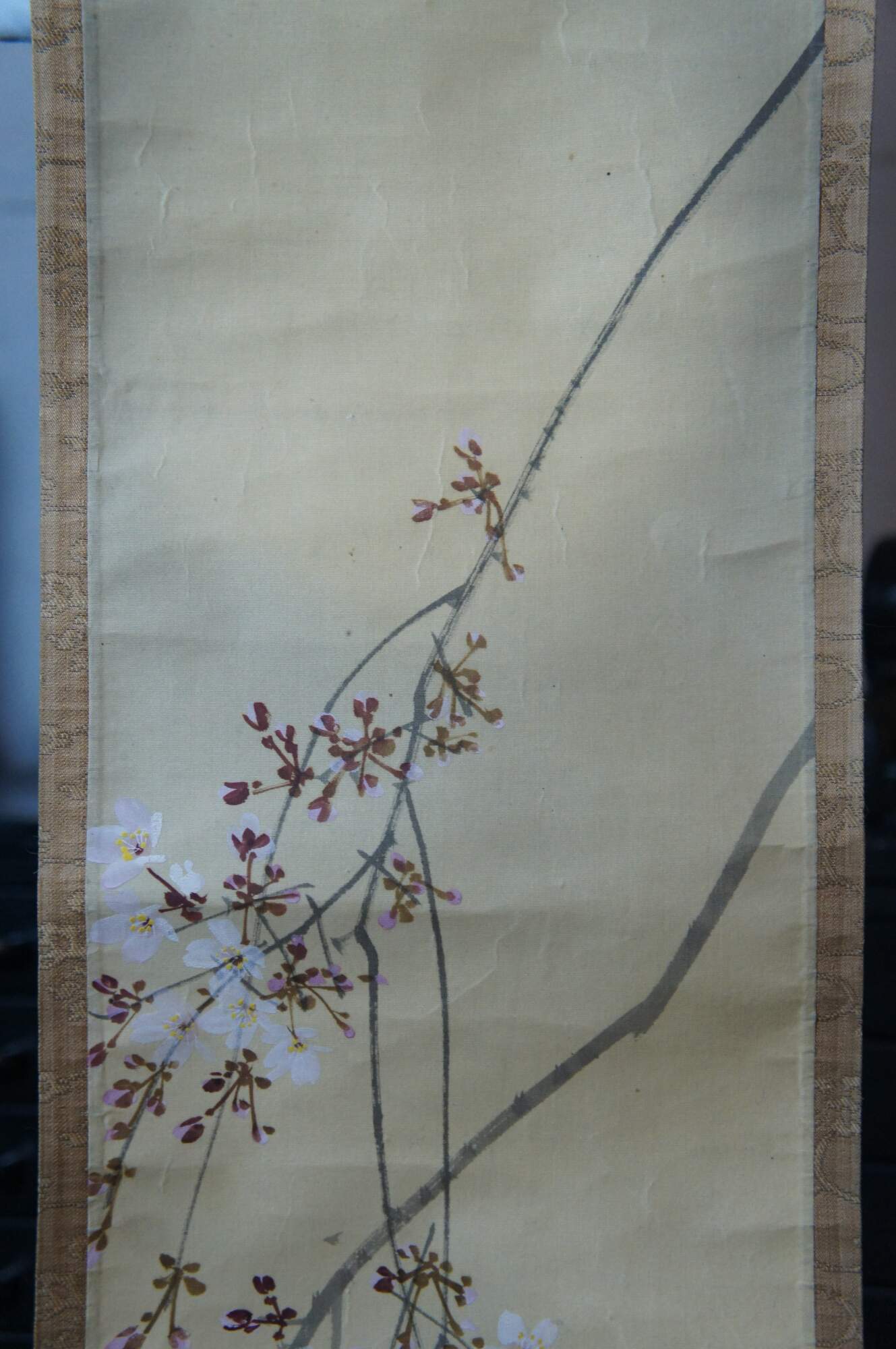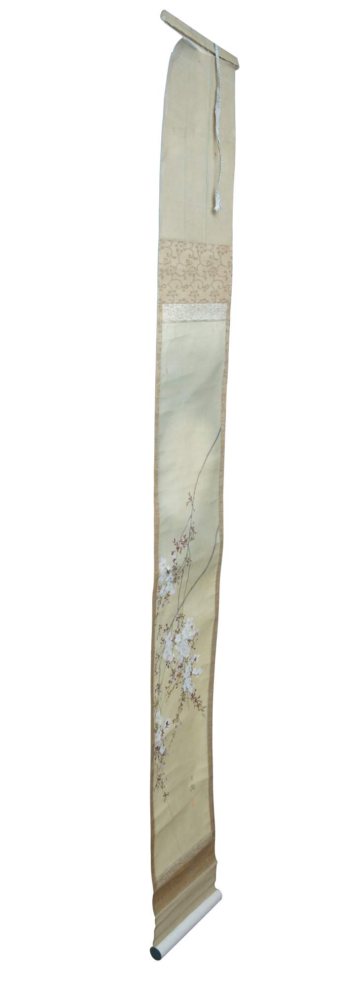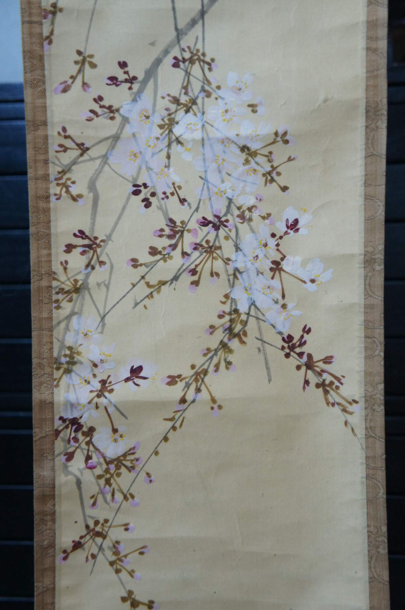 Early 20th century Japanese watercolor painting on silk, wall hanging scroll, showing branches of cherry blossoms. Signed lower right.