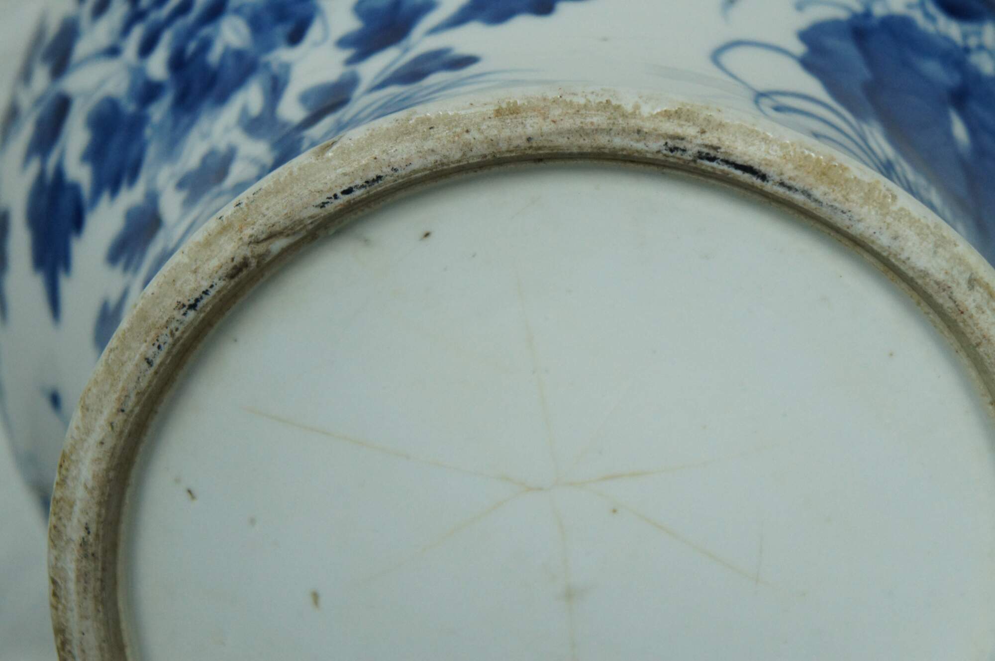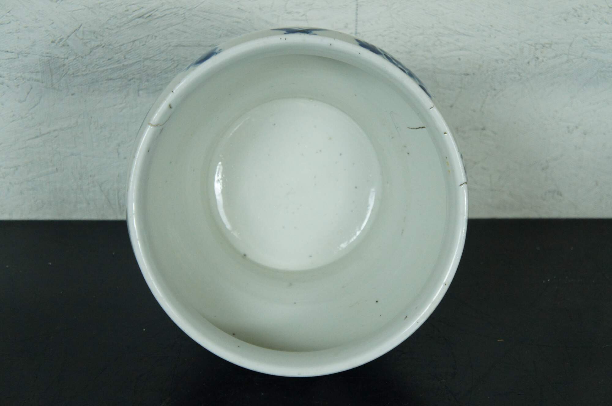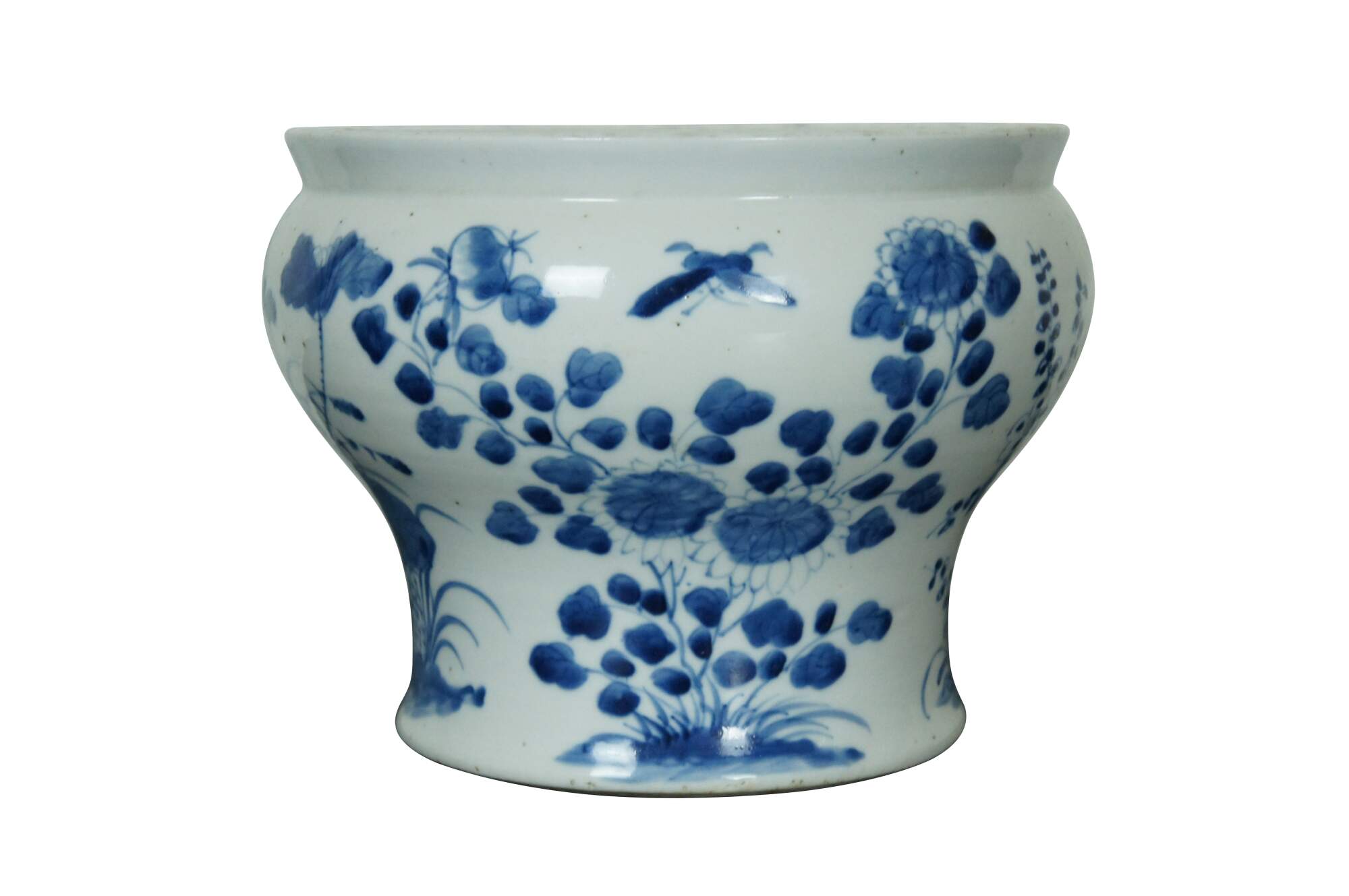 Circa early 20th century blue and white Chinese porcelain fish bowl / planter, round with a cinched / tapered base, decorated with flowering bushes, shrubs, and butterflies.