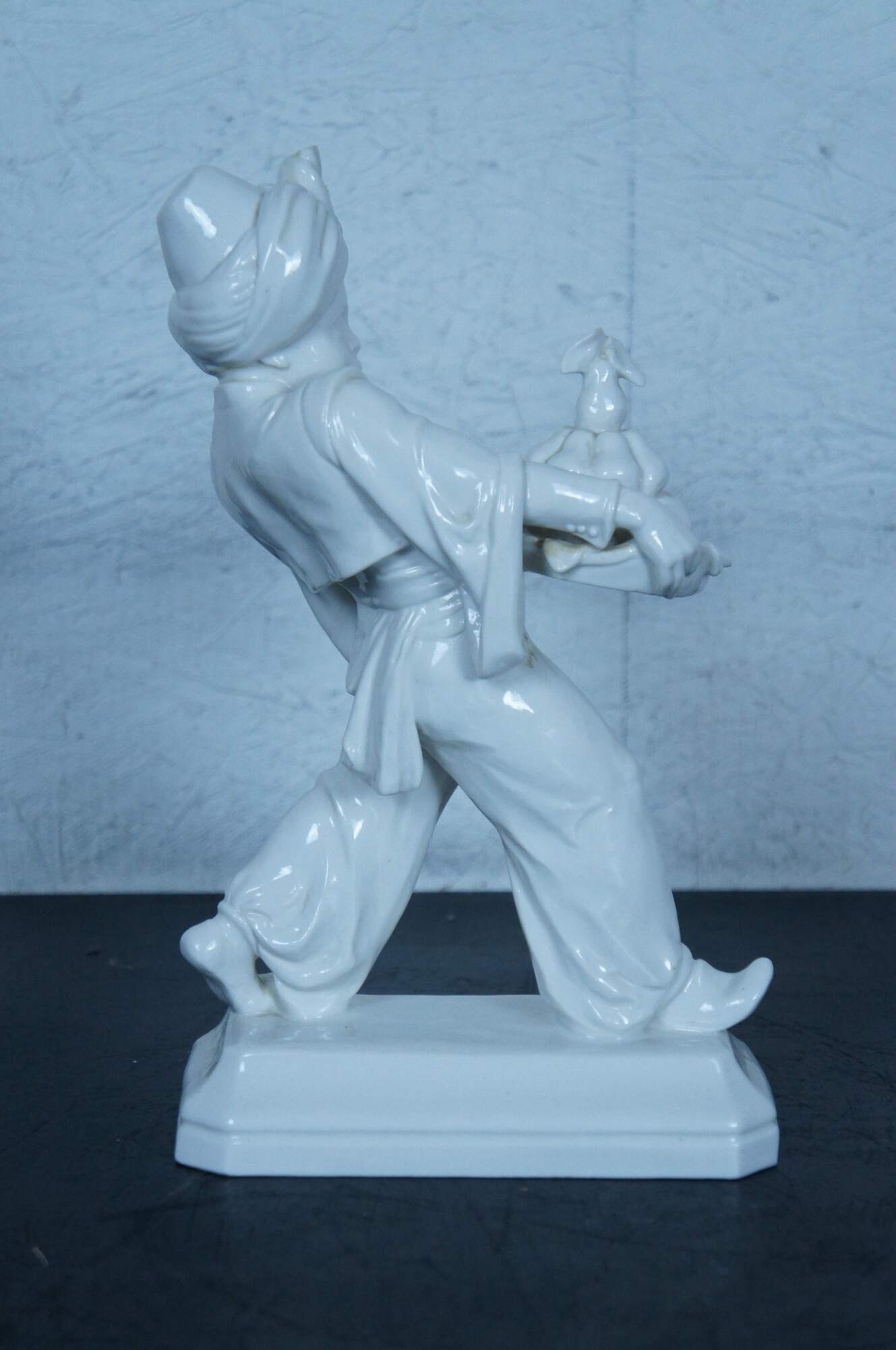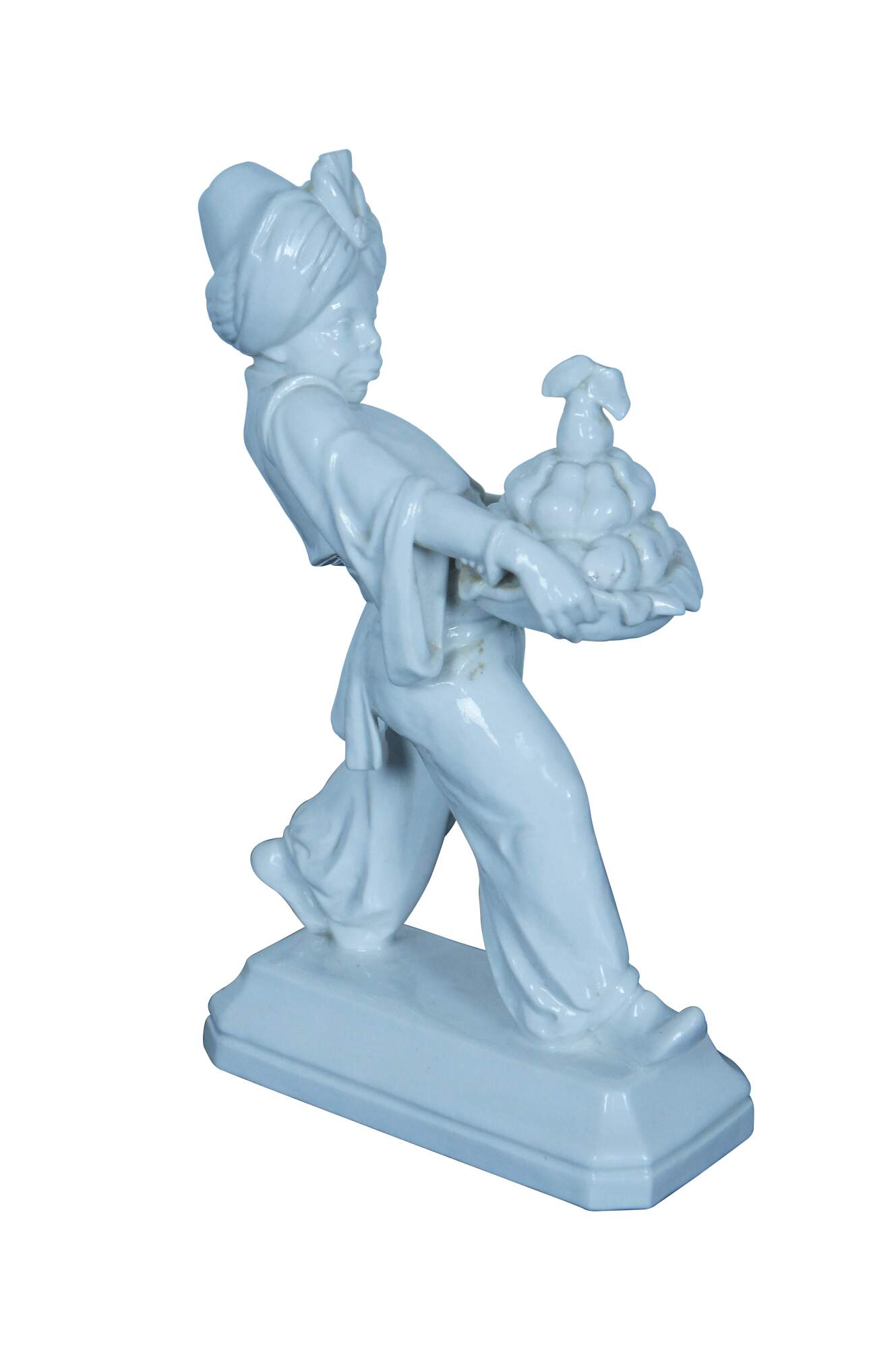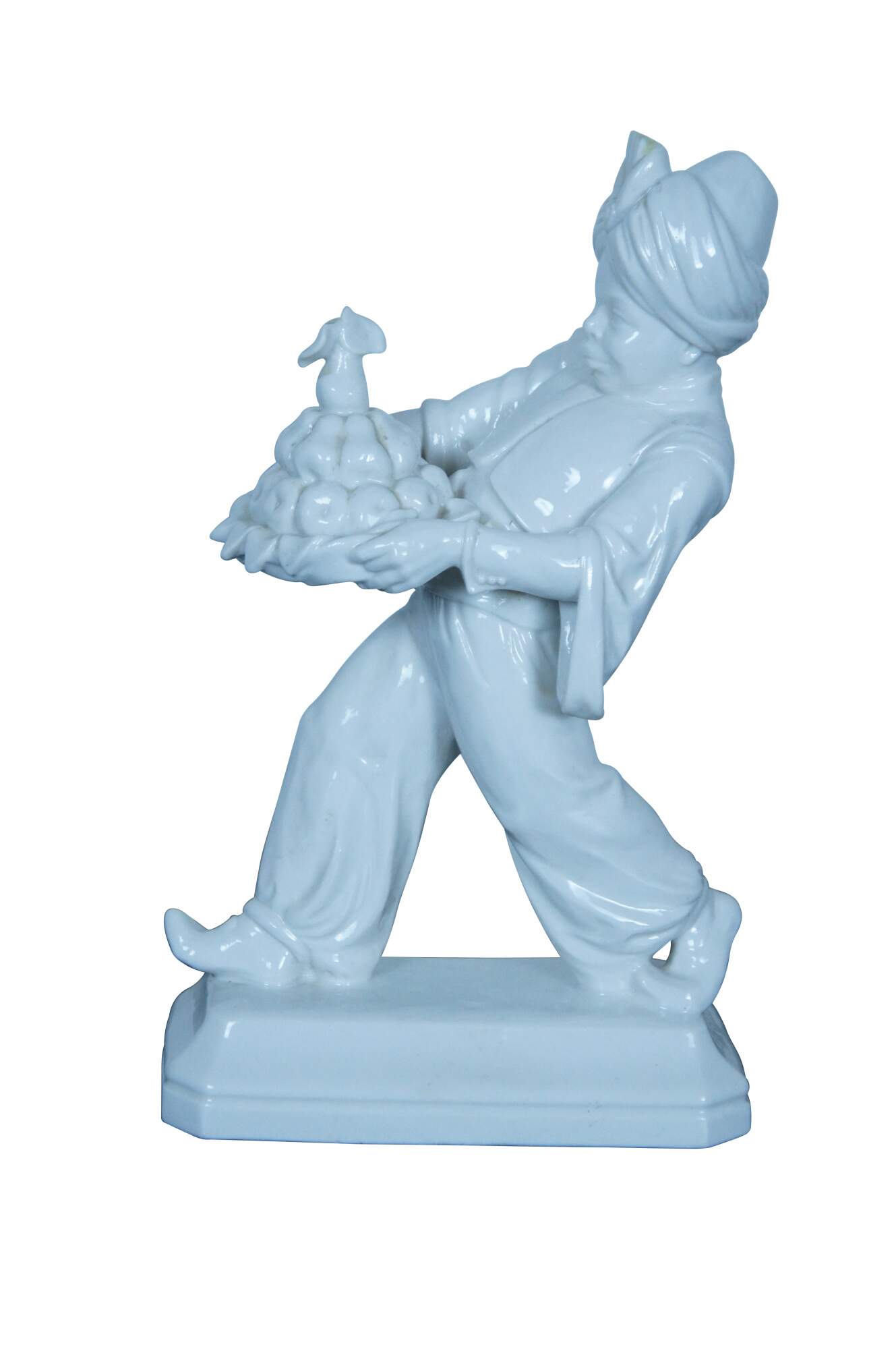 Antique circa 1936 white porcelain statue / figurine of a moor / Turk carrying a tray of fruit by Hugo Meisel (German sculptor/artist, 1887-1966). Produced by Schwarzburger Werkstatten fur Porcellankunst.