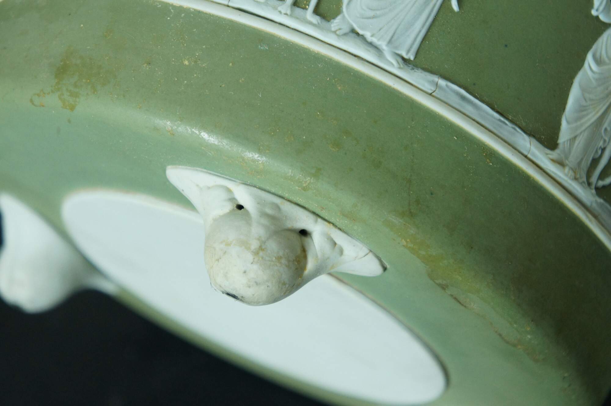 Rare antique Wedgwood England jasperware planter / cachpot / jardiniere. White on green jasperware featuring Wedgwood's traditional neoclassical array of figures and trees below a band morning glories. Cylindrical form with ball feet. Marked 1/1 on base.