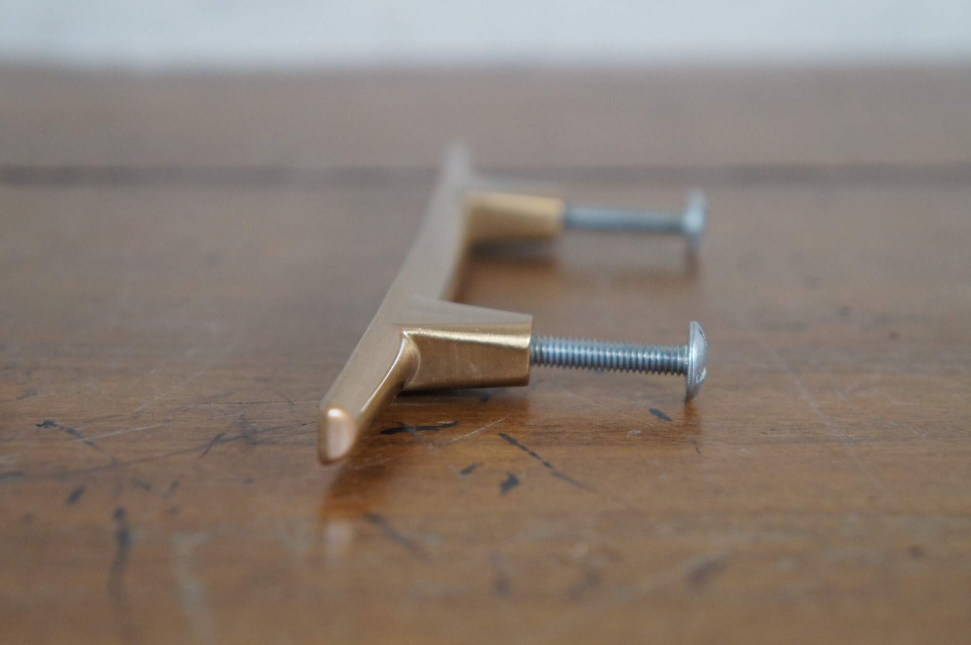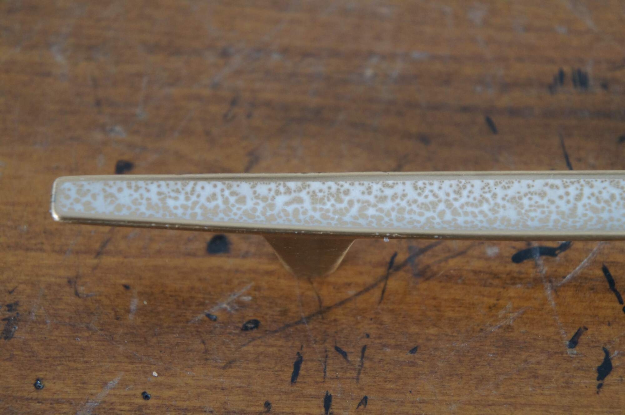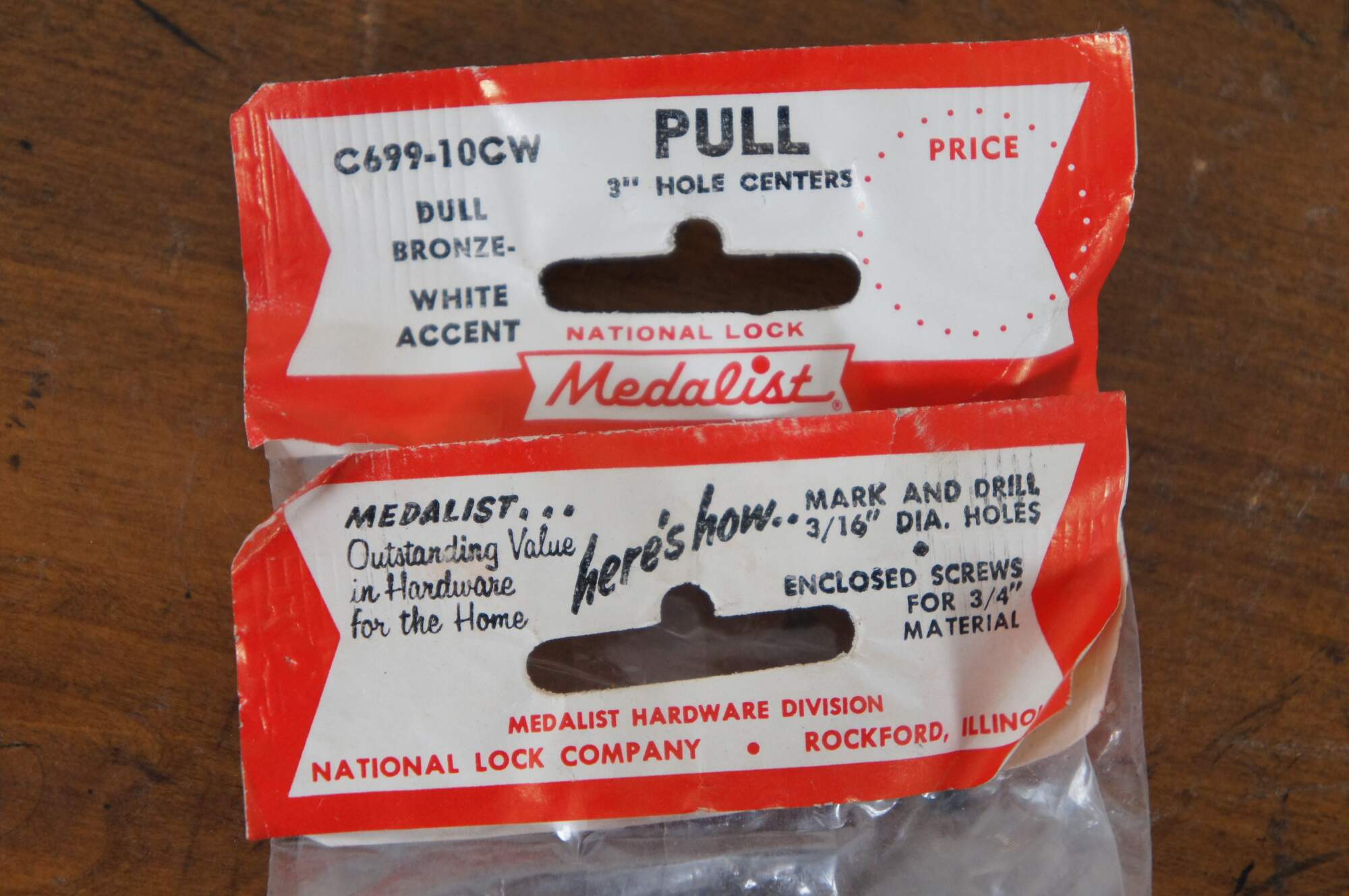 14 Available - Mid to late 20th century old-stock die cast drawer / cabinet pulls. National Lock Company - Medalist, item number C699-10CW Pull, Dull Bronze - White Accent. Mid century modern styling. Bowed out, rounded rectangular shape with concave surface with mottled white enamel detail. Hole Centers - 3