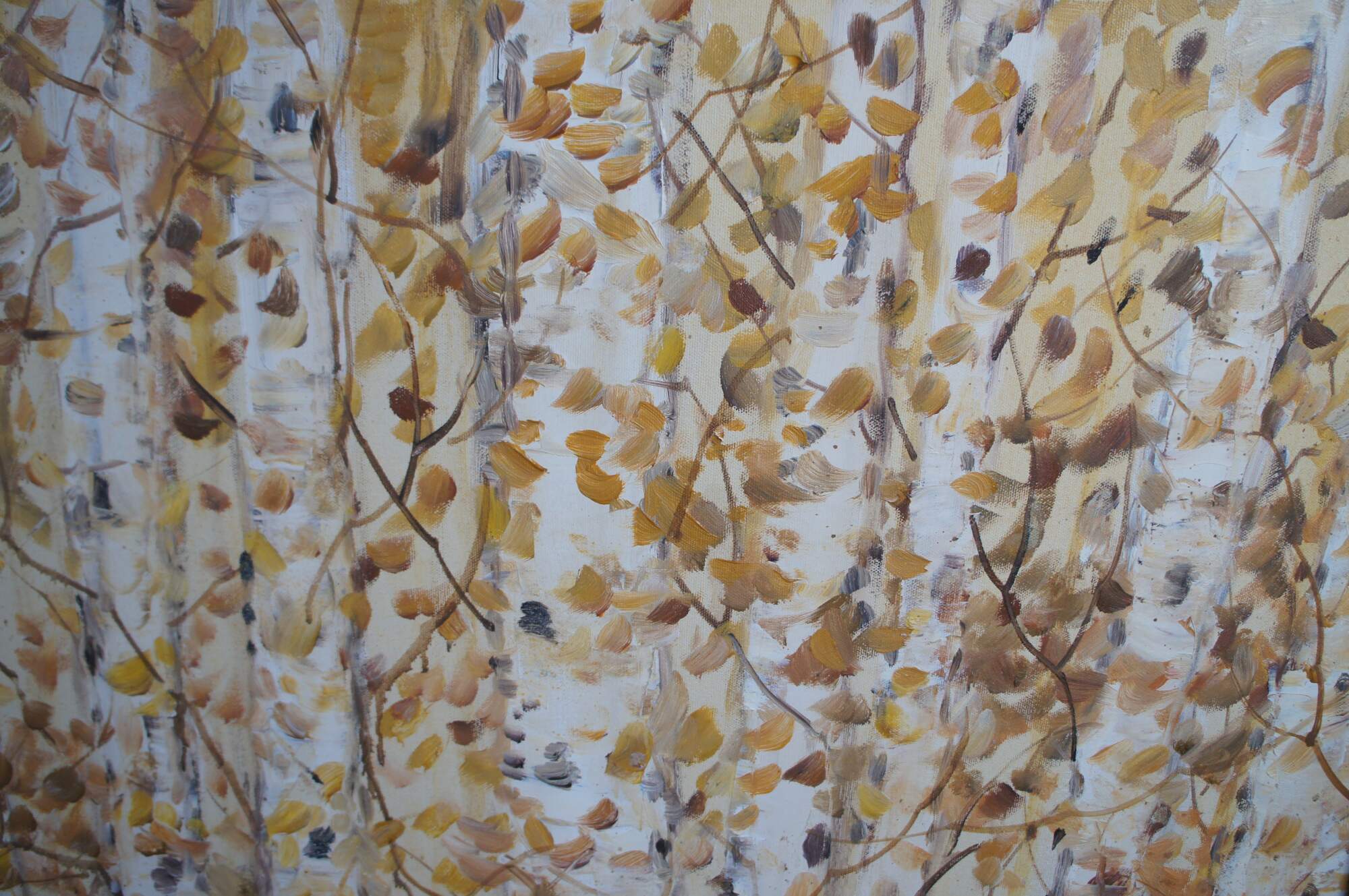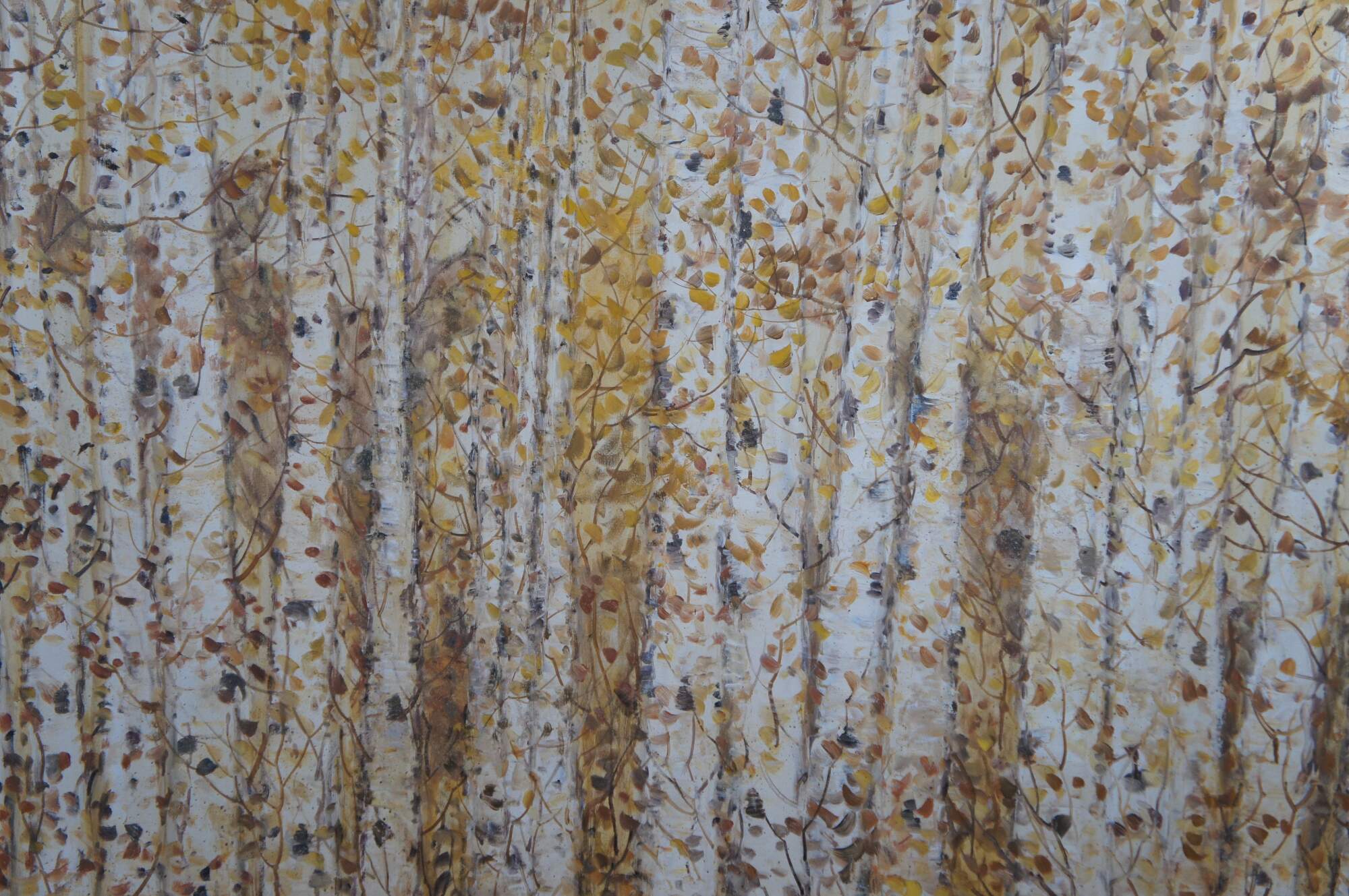 The painting showcases three deer in a fall forest setting. The deer are hiding behind the vibrant Aspen Trees. Framed in a distressed wood frame