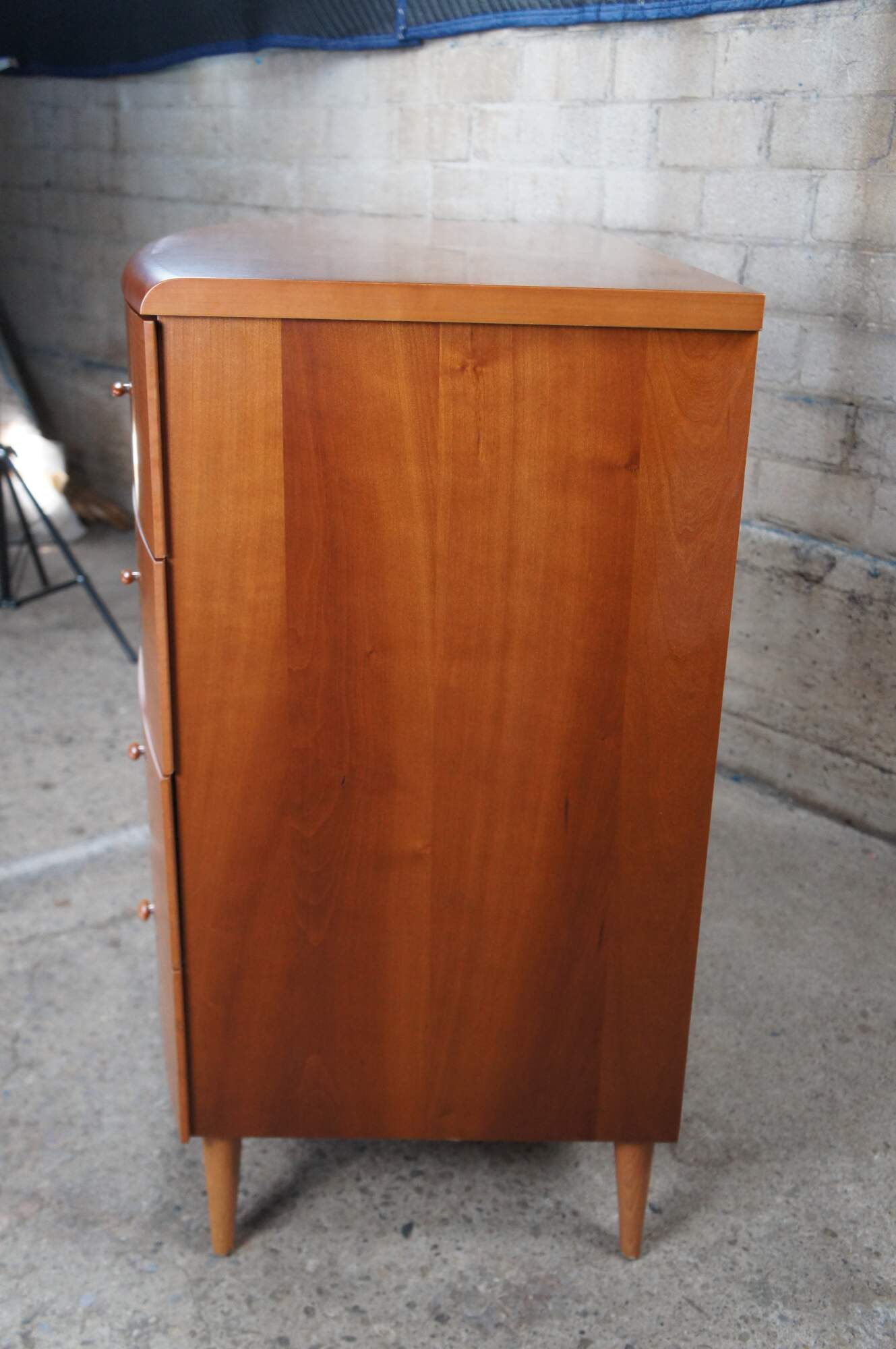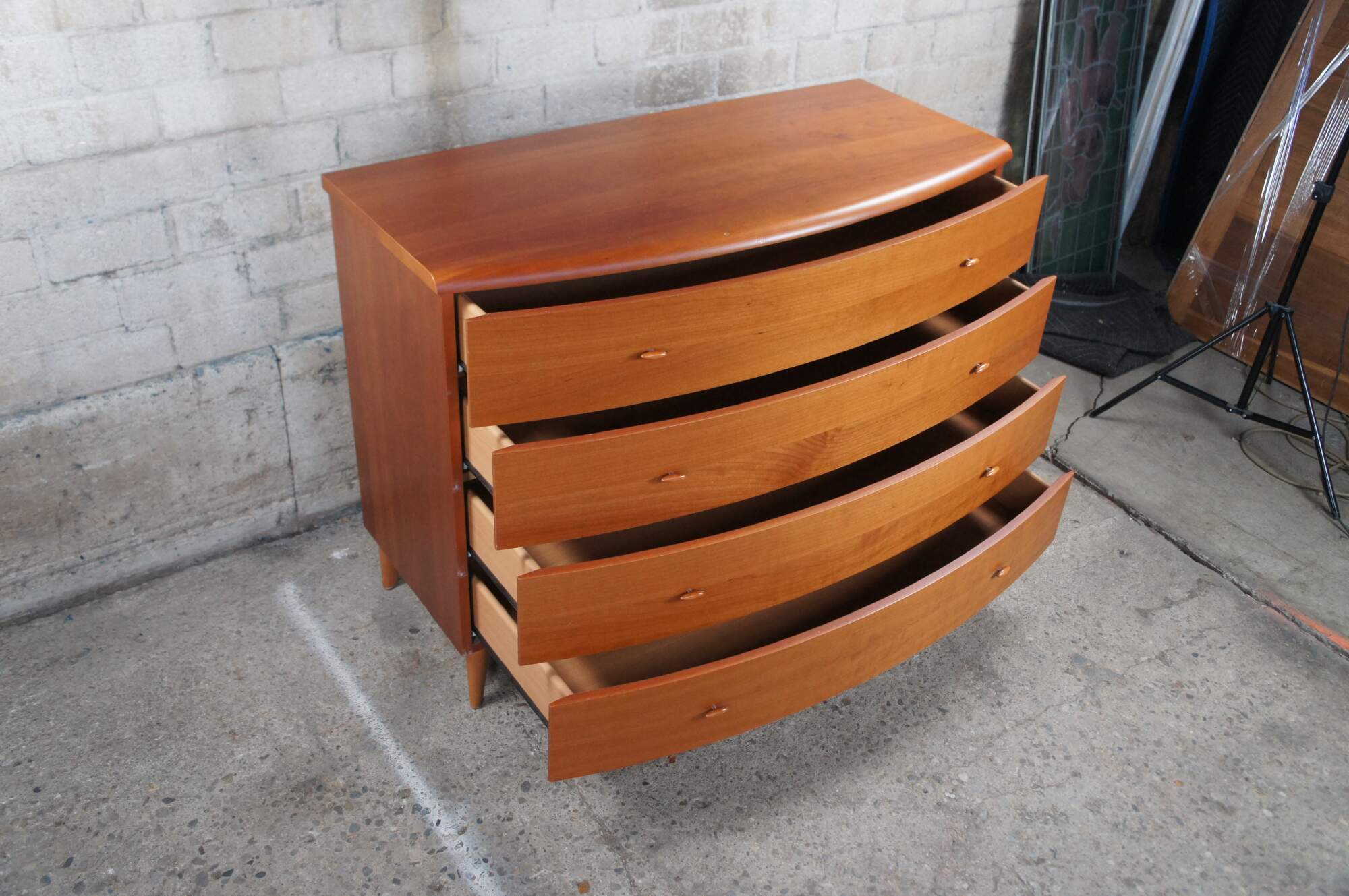 Vintage chest of drawers / dresser / console. Made of cherry featuring mid century / danish modern styling with a slight demilune or bowfront form, four drawer and tapered legs.