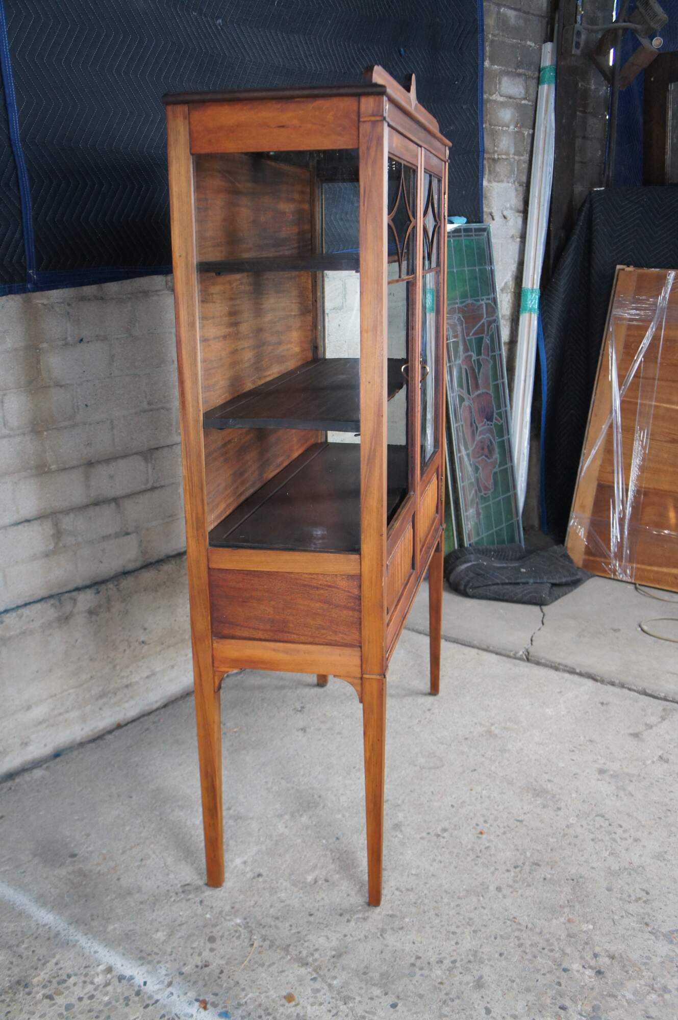 Antique curio china cabinet / bookshelf / show case / cupboard or vitrin. Made of walnut featuring long tapered legs that support fretwork and paneled doors that open to three shelves with plate grooves and lower storage area.