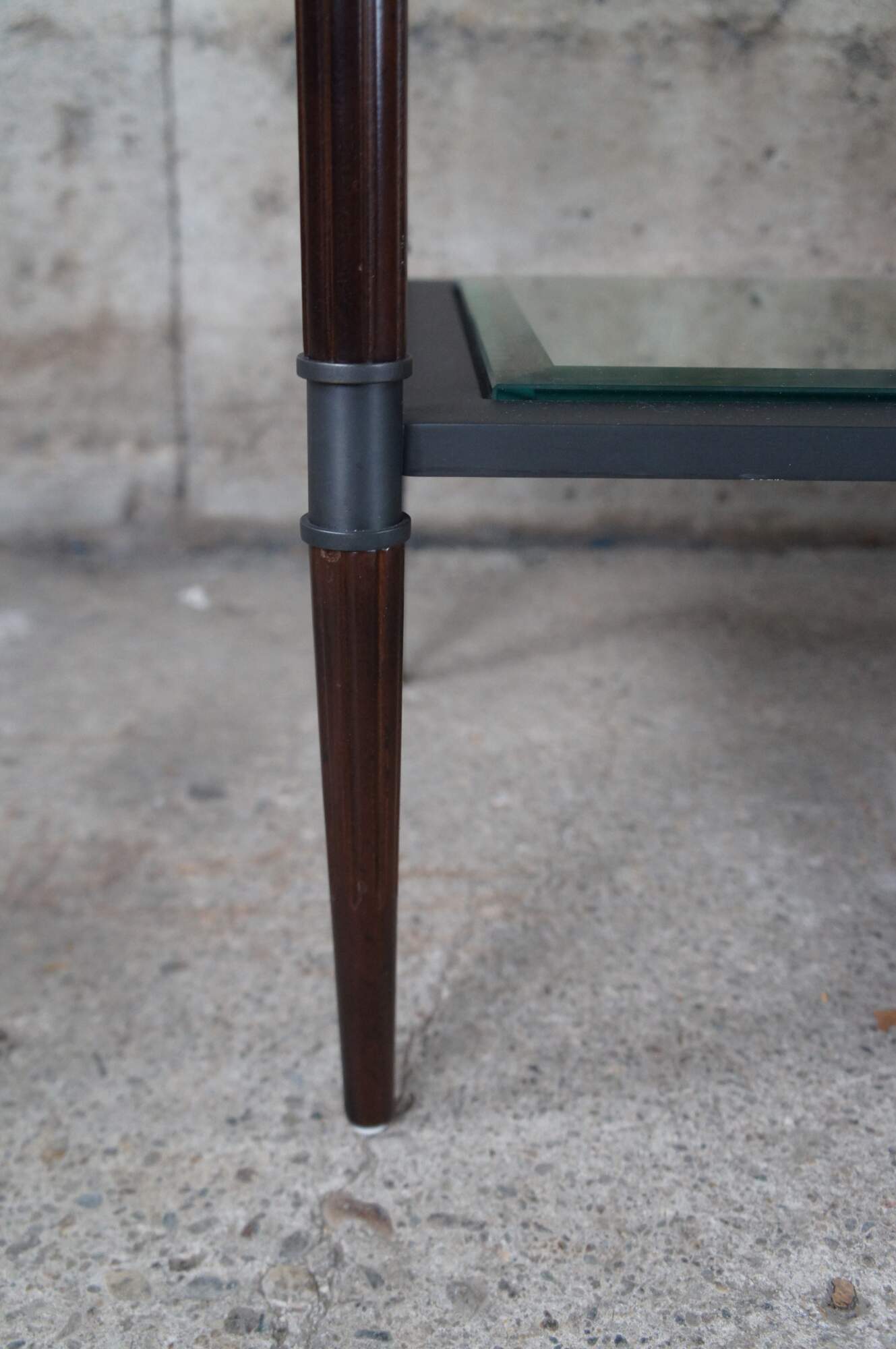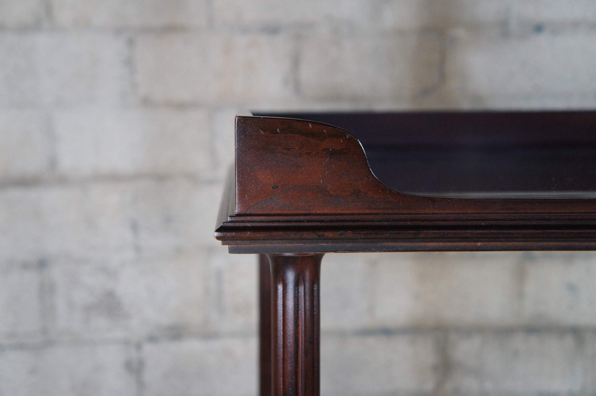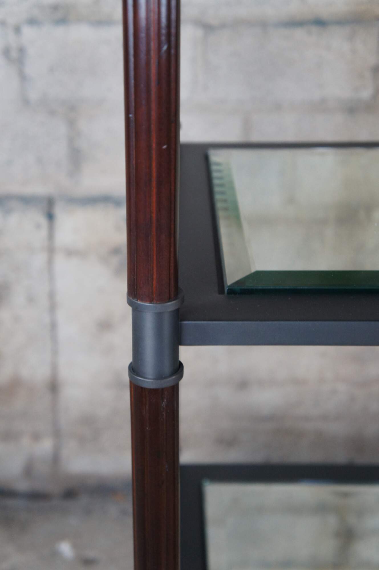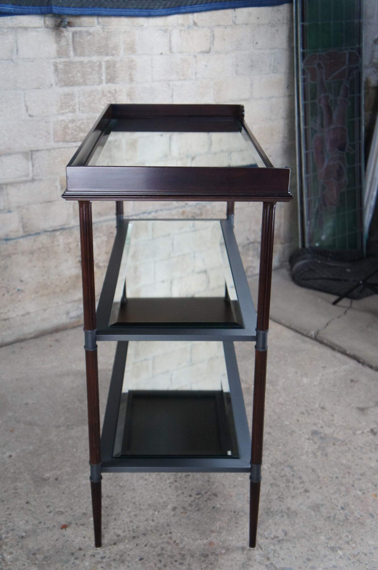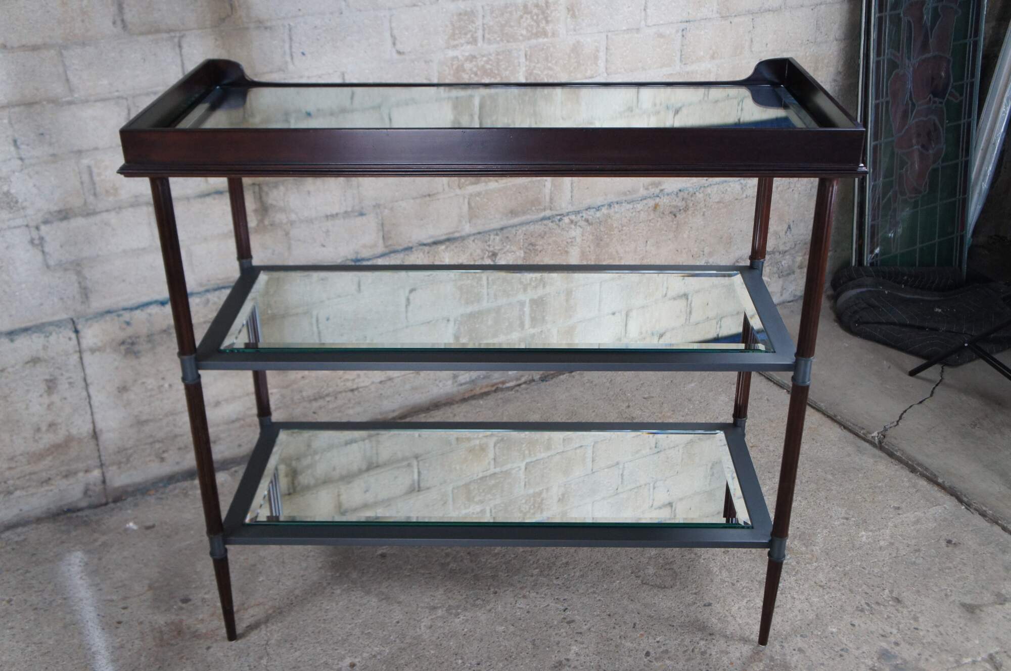 Vintage Baker Furniture Garcia Collection drybar / etagere / side entry table / console / or sideboard. Made of mahogany with a three tiered design that features an upper mirrored shelf with gallery over two additional beveled glass shelves.