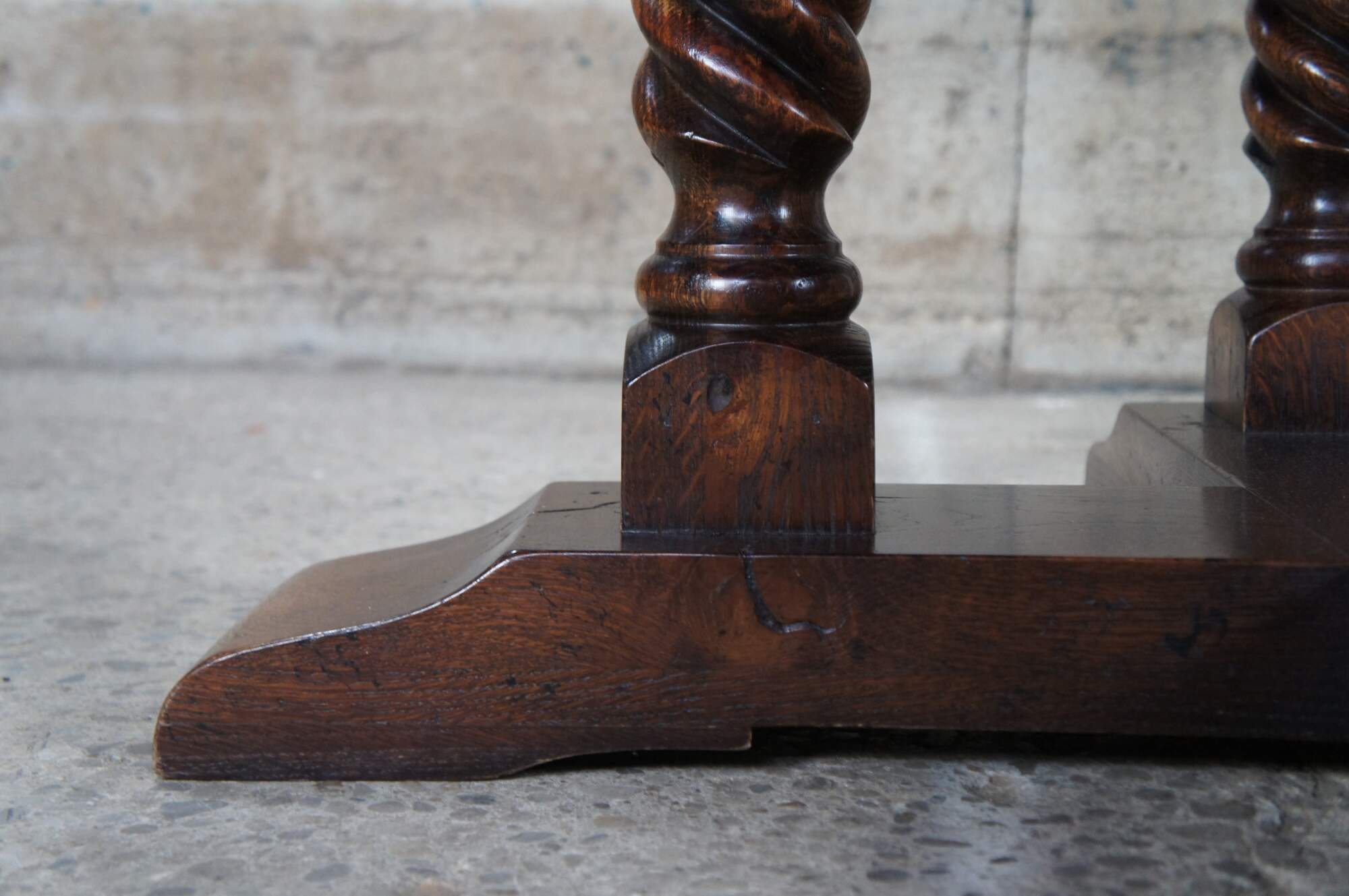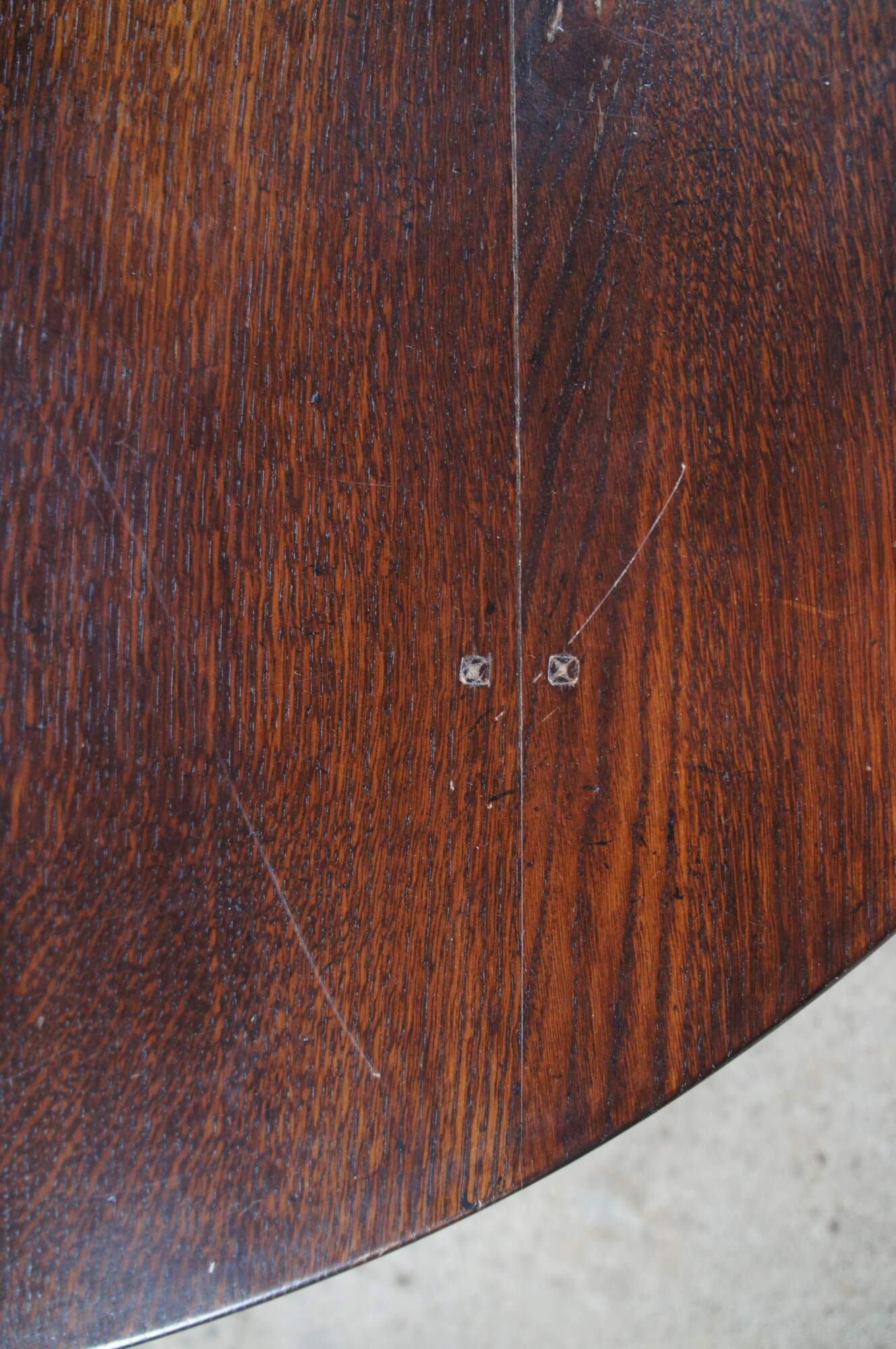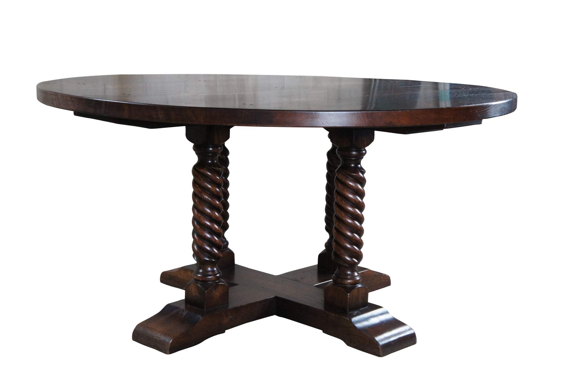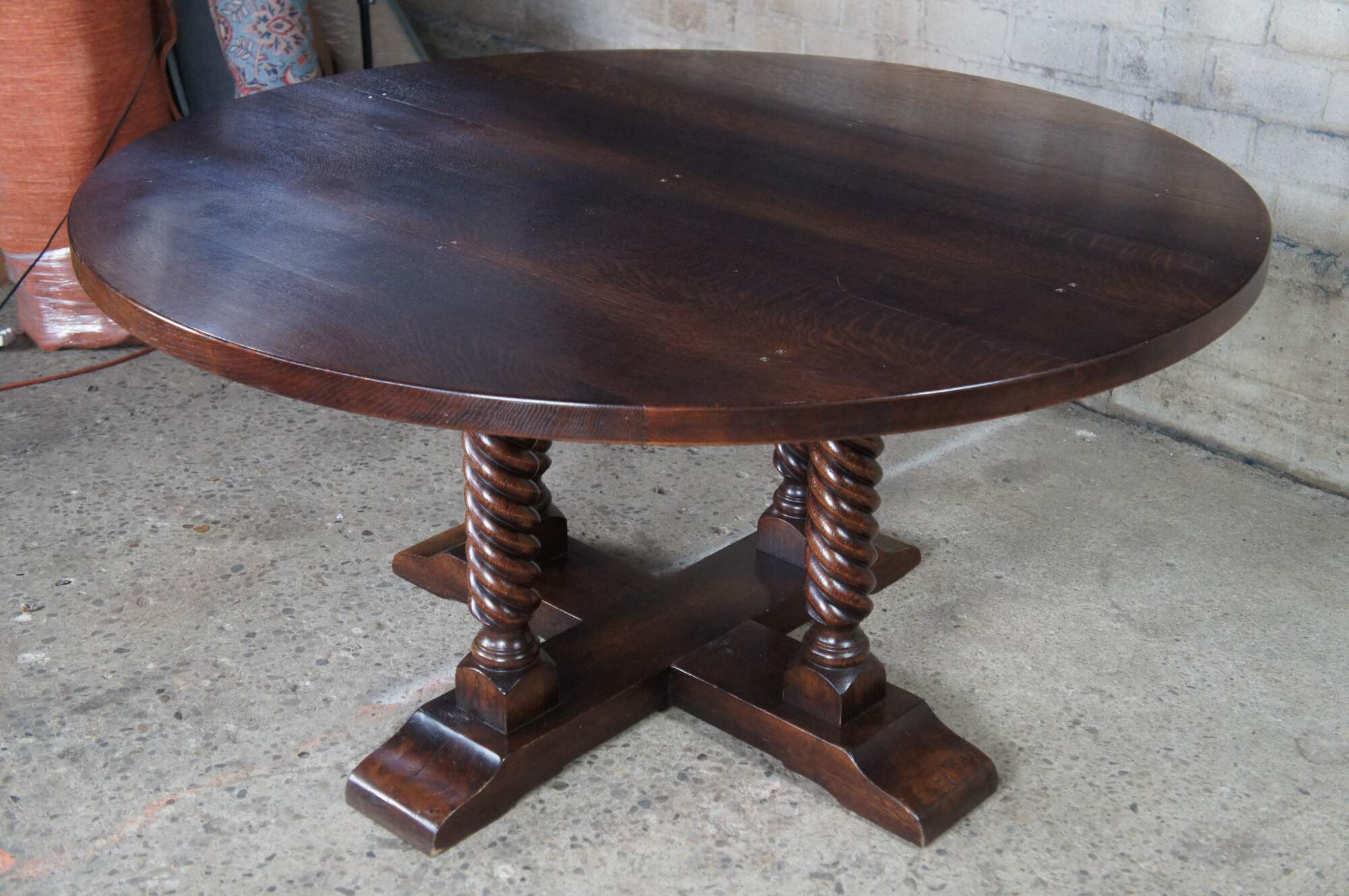 Vintage English quartersawn oak farmhouse dining table featuring round form with birdcage base and barley twisted legs.
