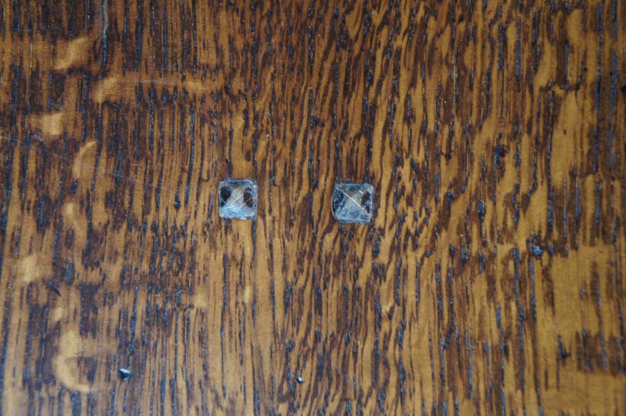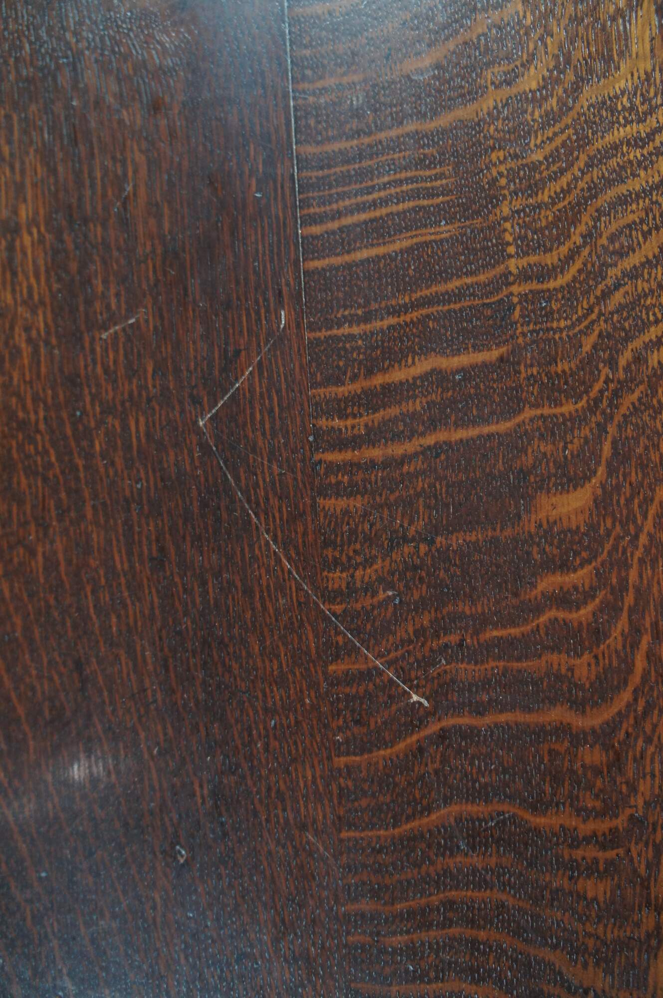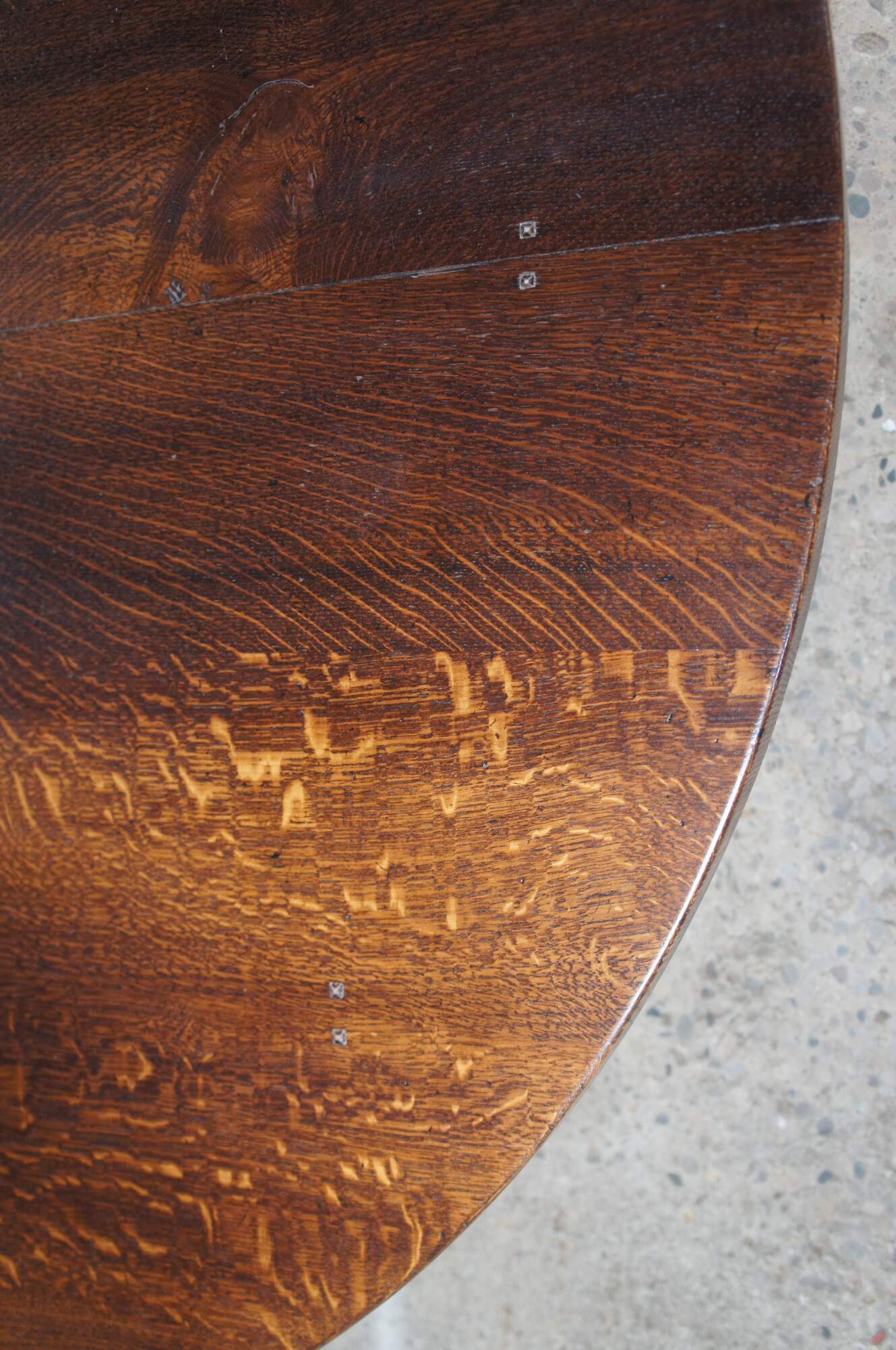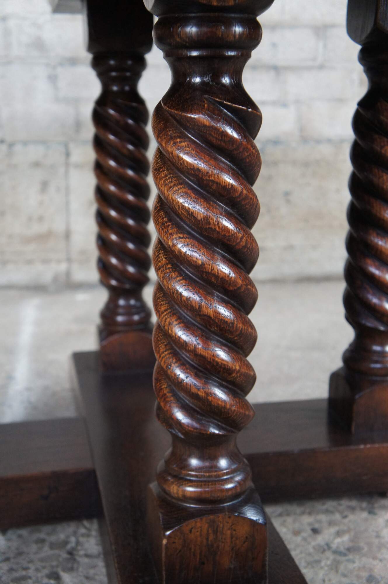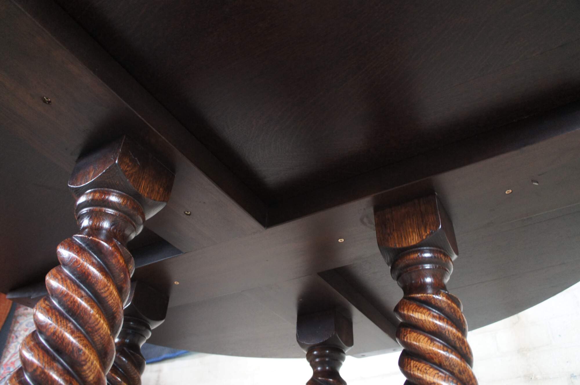 Vintage English quartersawn oak farmhouse dining table featuring round form with birdcage base and barley twisted legs.