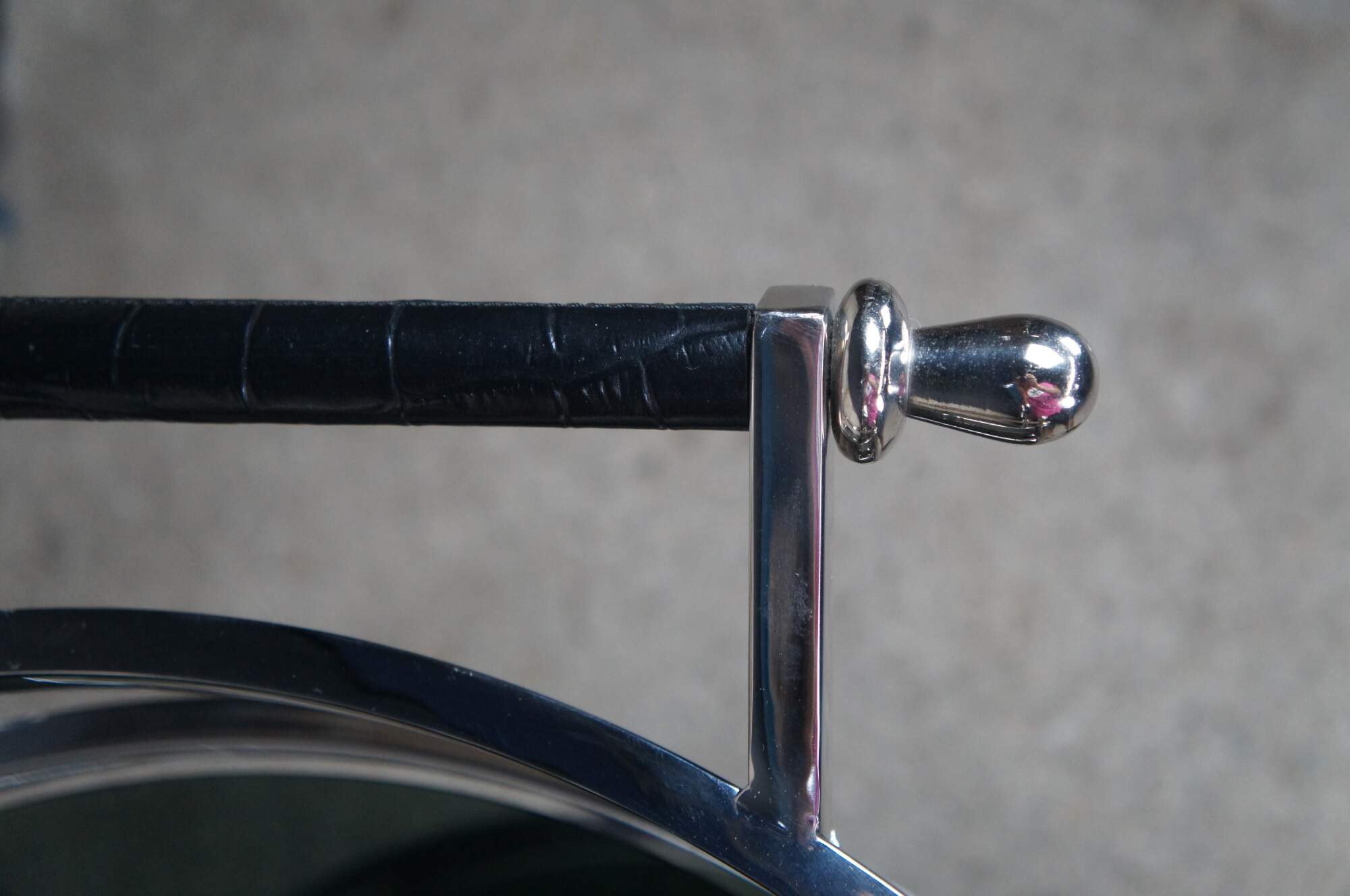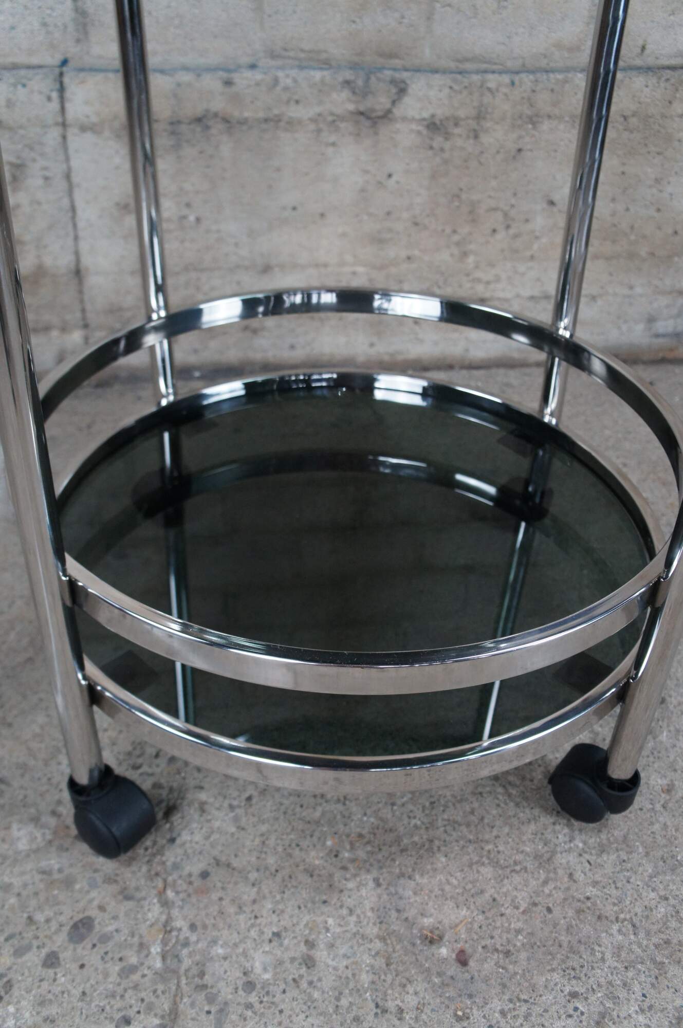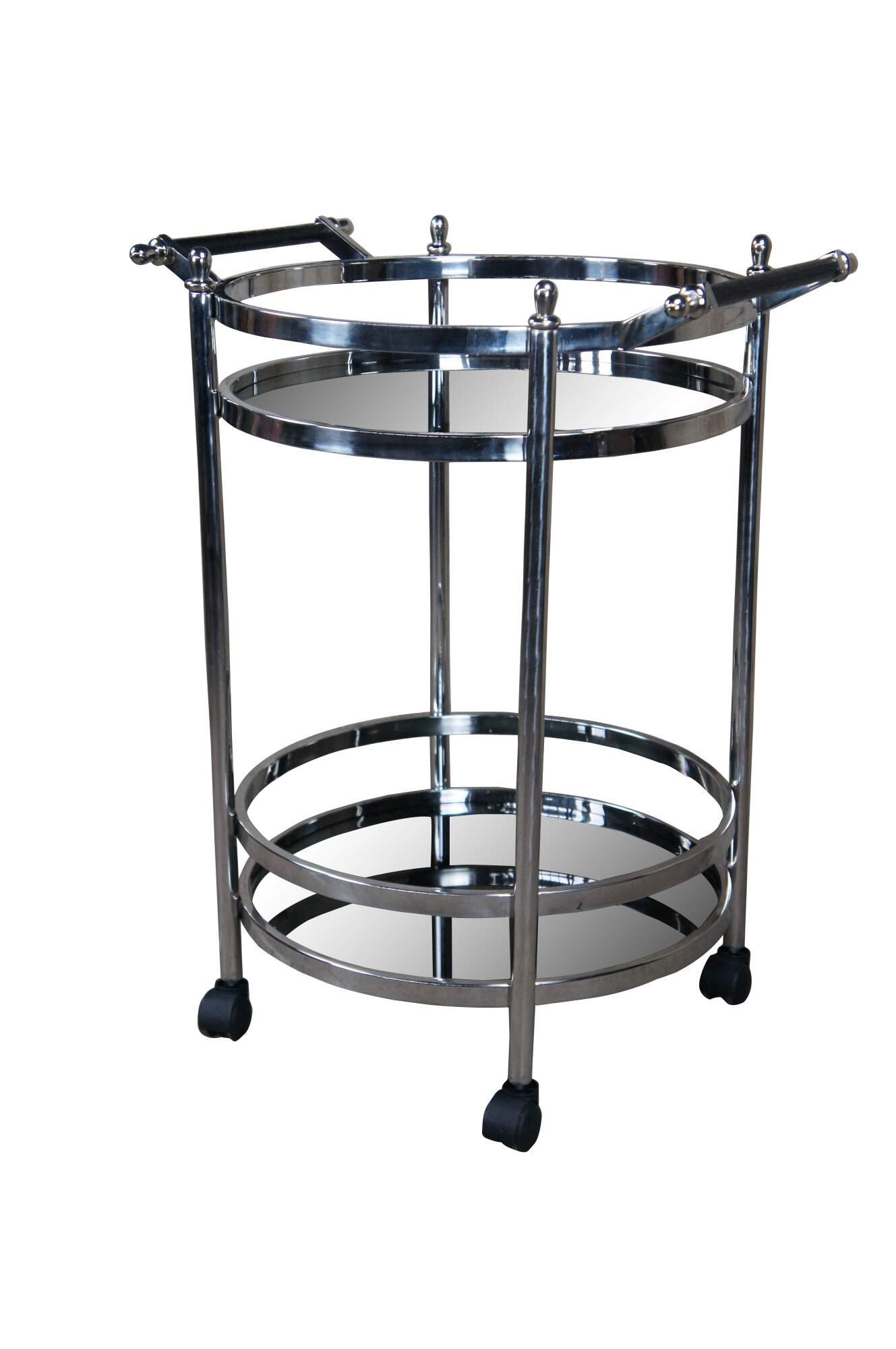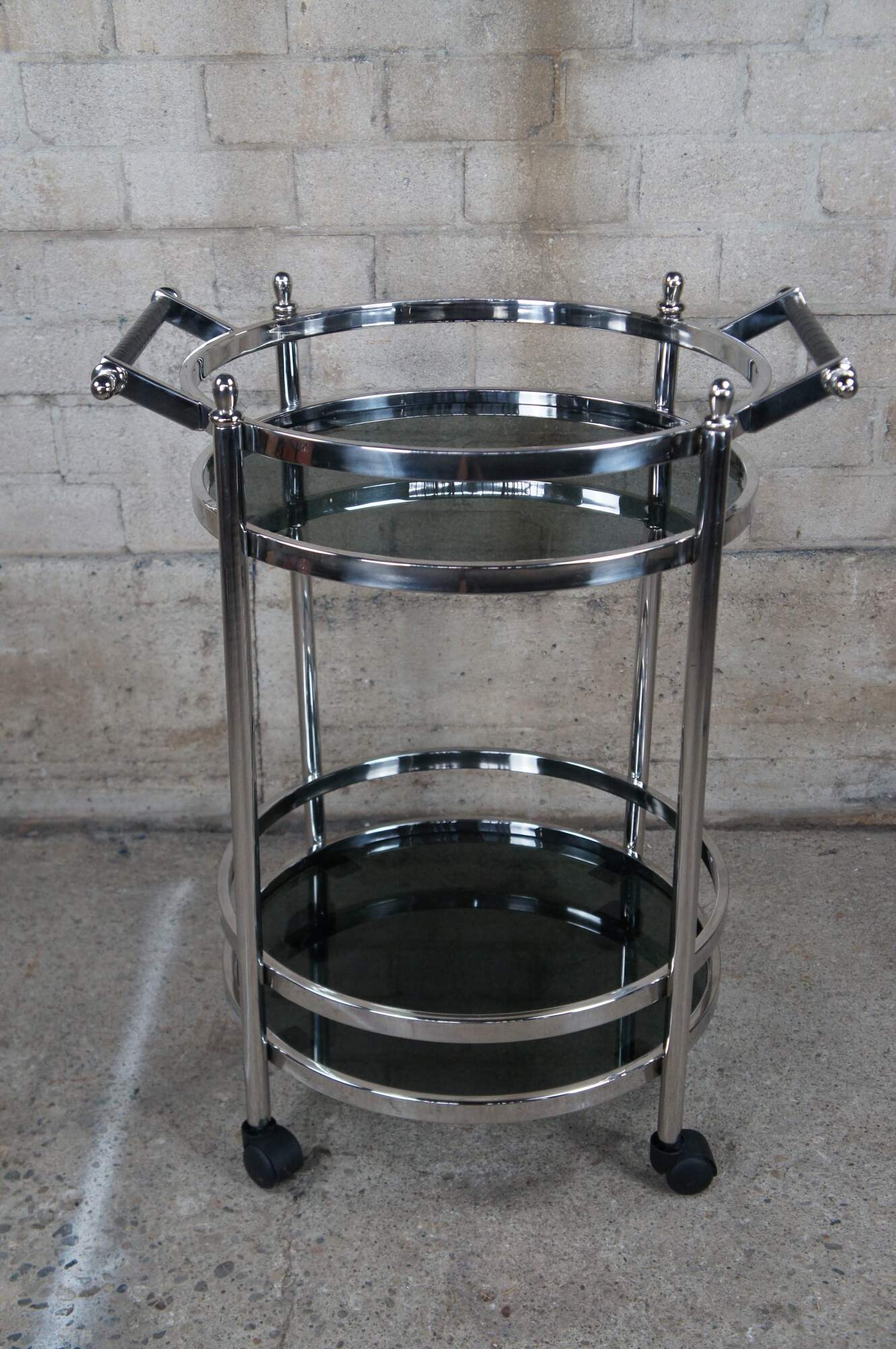 Casa Padrino Designer luxury bar trolley. Made from nickel plated Stainless steel and smoked glass. Features a round form in Art Deco / Post Modern manner with two tiers, leather handles and wheels for ease of movement.