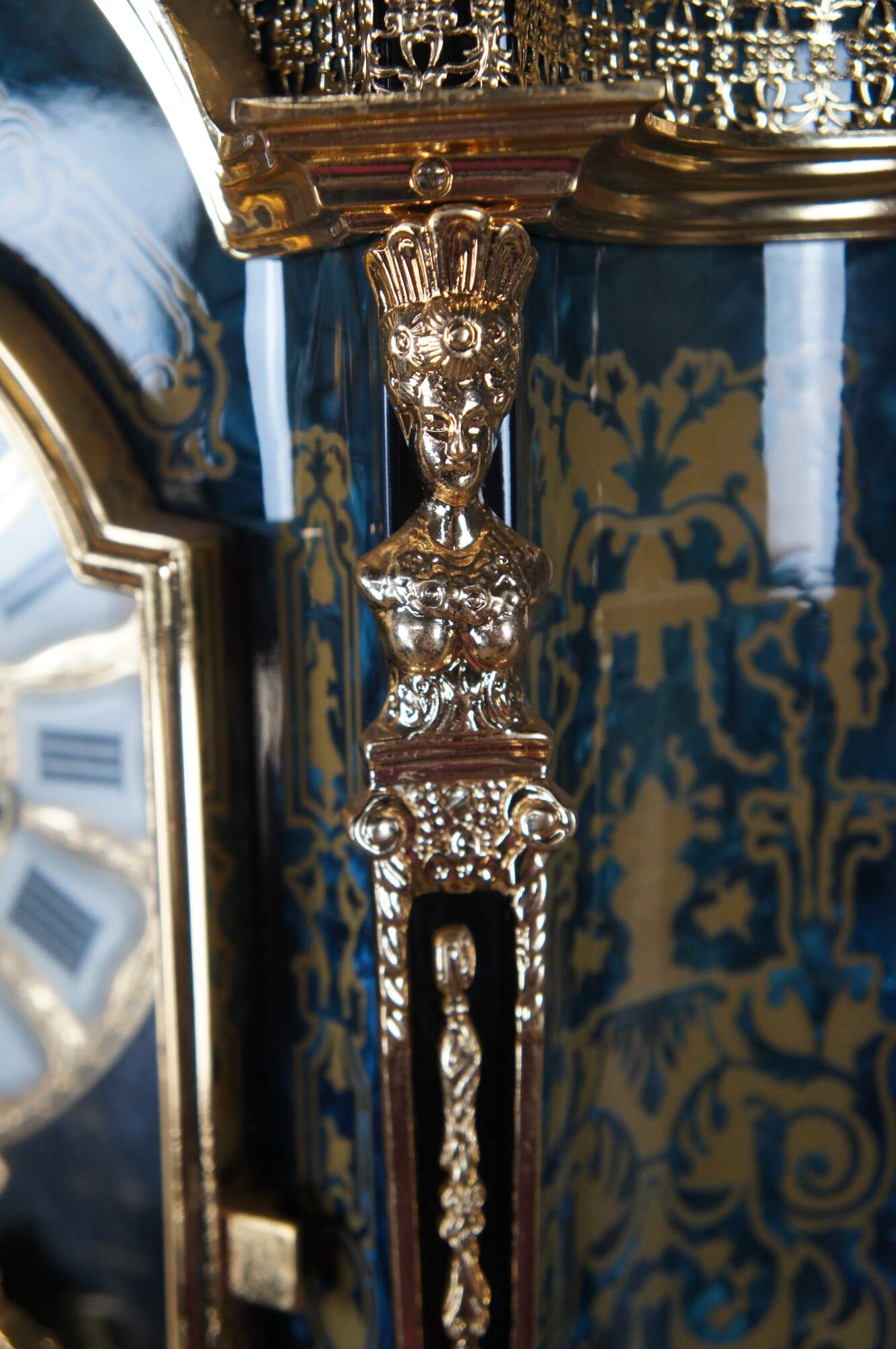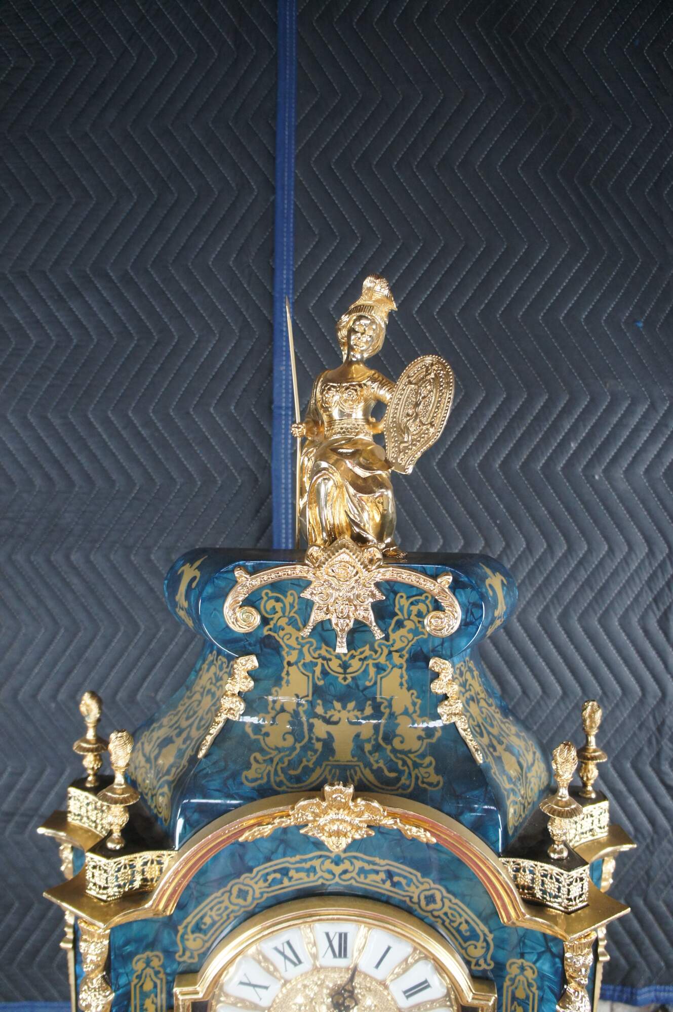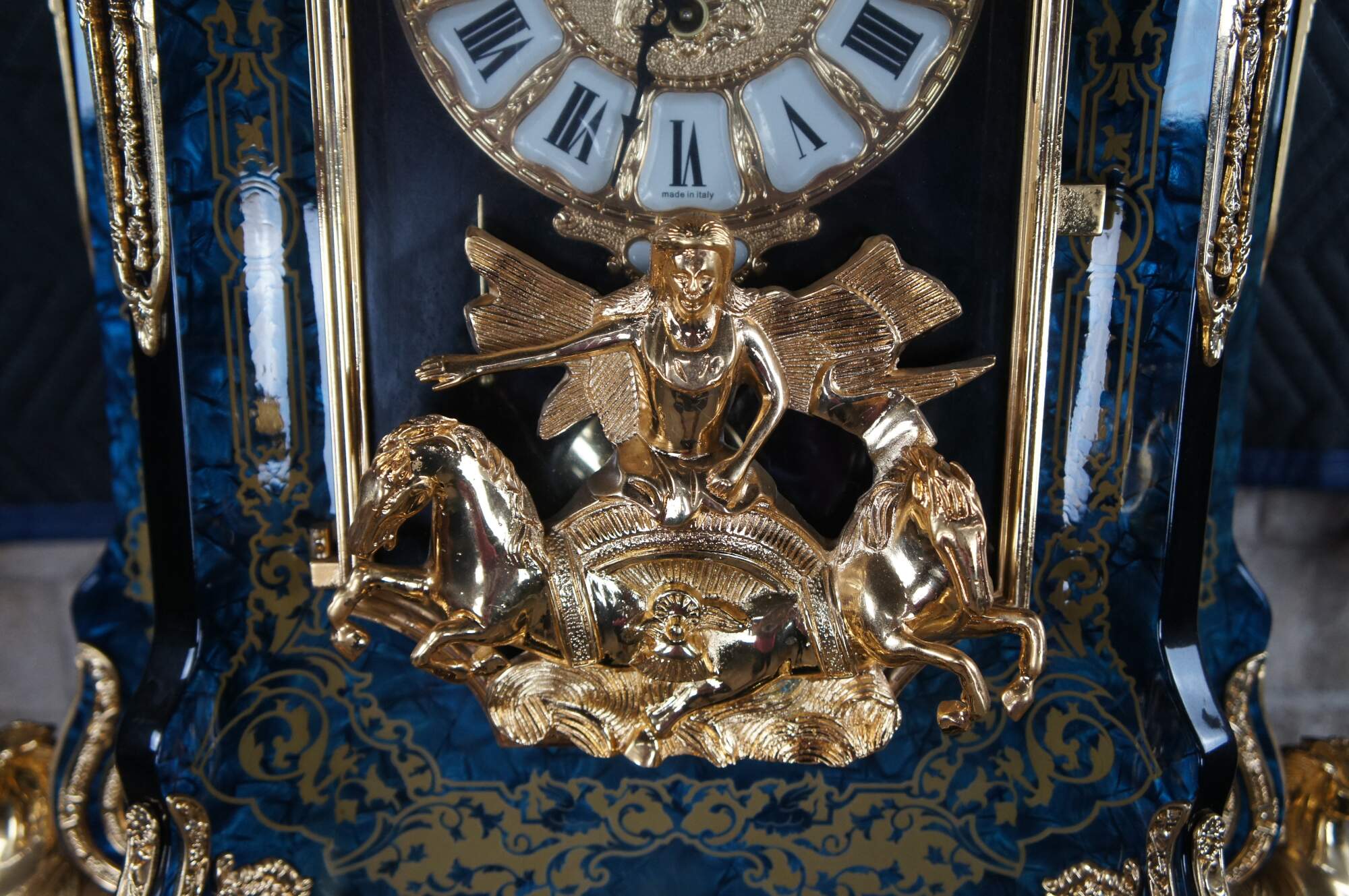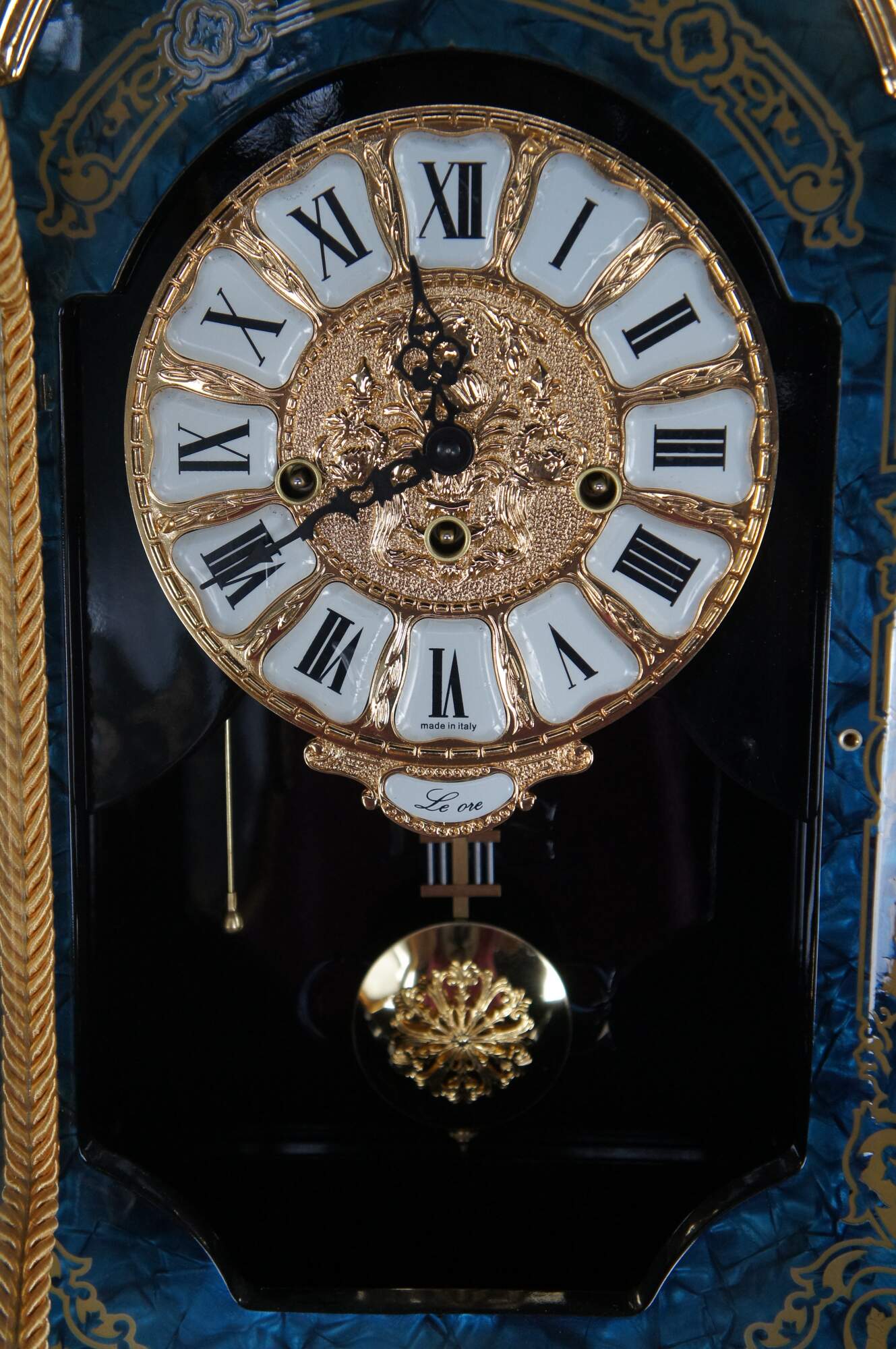 Stunning Italian Boulle style mantel clock by Le Ore New Art International. Le Ore is a small Italian family manufacturer that specializes in intricate and colorful wood inlay. Features large mounted sculptures and heavy gold plated cast brass ornamentation, blue mother of pearl inlay and gold marquetry. Includes ebonized accents, caryatids, banding, a key and pendulum. 8 Day Movement made by Franz Hermle in Germany. Circa late 20th Century, after original period examples by Andres Charles Boulle. The clock rests on a matching serpentine stand. The perfect statement for any space.