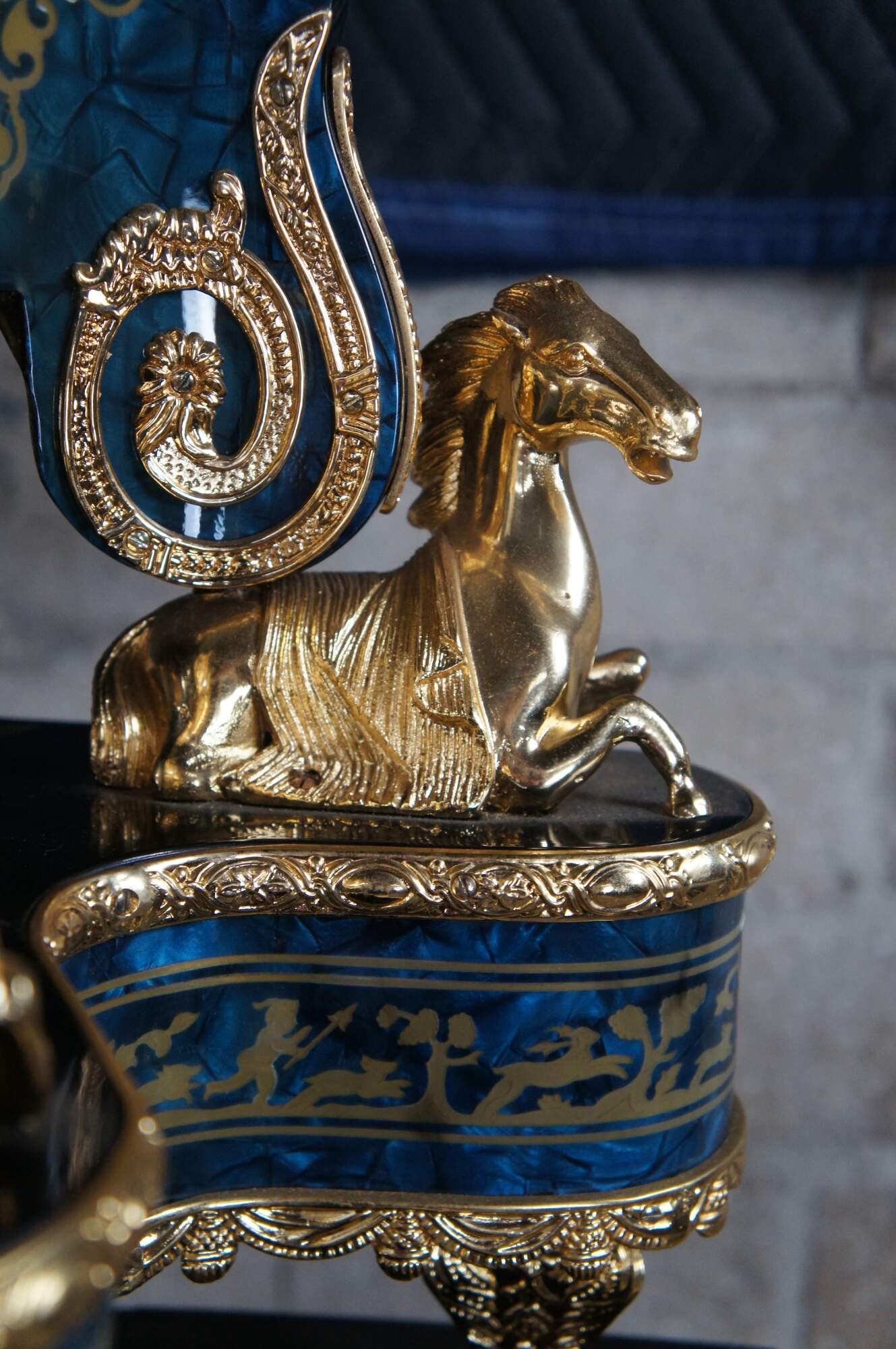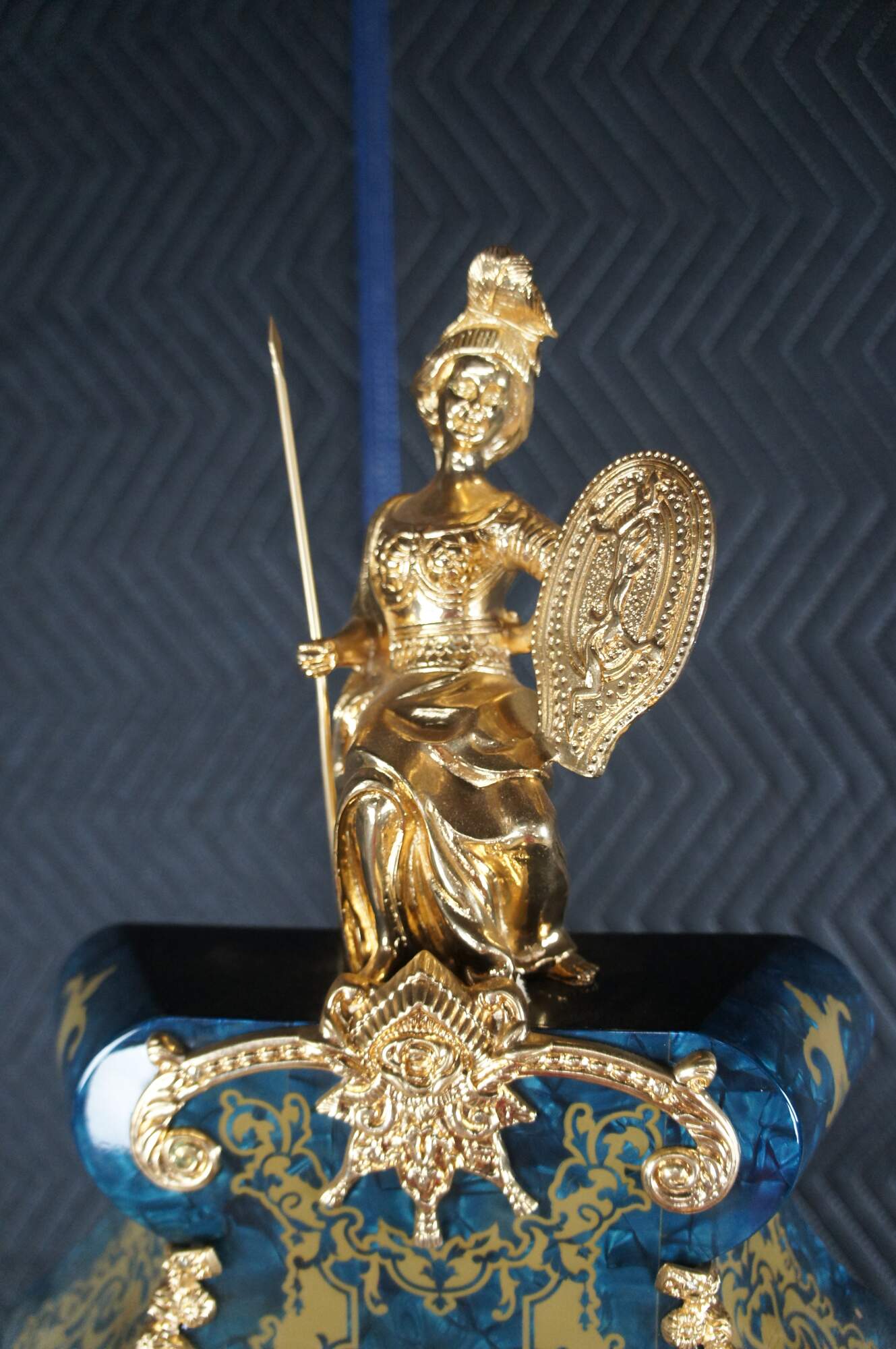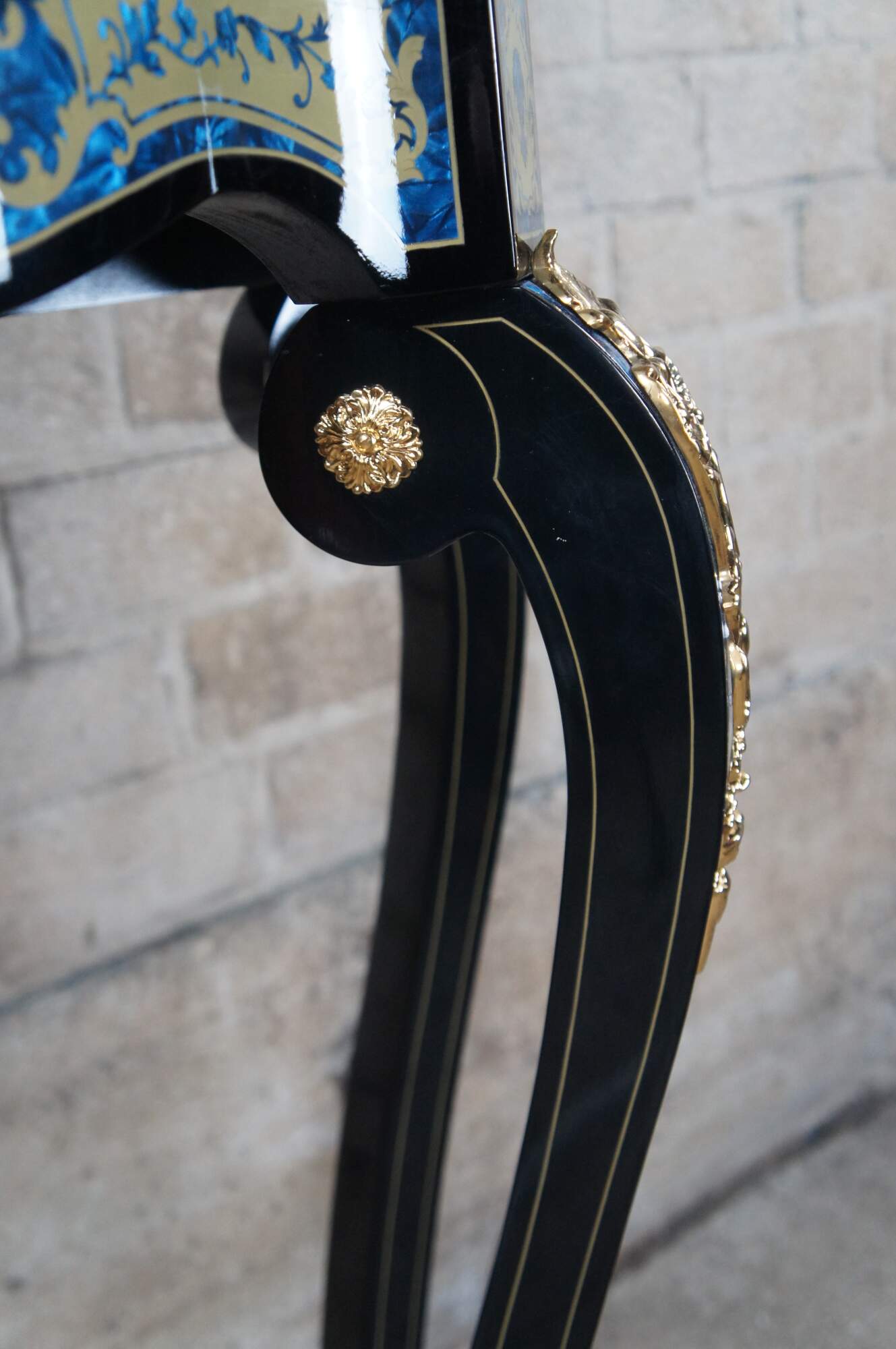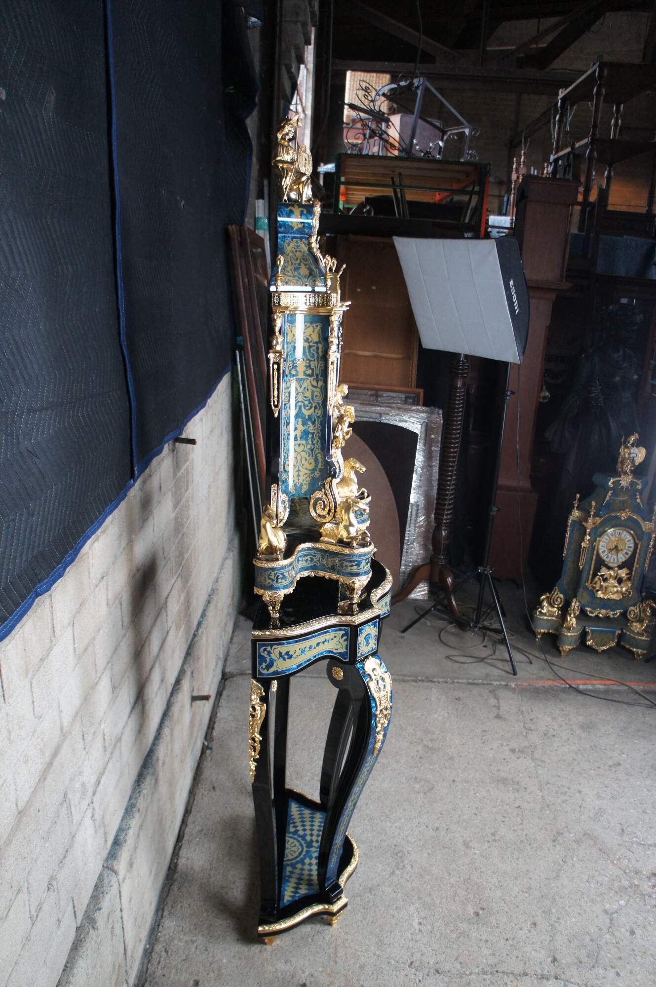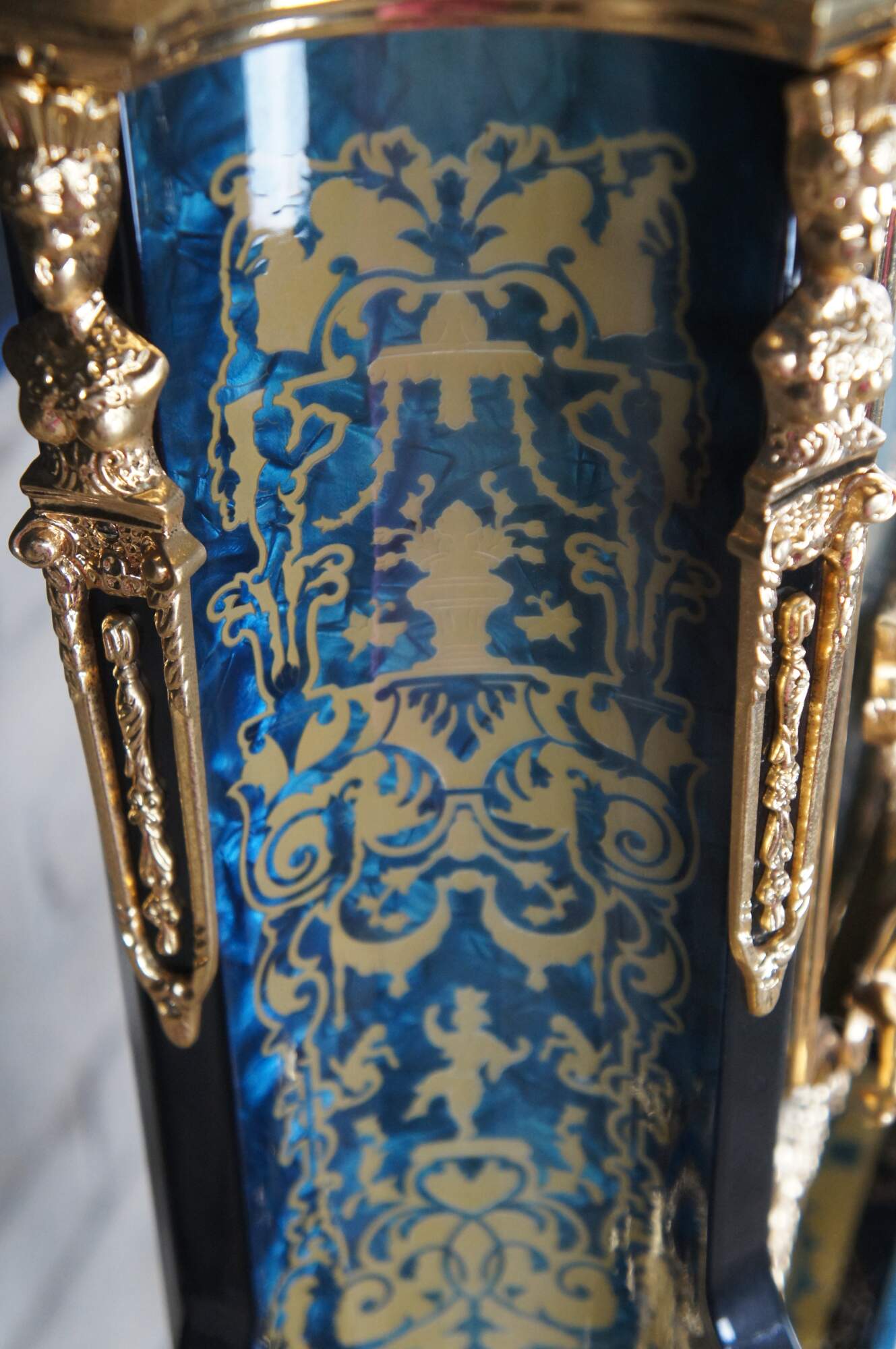 Stunning Italian Boulle style mantel clock by Le Ore New Art International. Le Ore is a small Italian family manufacturer that specializes in intricate and colorful wood inlay. Features large mounted sculptures and heavy gold plated cast brass ornamentation, blue mother of pearl inlay and gold marquetry. Includes ebonized accents, caryatids, banding, a key and pendulum. 8 Day Movement made by Franz Hermle in Germany. Circa late 20th Century, after original period examples by Andres Charles Boulle. The clock rests on a matching serpentine stand. The perfect statement for any space.