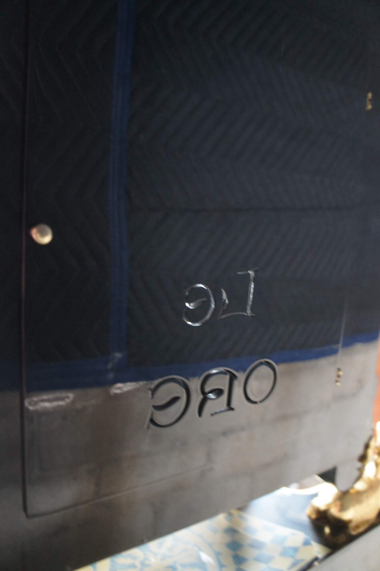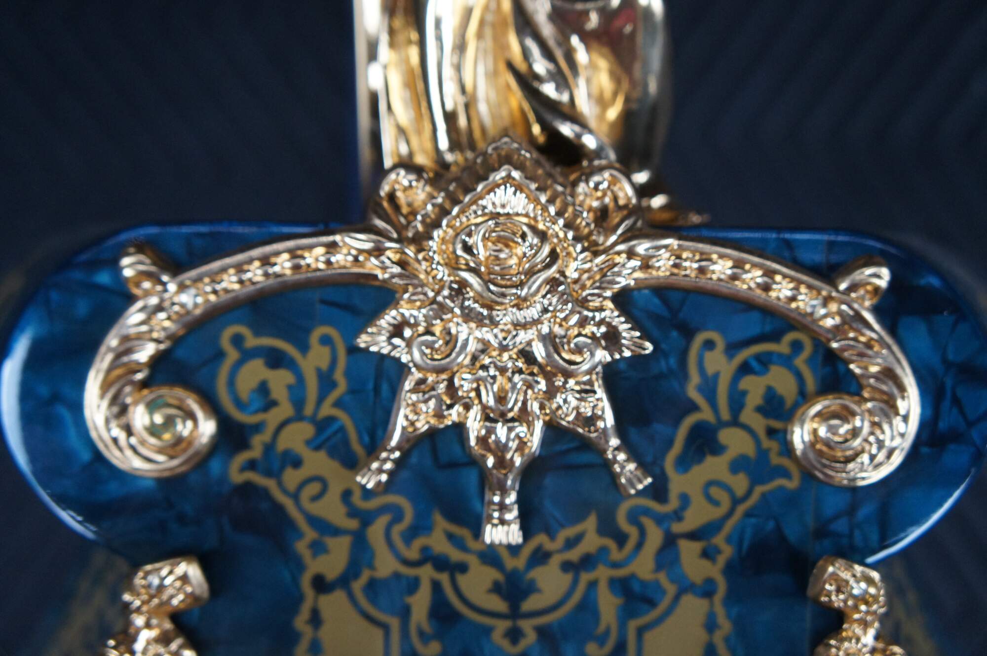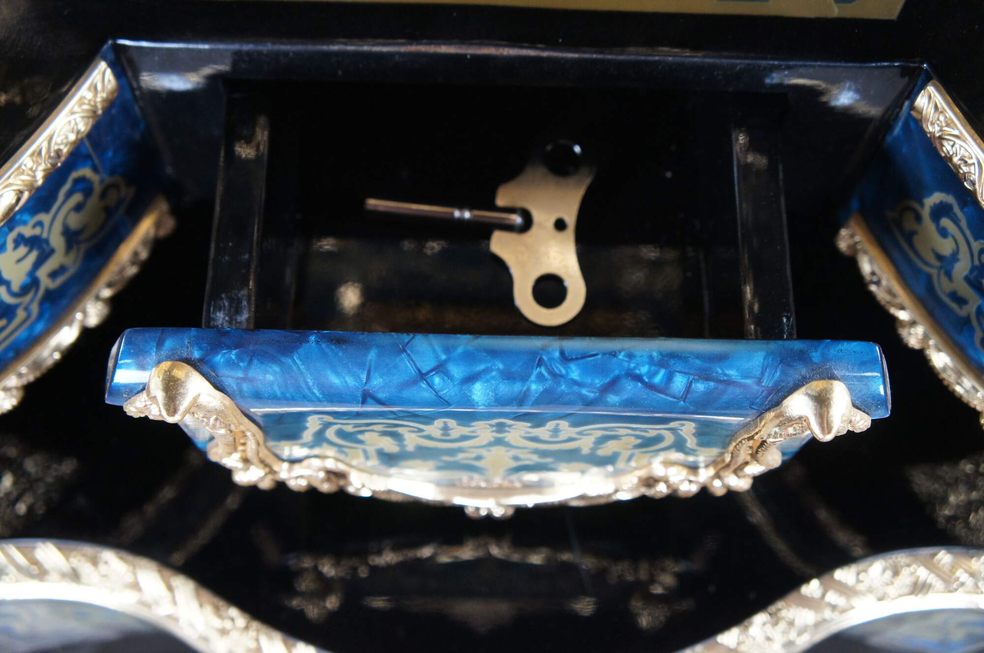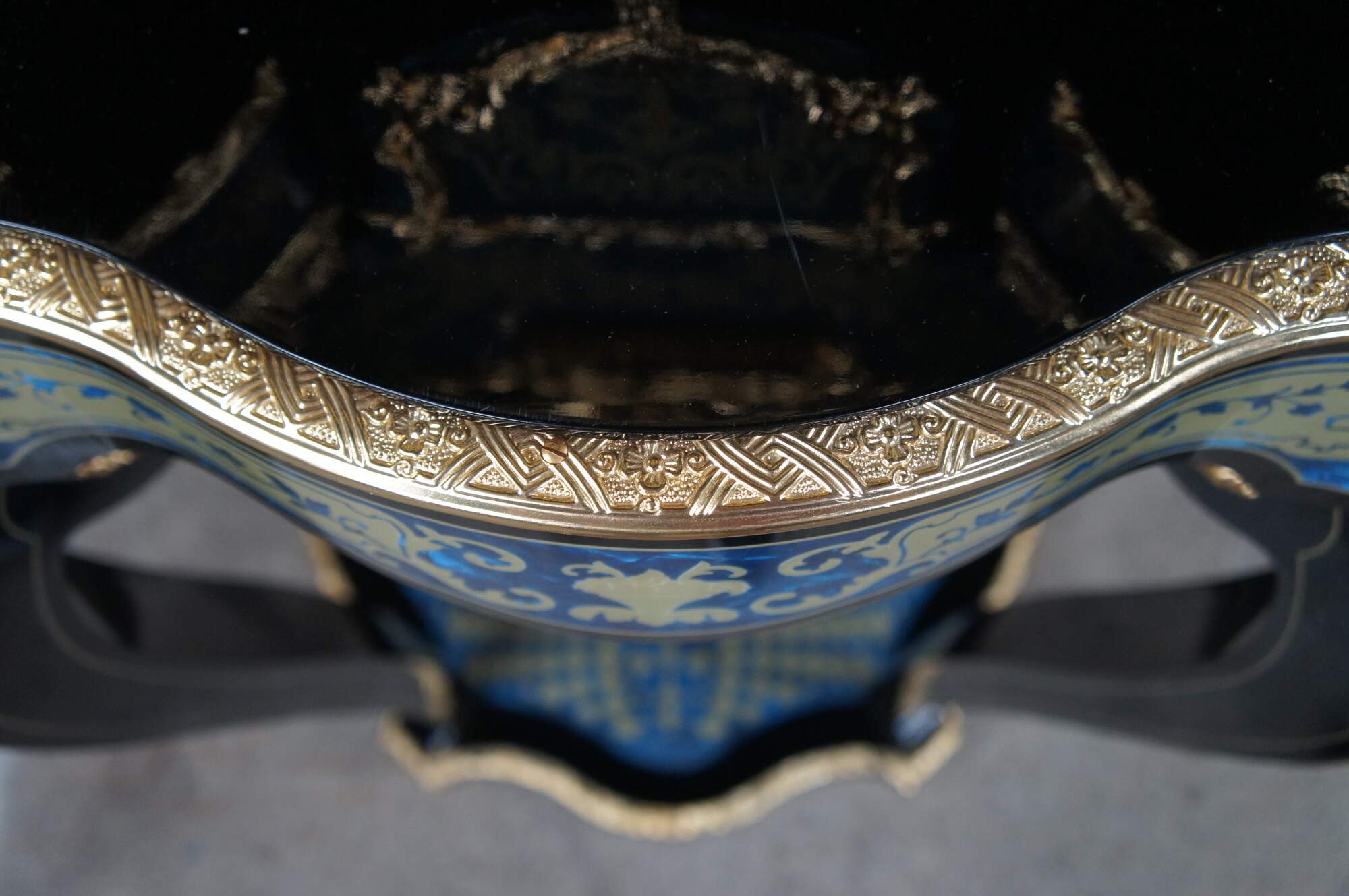 Stunning Italian Boulle style mantel clock by Le Ore New Art International. Le Ore is a small Italian family manufacturer that specializes in intricate and colorful wood inlay. Features large mounted sculptures and heavy gold plated cast brass ornamentation, blue mother of pearl inlay and gold marquetry. Includes ebonized accents, caryatids, banding, a key and pendulum. 8 Day Movement made by Franz Hermle in Germany. Circa late 20th Century, after original period examples by Andres Charles Boulle. The clock rests on a matching serpentine stand. The perfect statement for any space.