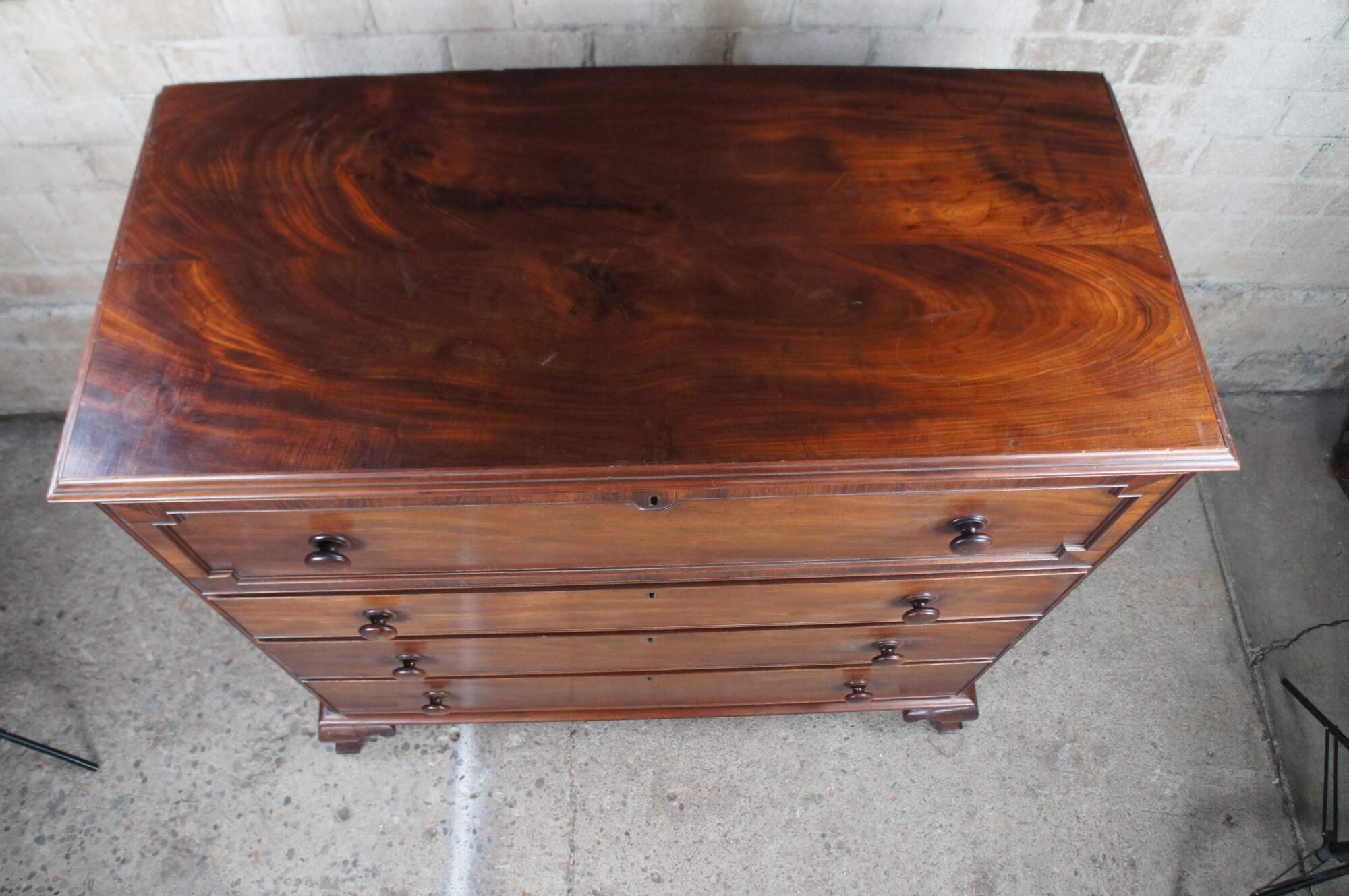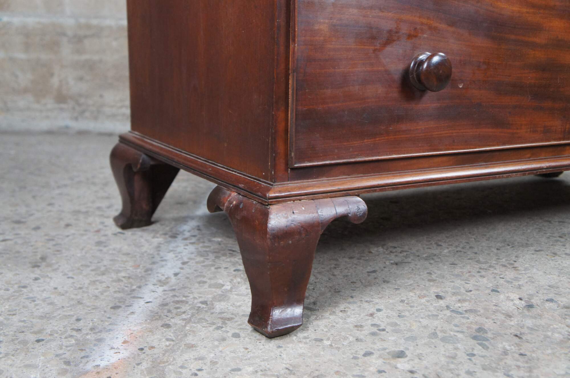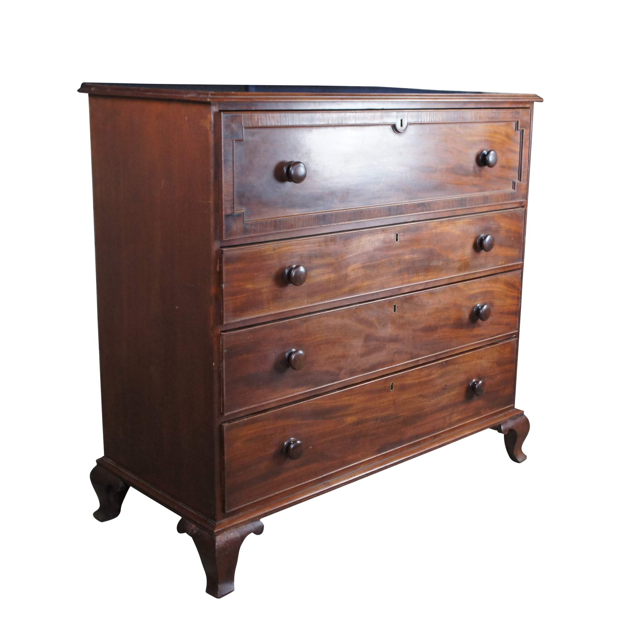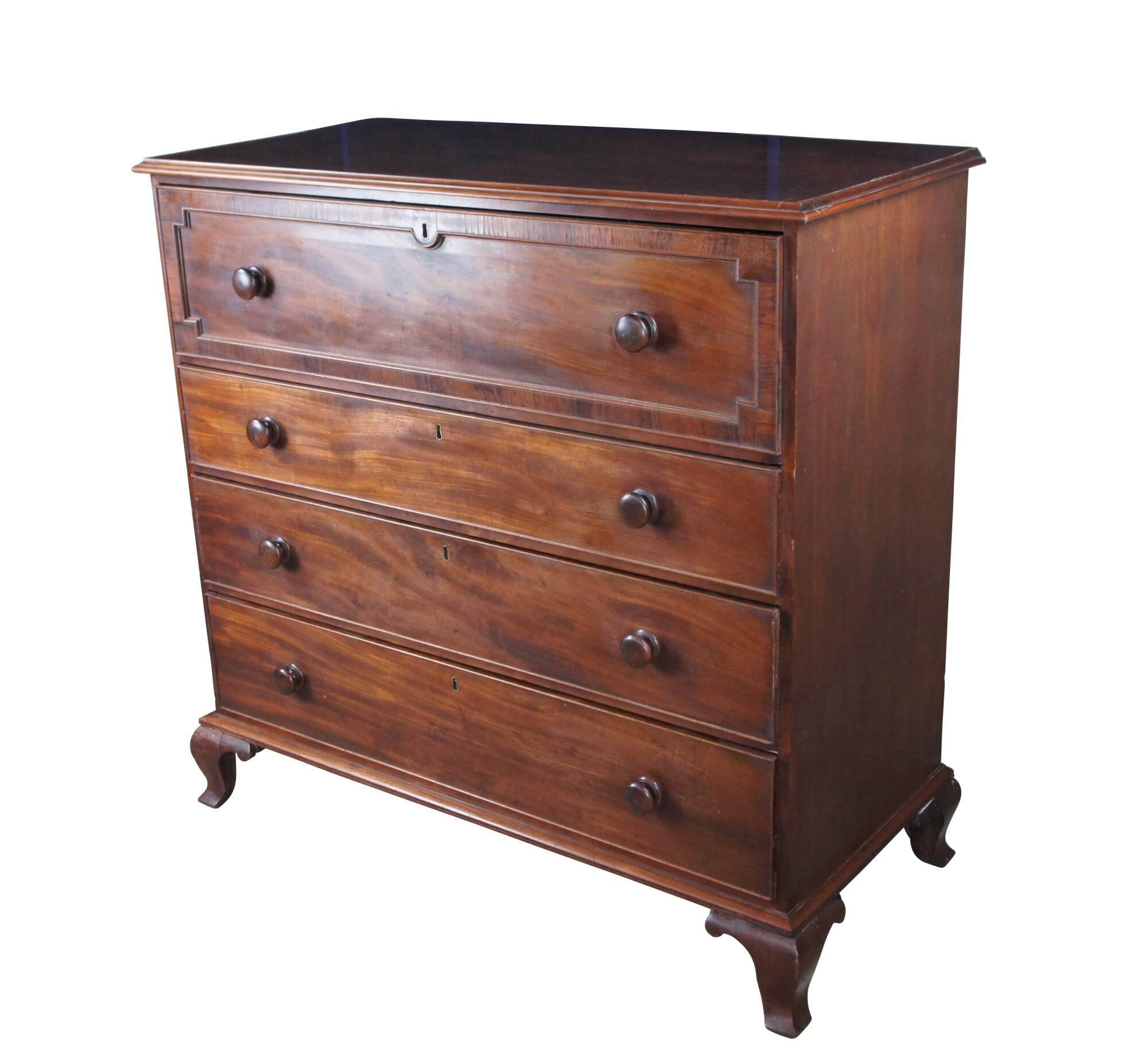 Antique 19th Century Georgian mahogany chest of drawers. Features four drawers with a large cross banded upper drawer. Drawers are made from pine, hand dovetailed and include escutcheons. The case is supported by ogee bracket feet.