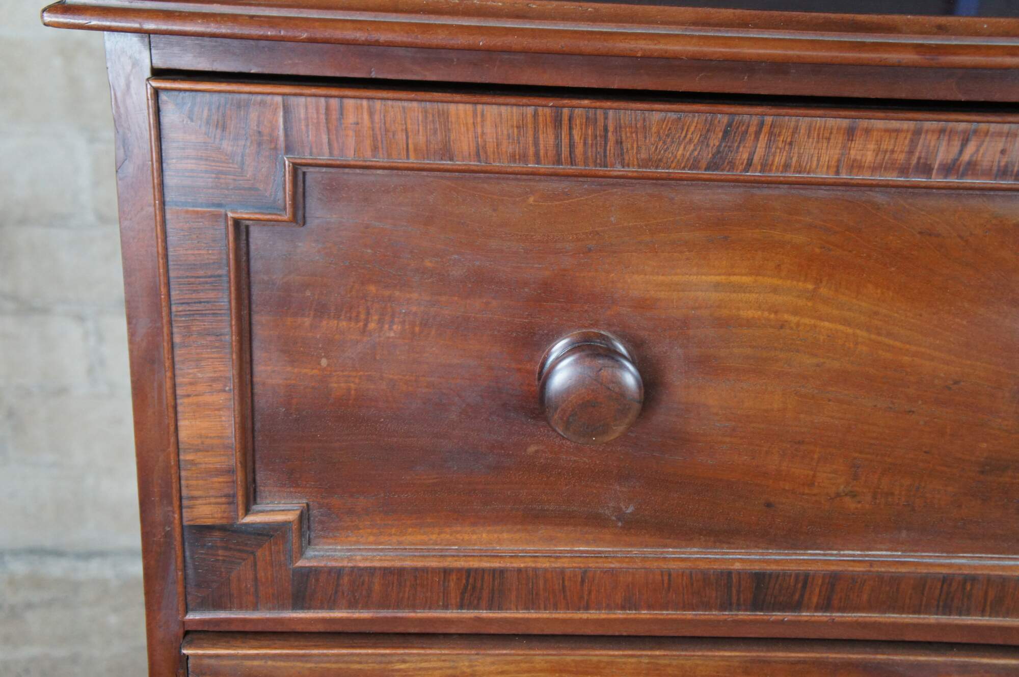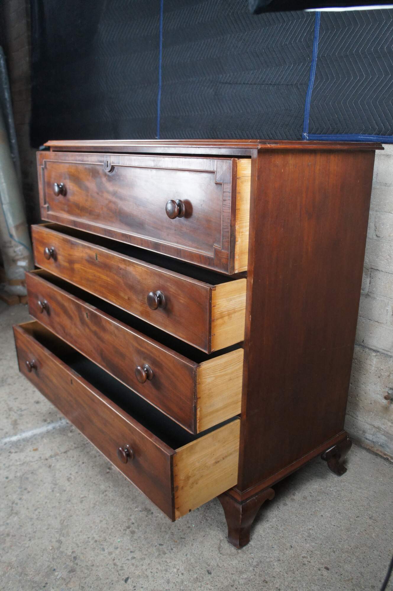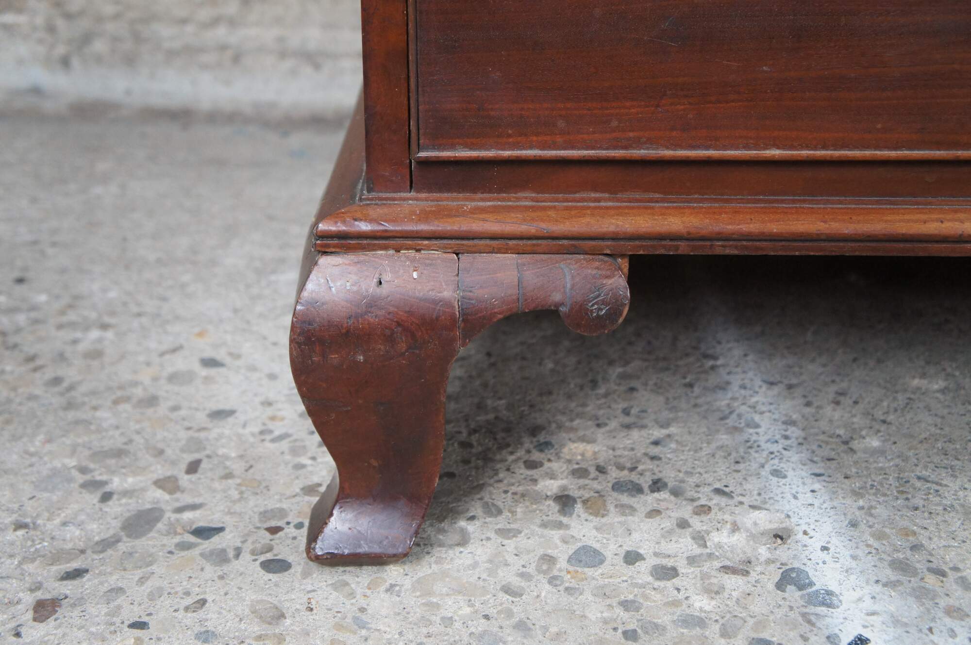Antique 19th Century Georgian mahogany chest of drawers. Features four drawers with a large cross banded upper drawer. Drawers are made from pine, hand dovetailed and include escutcheons. The case is supported by ogee bracket feet.