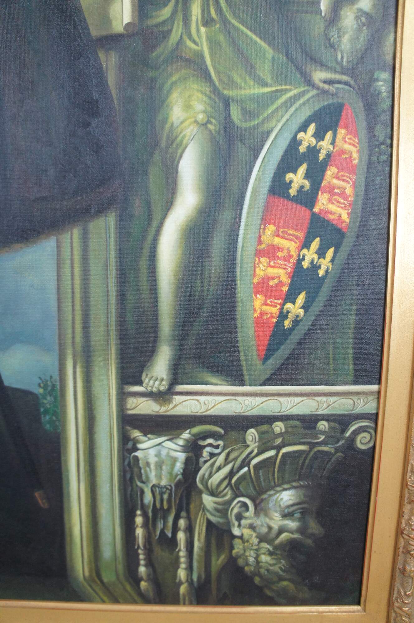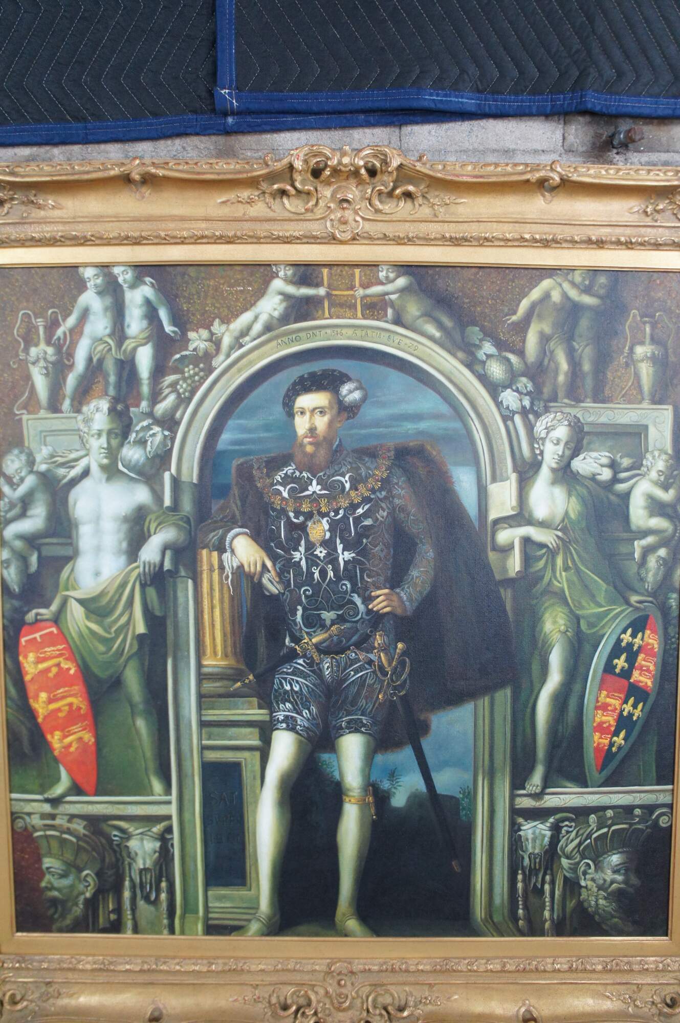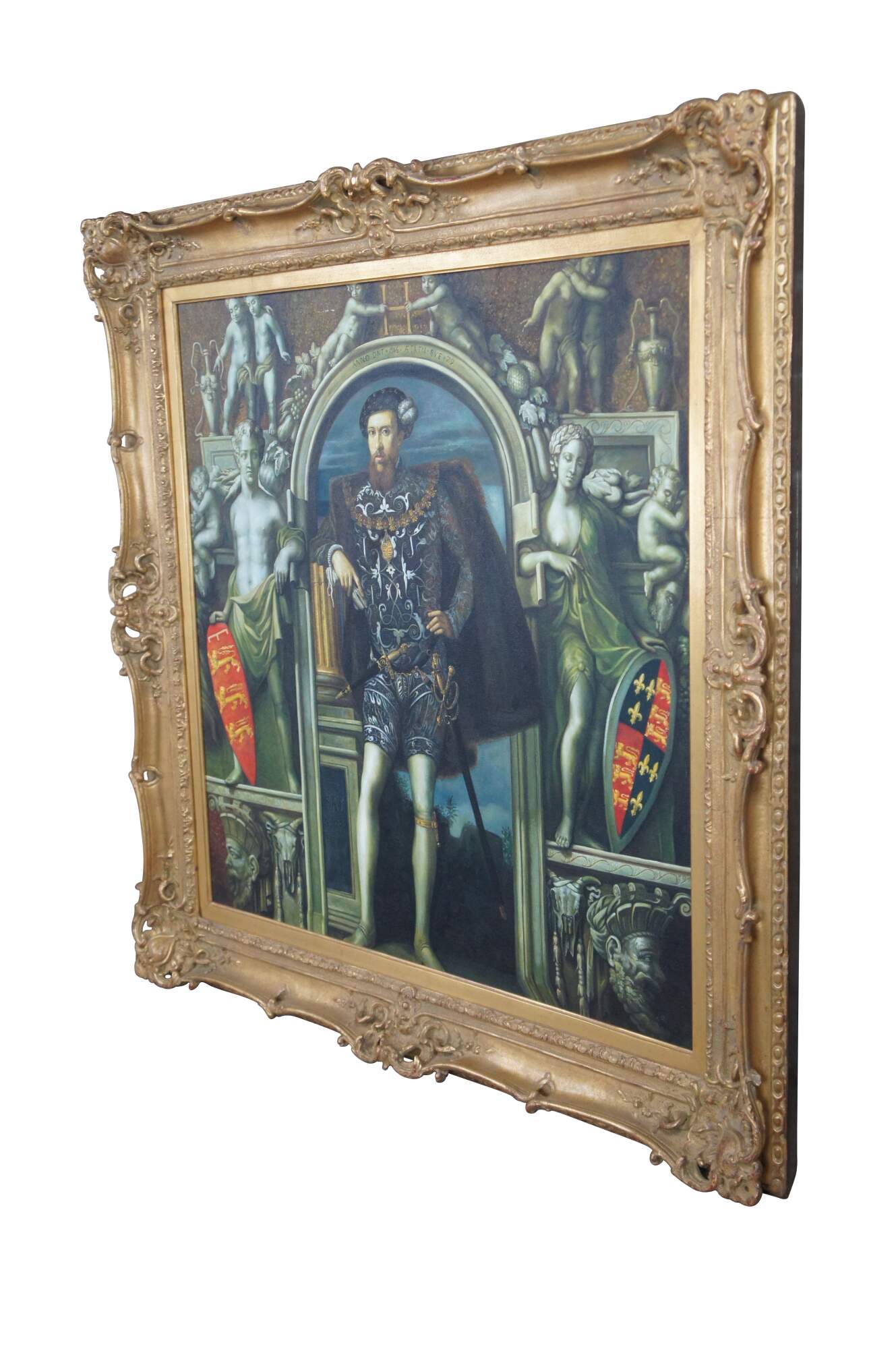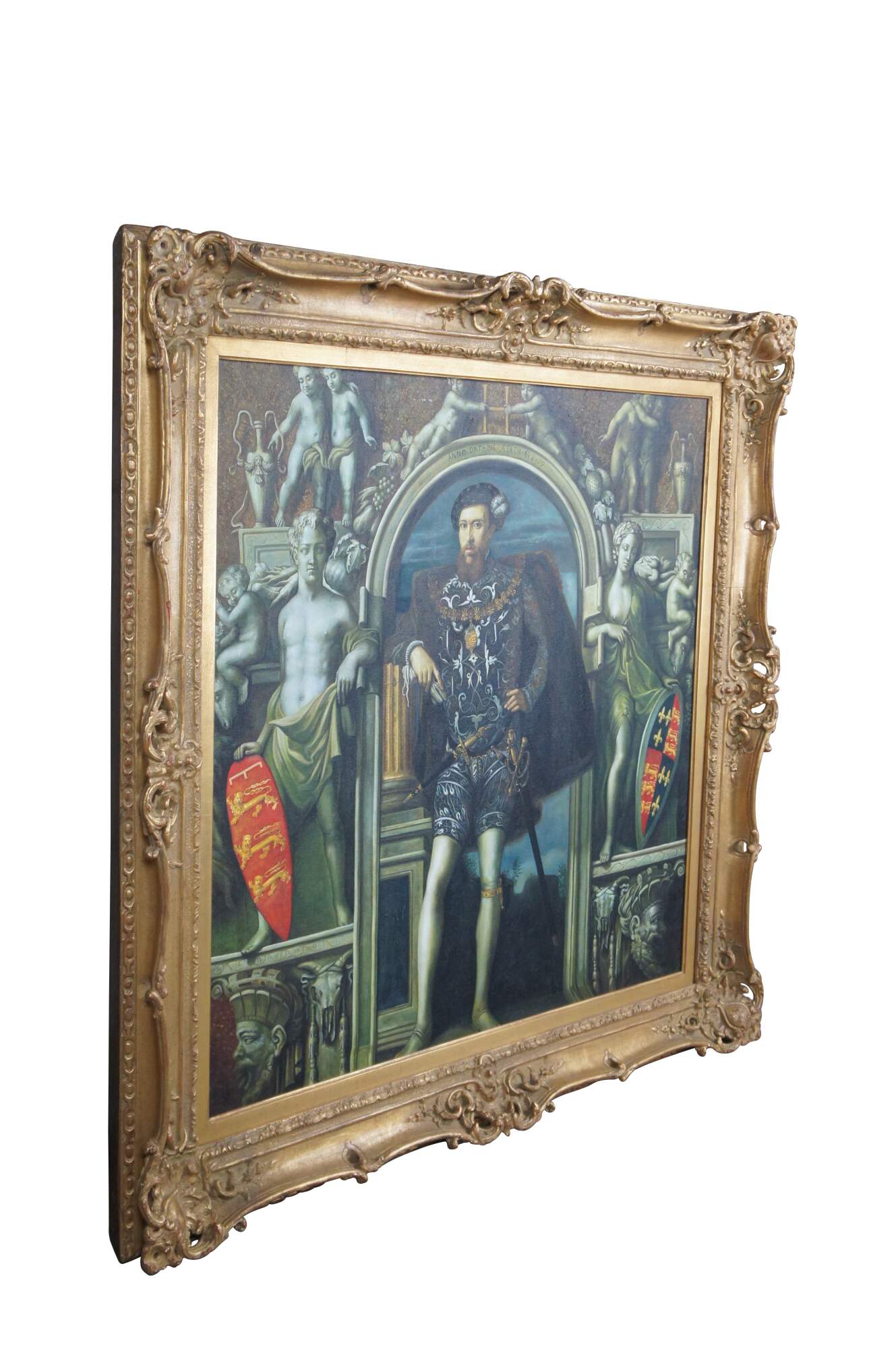 A reproduction oil painting of Henry Howard the Earl of Surrey at age 29 in 1546. The oginal attributed to Guillim Scrots (1537-1554). Framed in a baroque manner wtih serpentine edging and foliate relief.