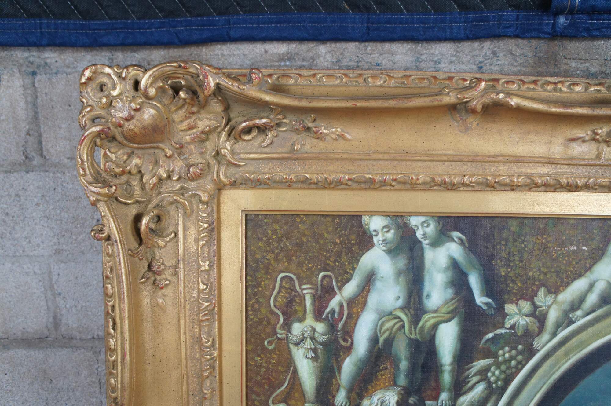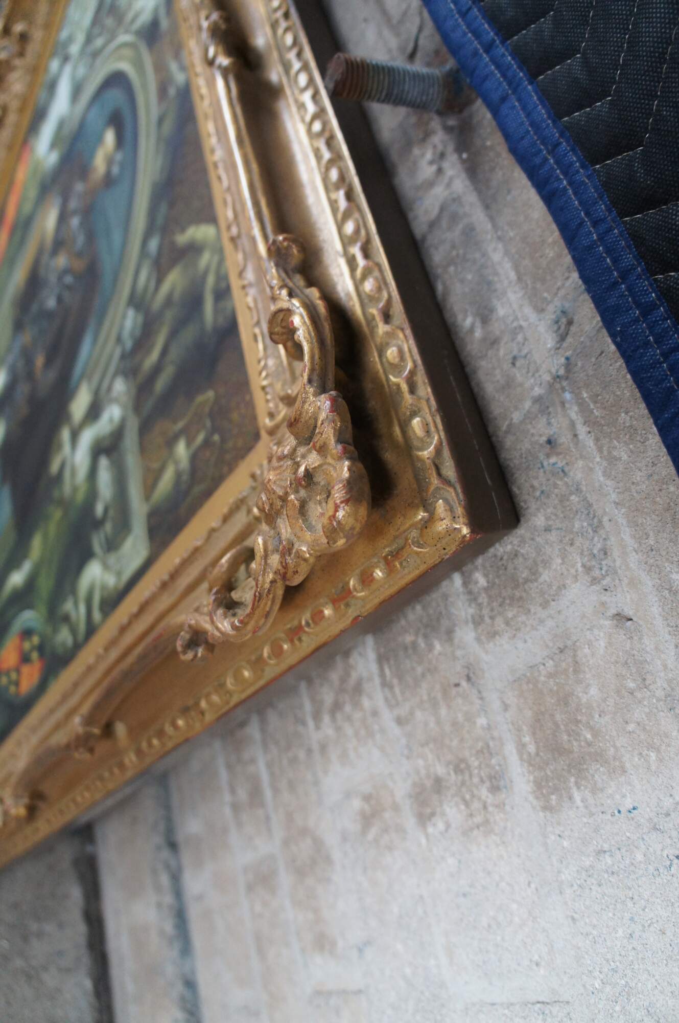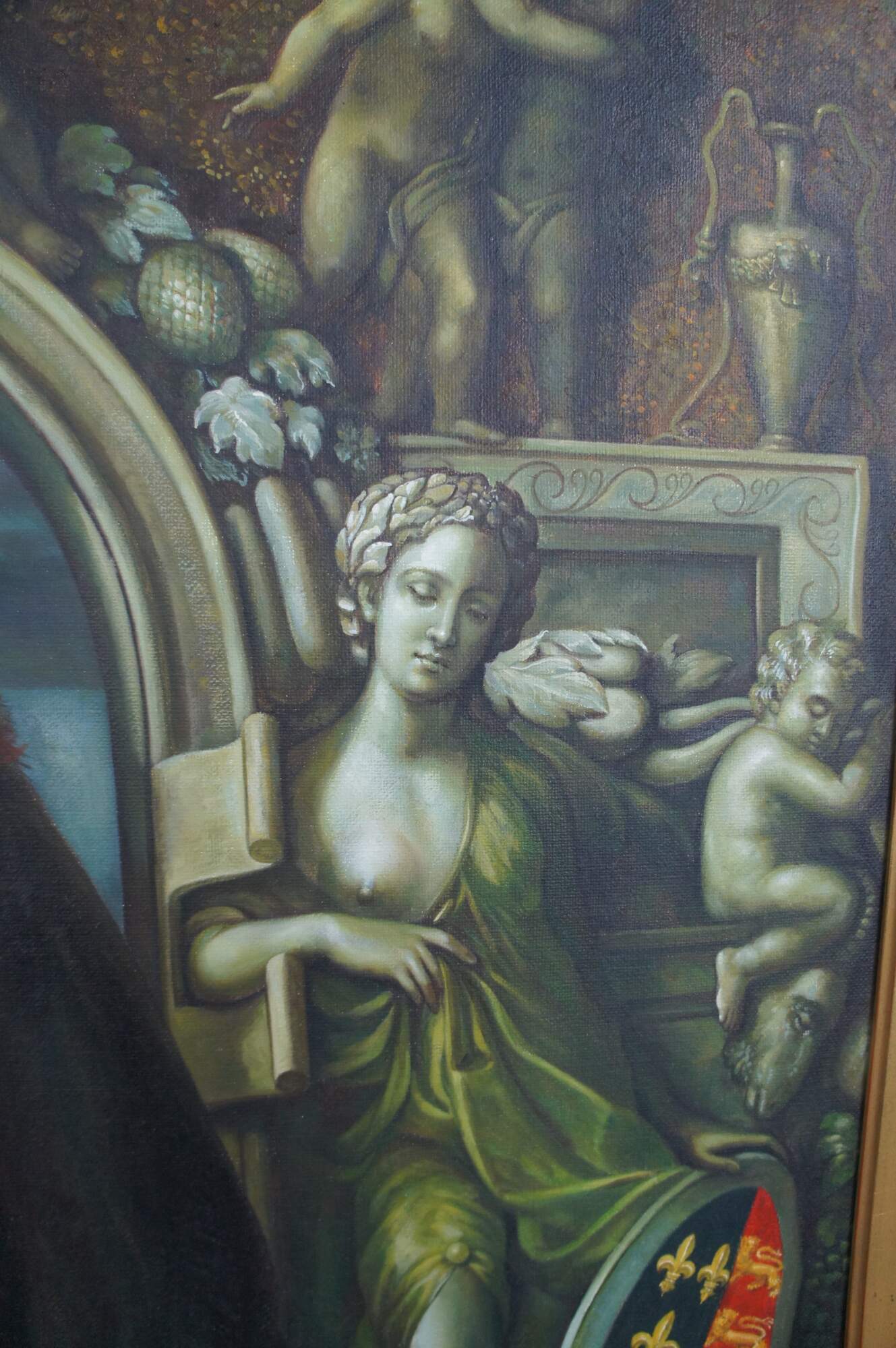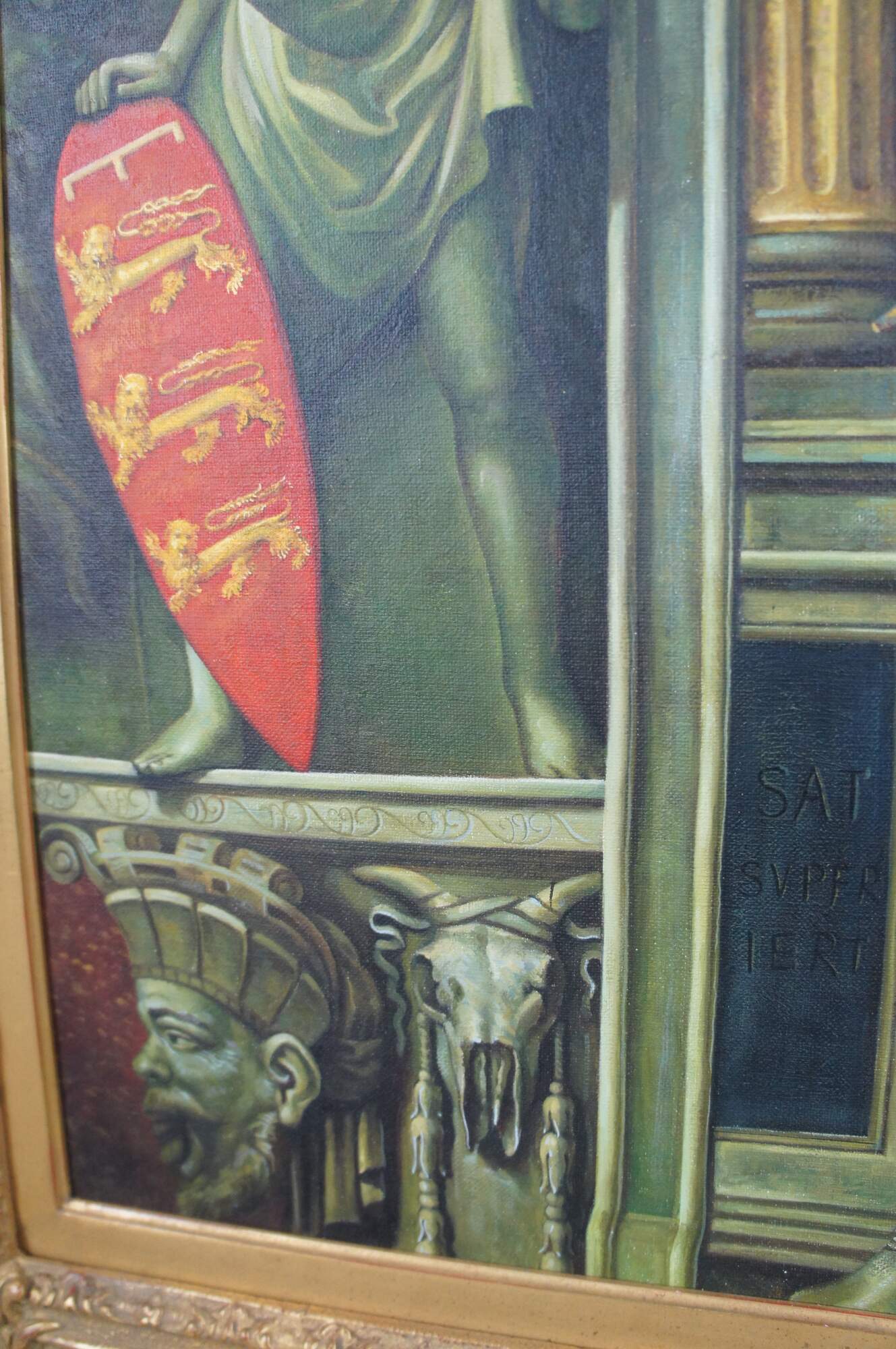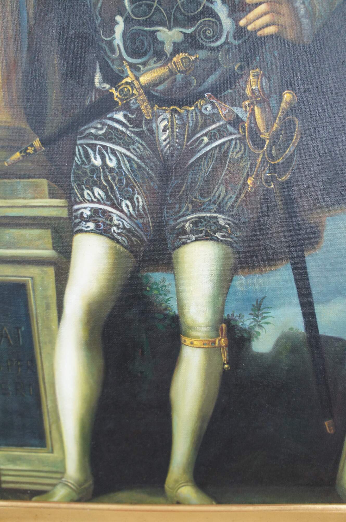 A reproduction oil painting of Henry Howard the Earl of Surrey at age 29 in 1546. The oginal attributed to Guillim Scrots (1537-1554). Framed in a baroque manner wtih serpentine edging and foliate relief.
