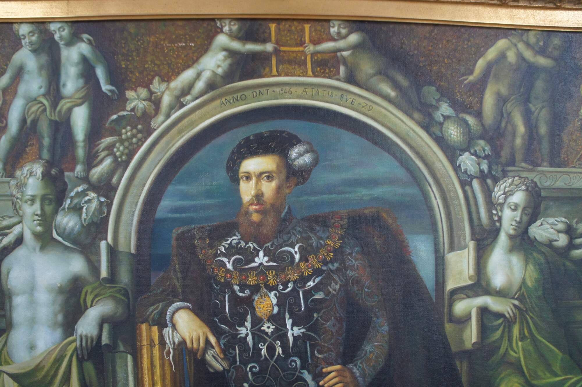 Surrey was the eldest son of the 3rd Duke of Norfolk, the premier nobleman in England. He enjoyed success as a soldier and a poet at the court of Henry VIII but fell from favour after defeat at St. Étienne in France on 7 January 1546. The sitter is identified in the portrait by the ‘H’ held by putti, and the inscription of his age and the date: ‘ANNO DNI . 1546 . AETATIS . SVE . 29’ within the arch. The motto ‘SAT SUPER EST’ (Enough survives) is inscribed on the pillar.