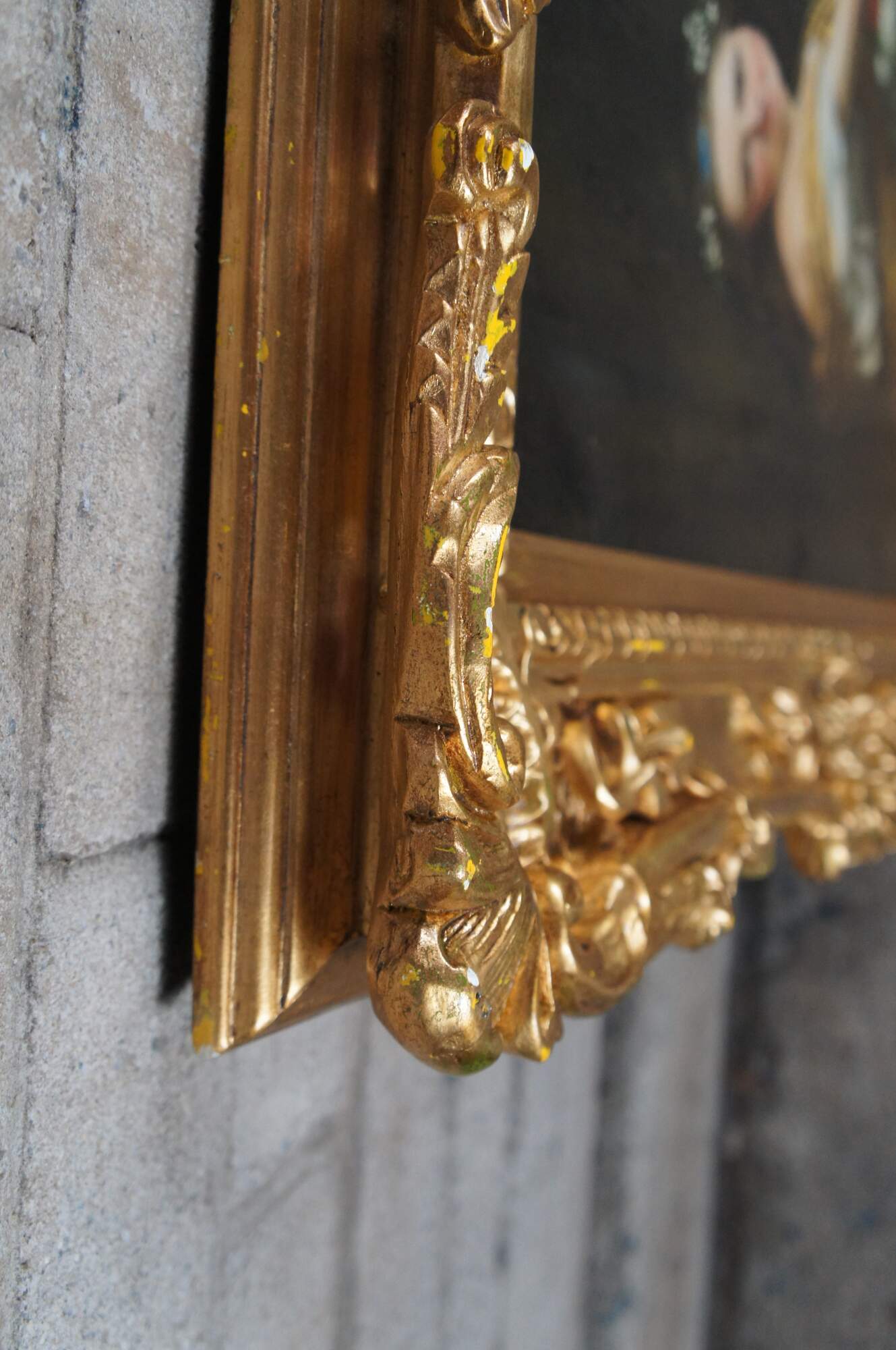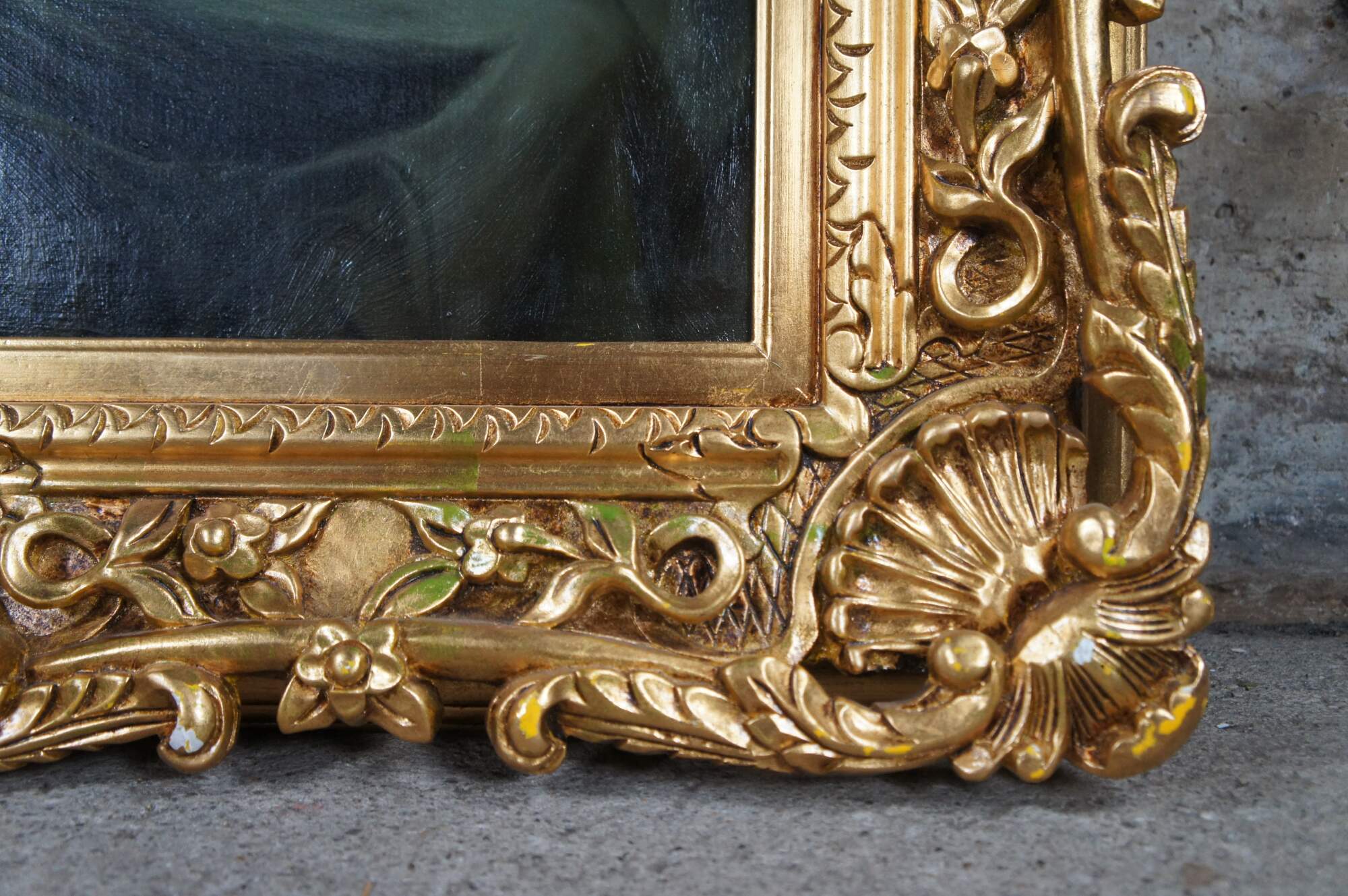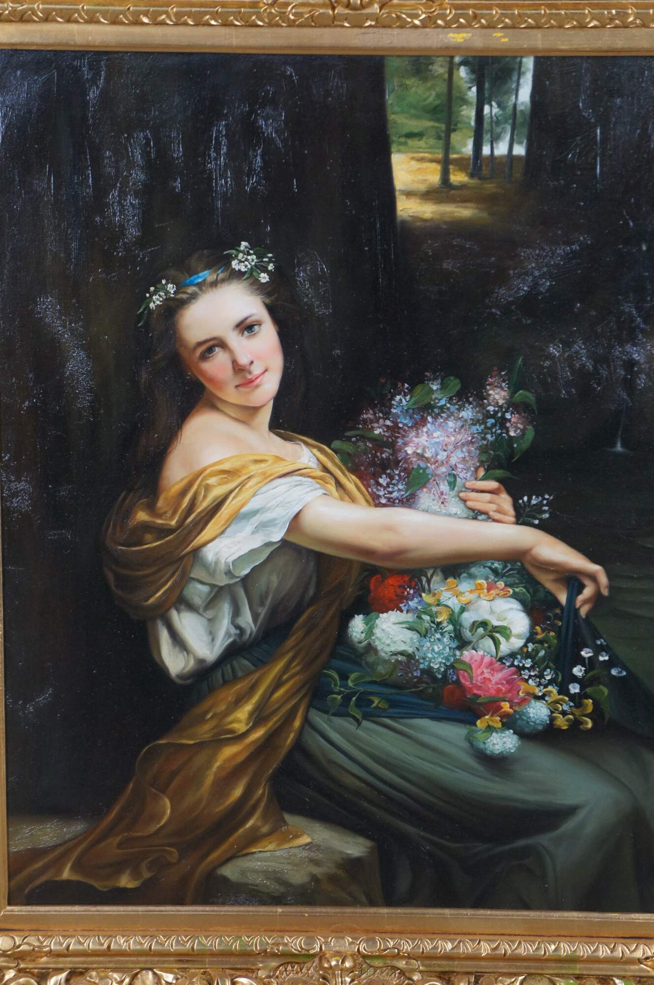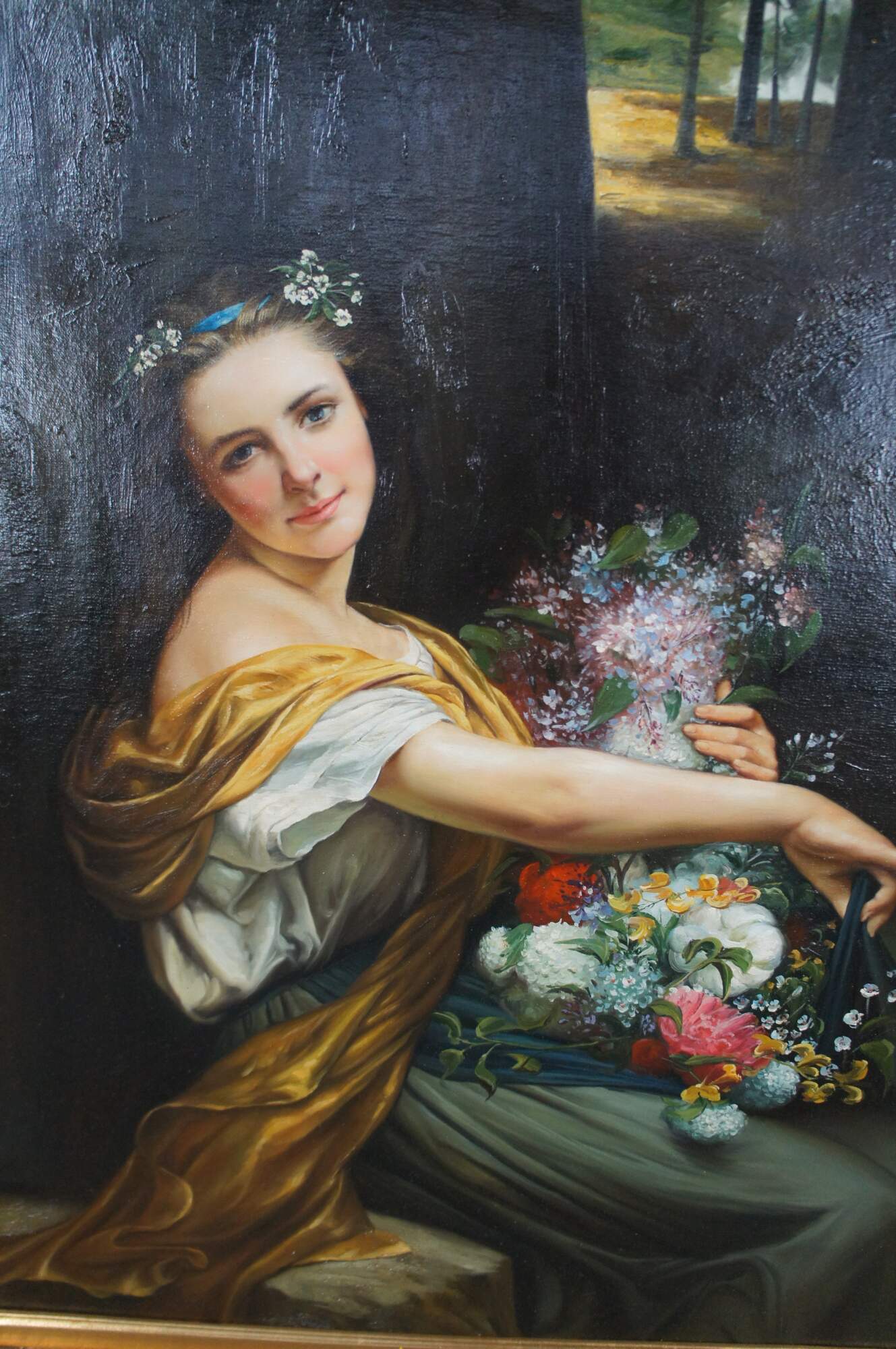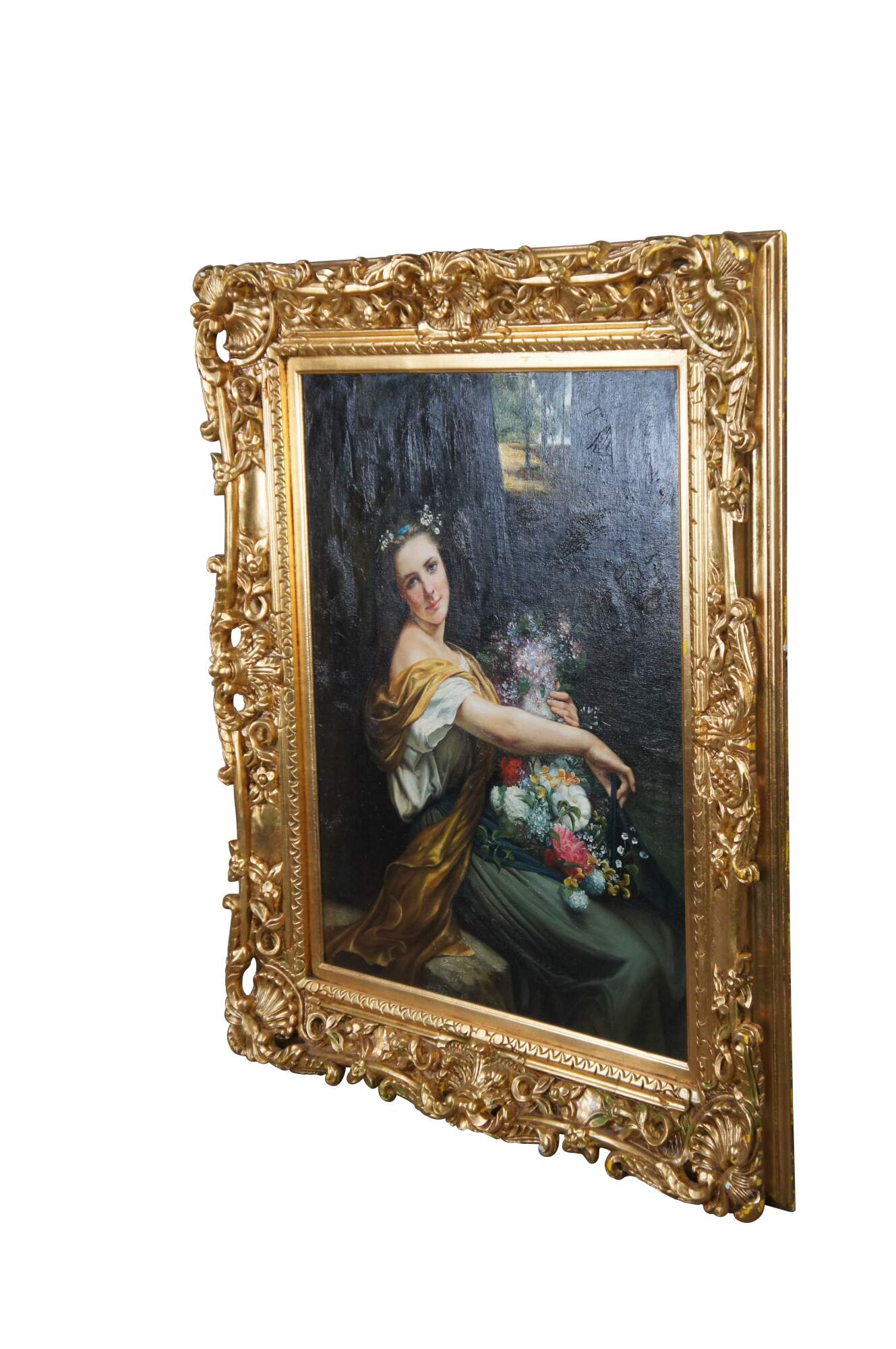 A large oil painting on canvas featuring a woman dressed in silk holding a large bouquet. The painting is set in a woodland landscape with trees in the background. Framed in Victorian manner with foliate detail and scalloping.