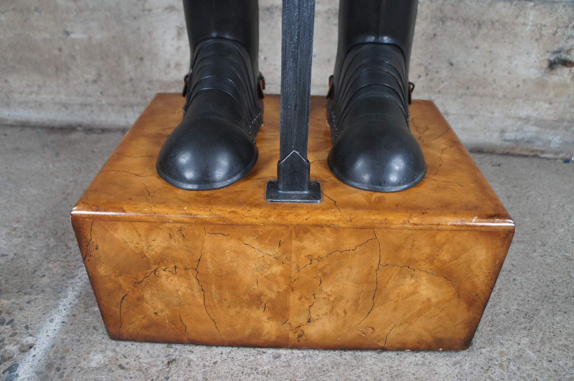 A hammered bronze suit of armour, with a crested helmet and visor, with chain mail beneath the suit, holding a broad sword and mounted on a weathered mahogany plinth base. A stately sculpture / statue that will display well in nay setting. Packard from Theodore Alexander mounted to the back.