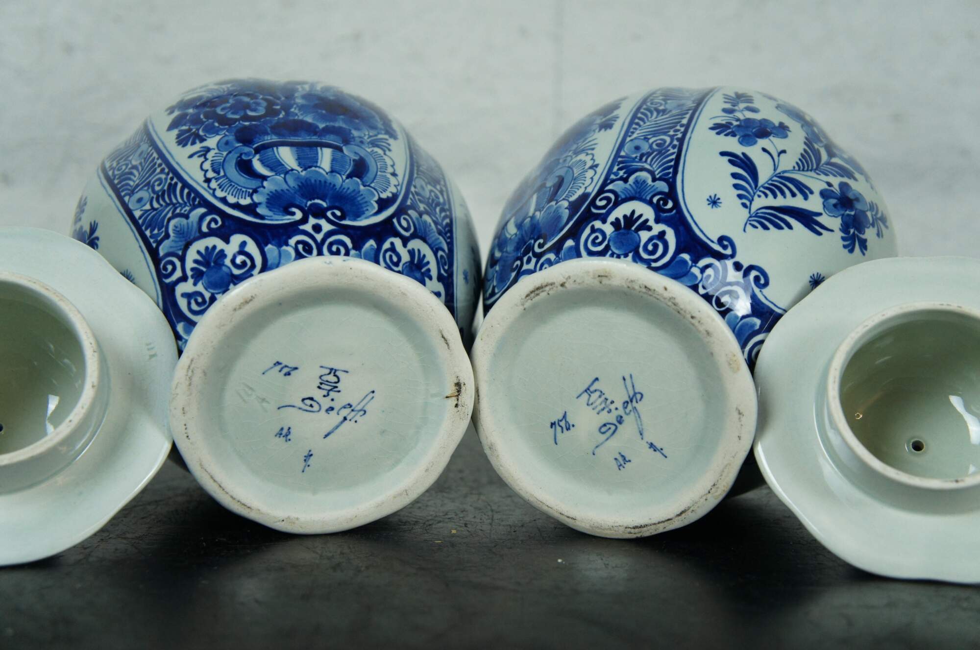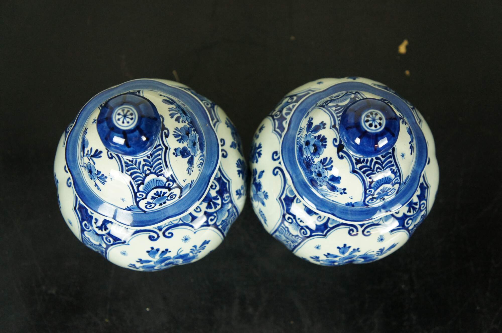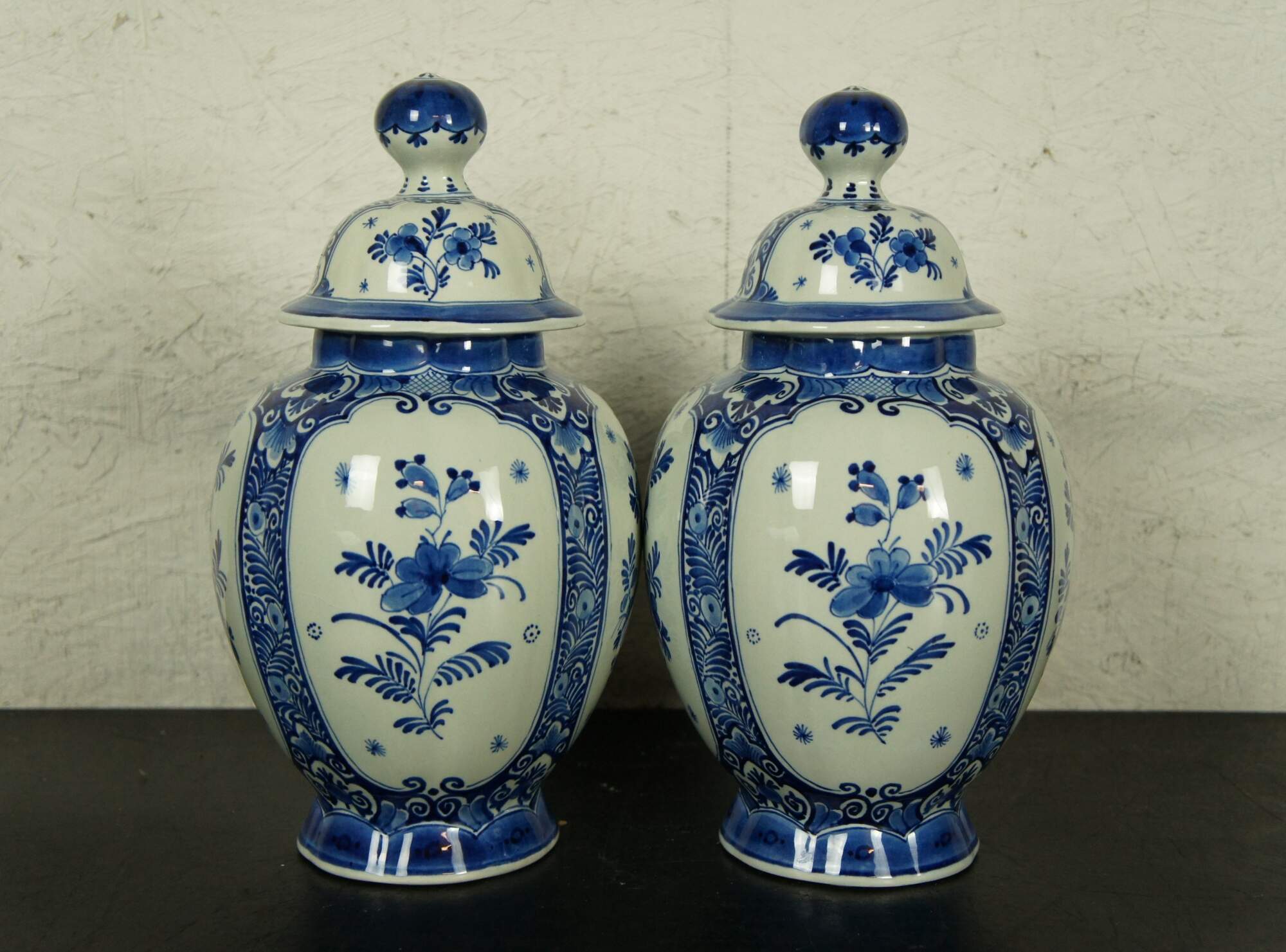 Pair of antique Royal Delft pottery blue and white porcelain mantel urns. Traditional temple urn / lobed pumpkin-like shape, scalloped rim and large round finials on lids. Hand decorated with various floral motifs in blue. Date Code: AR (1922). Artists initials.