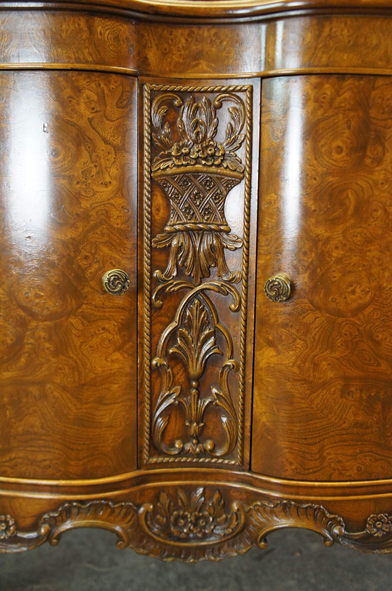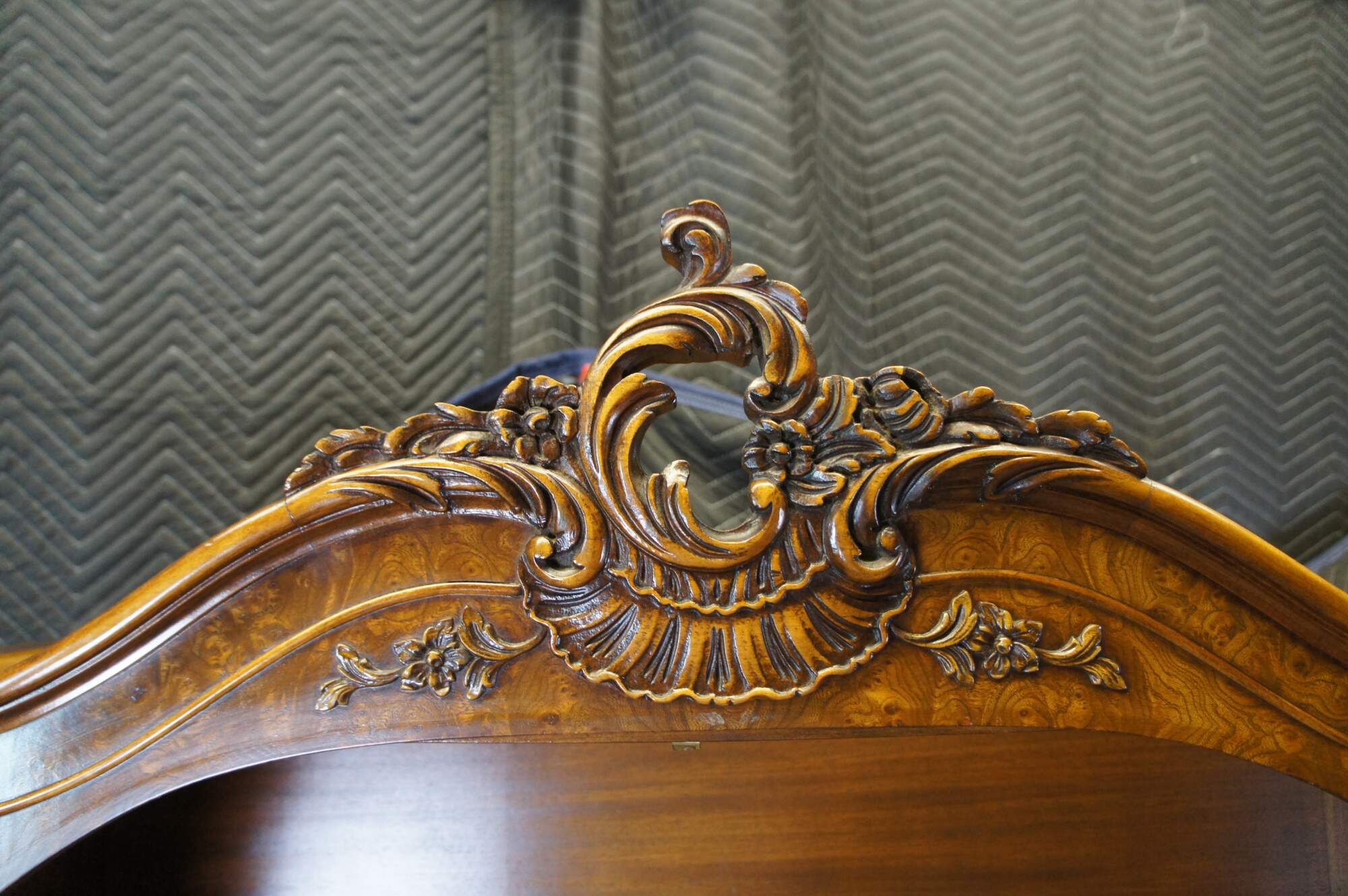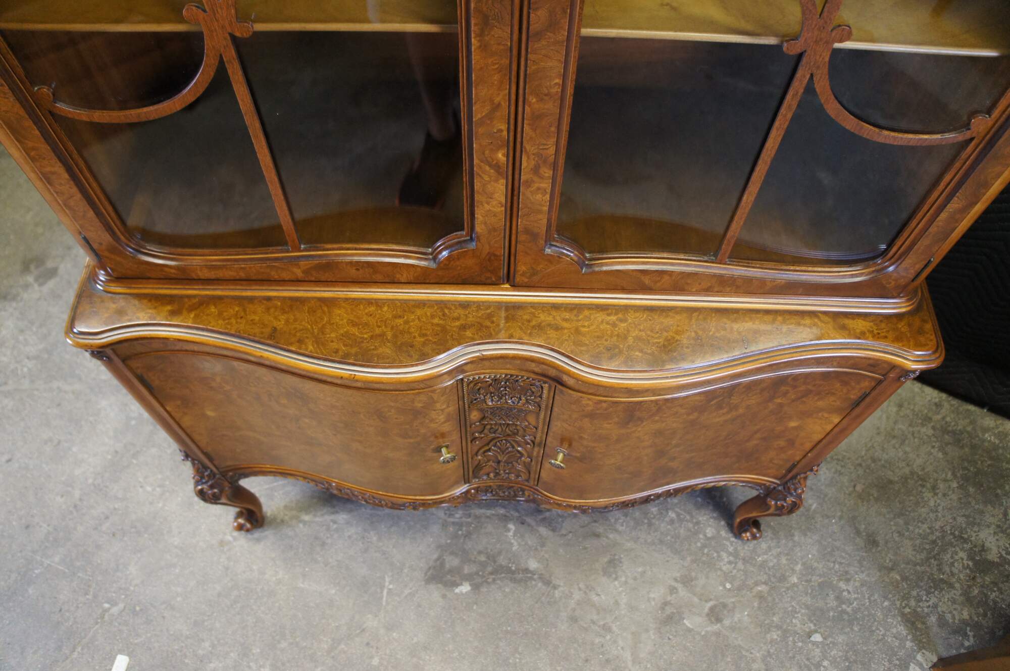 Antique Batesville Cabinet Co French Provincial Louis XV china curio cabinet / cupboard. Made of Carpathian cluster elm burl featuring upper cabinet with serpentine floral cartouch crown and fretwork doors over lower cabinet with carved acanthus design, all supported by cabriole legs. 645.